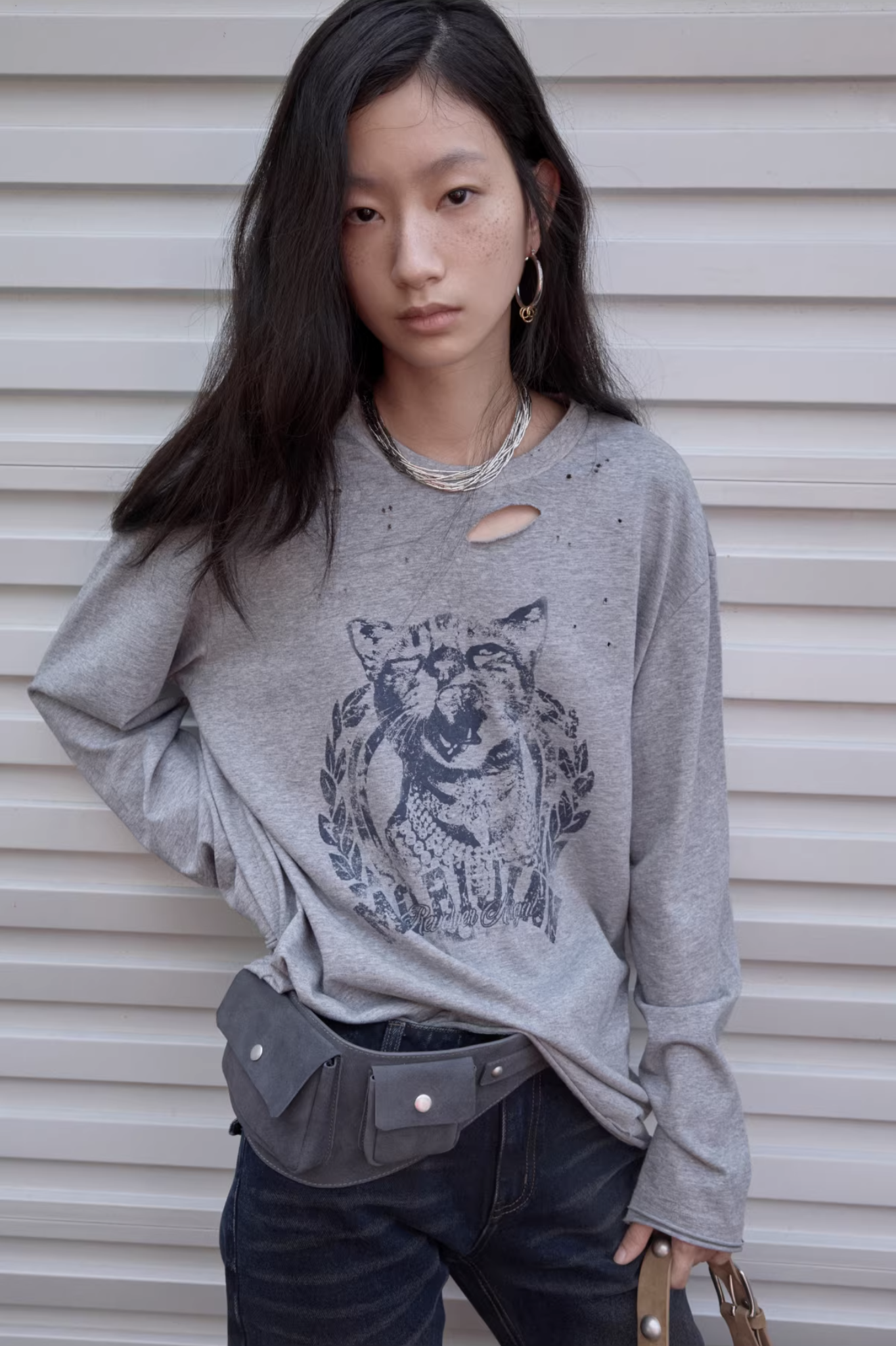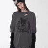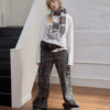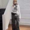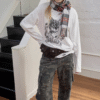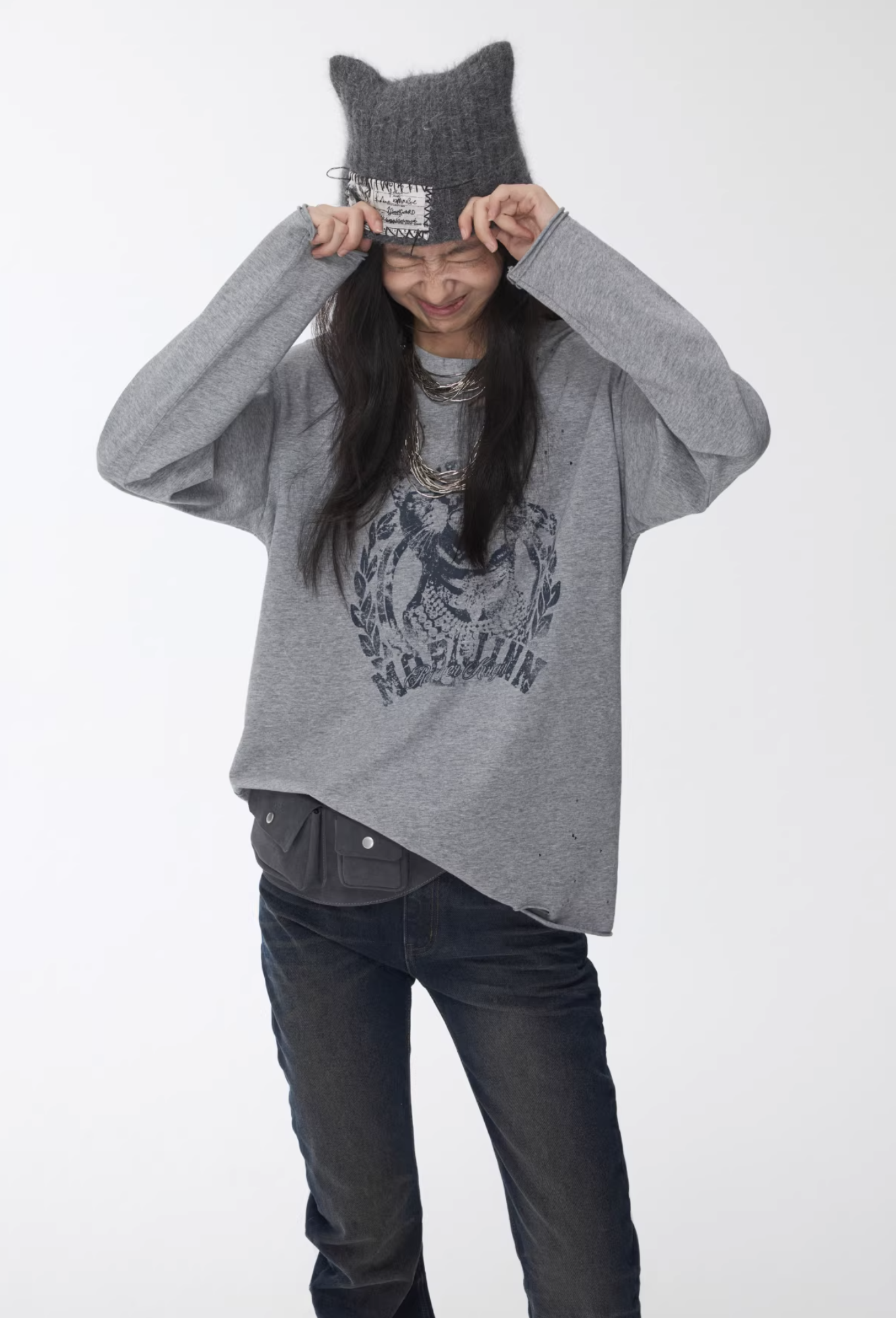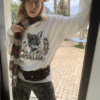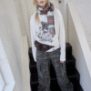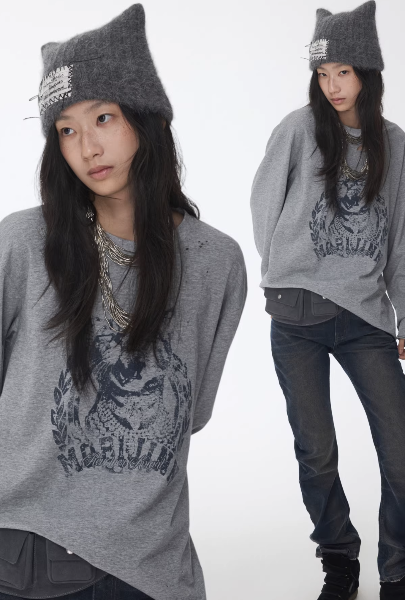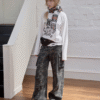 ✰ This relaxed-fit long-sleeve T-shirt features a slightly dropped shoulder design for excellent drape and comfort. The piece uses a perforated distressing technique to create a worn-in, vintage effect, complemented by playful cat-and-dog themed prints that add a touch of street-style charm. The double-layer raw-edge treatment at the hem and cuffs enhances its textured, layered aesthetic. Washed for a naturally faded finish, the tee delivers a retro, lived-in appeal. Crafted from 220g pre-washed Korean cotton jersey, it offers a soft yet resilient handfeel with superior breathability — balancing quality craftsmanship and effortless daily wearability.