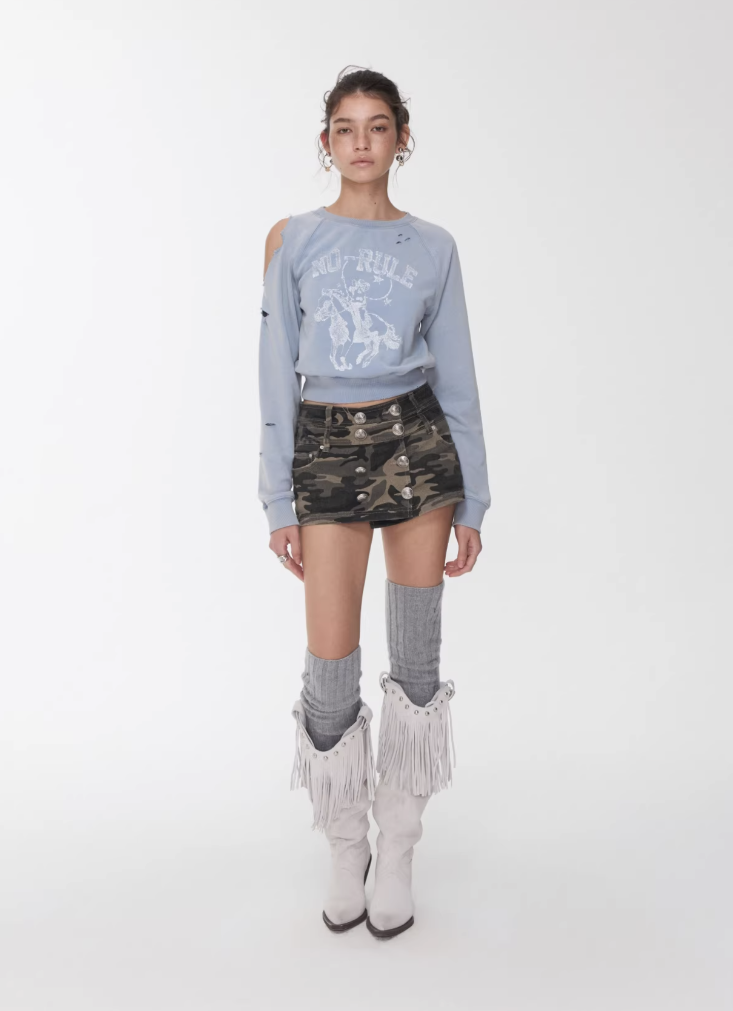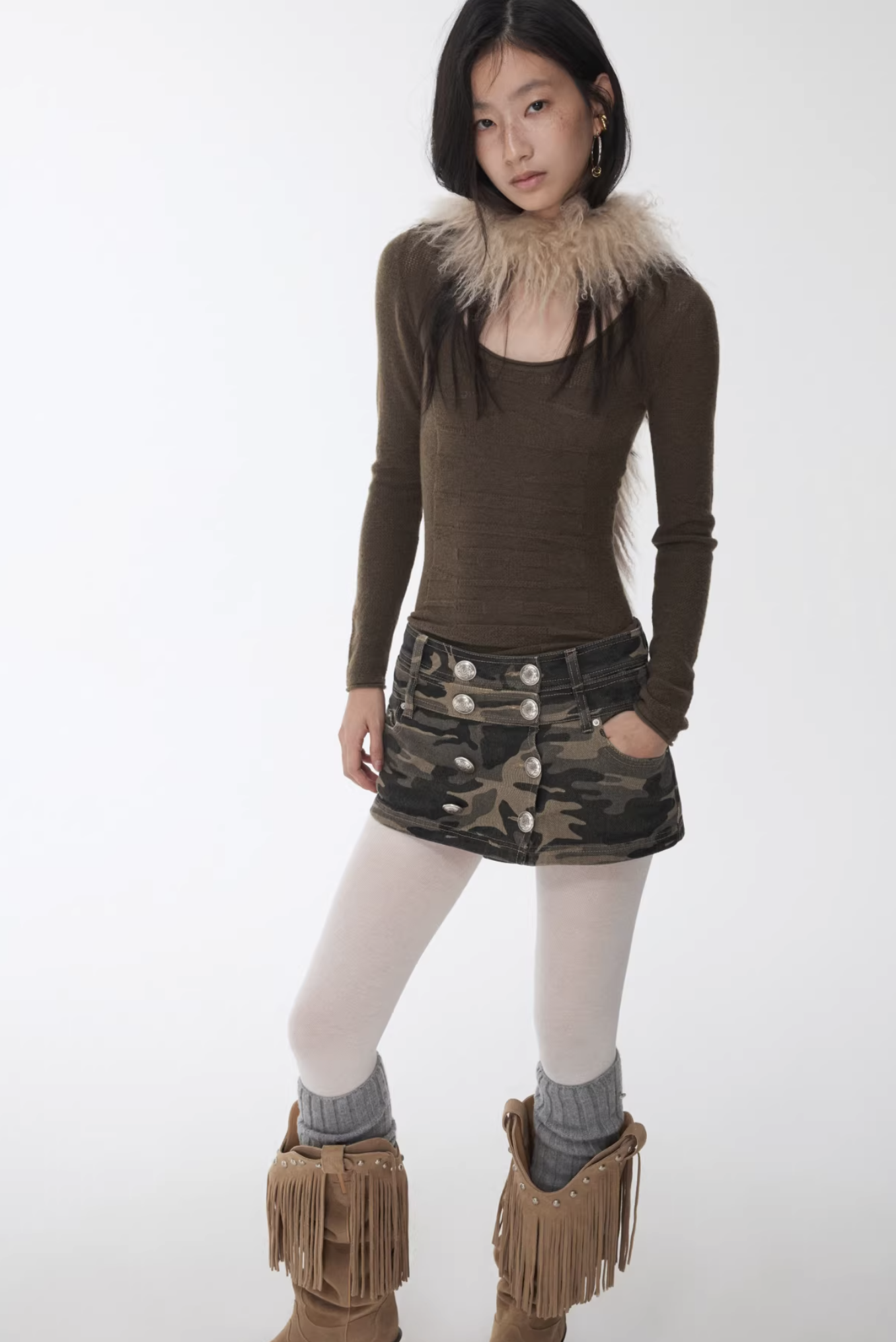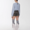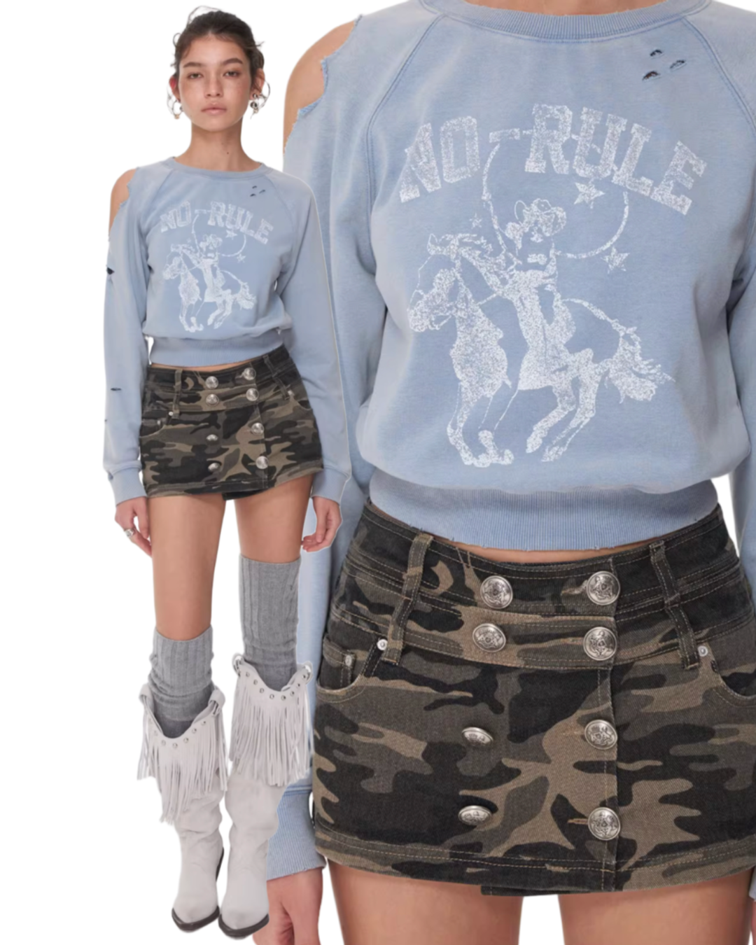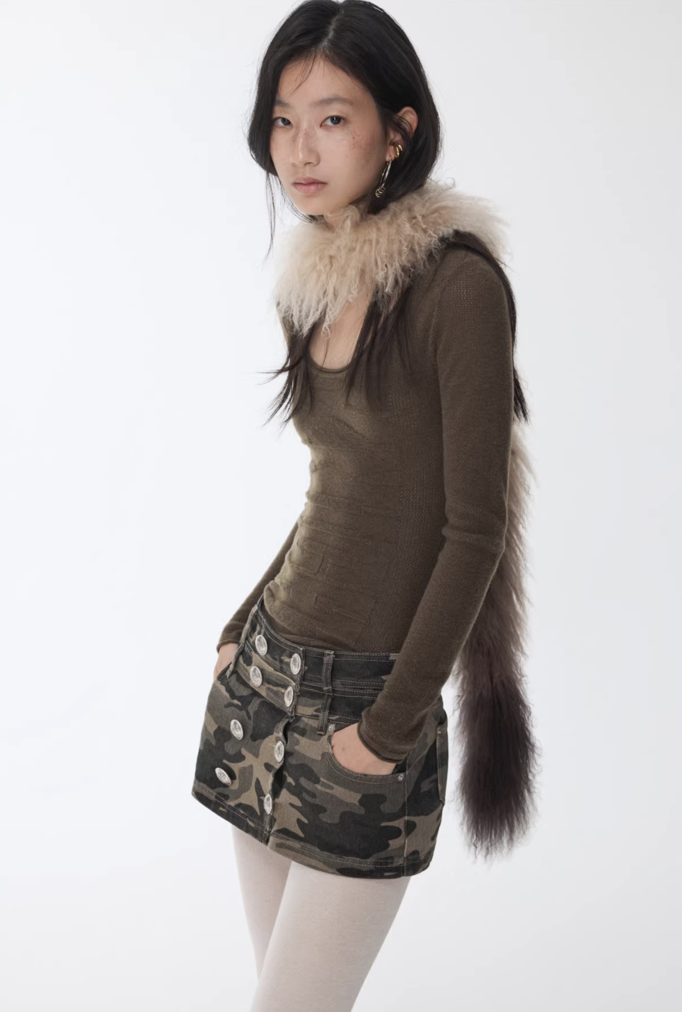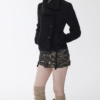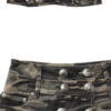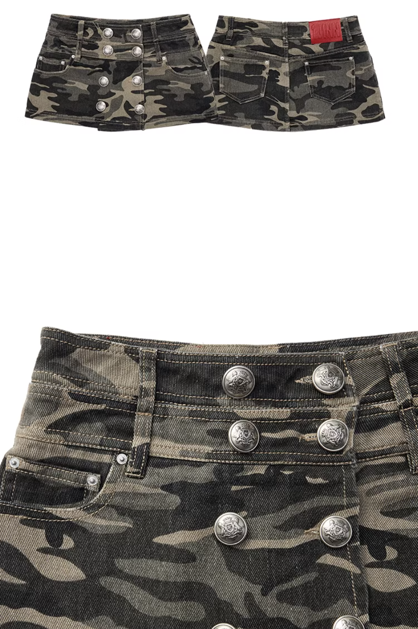 ✰ A mini camouflage low-rise skort with a structured A-line silhouette, wrap-style front panel, accented by custom silver-tone buttons double-row buttons at the waistband and vertical decorative buttons, belt loops, and classic pocket detailing, giving a bold Y2K military-inspired streetwear vibe.