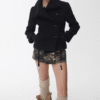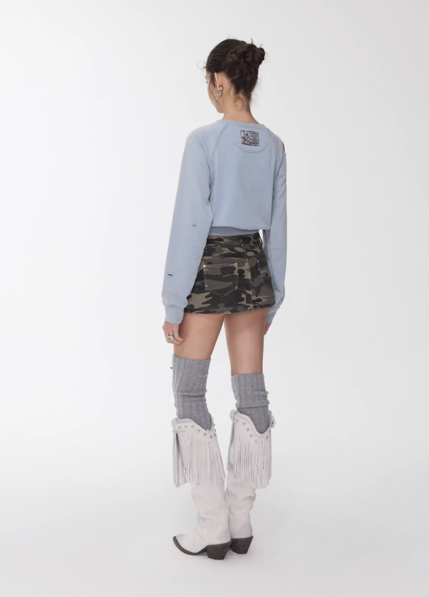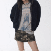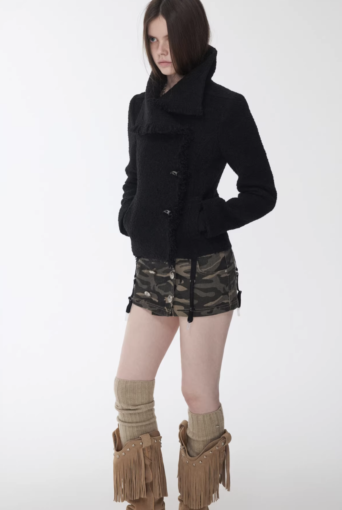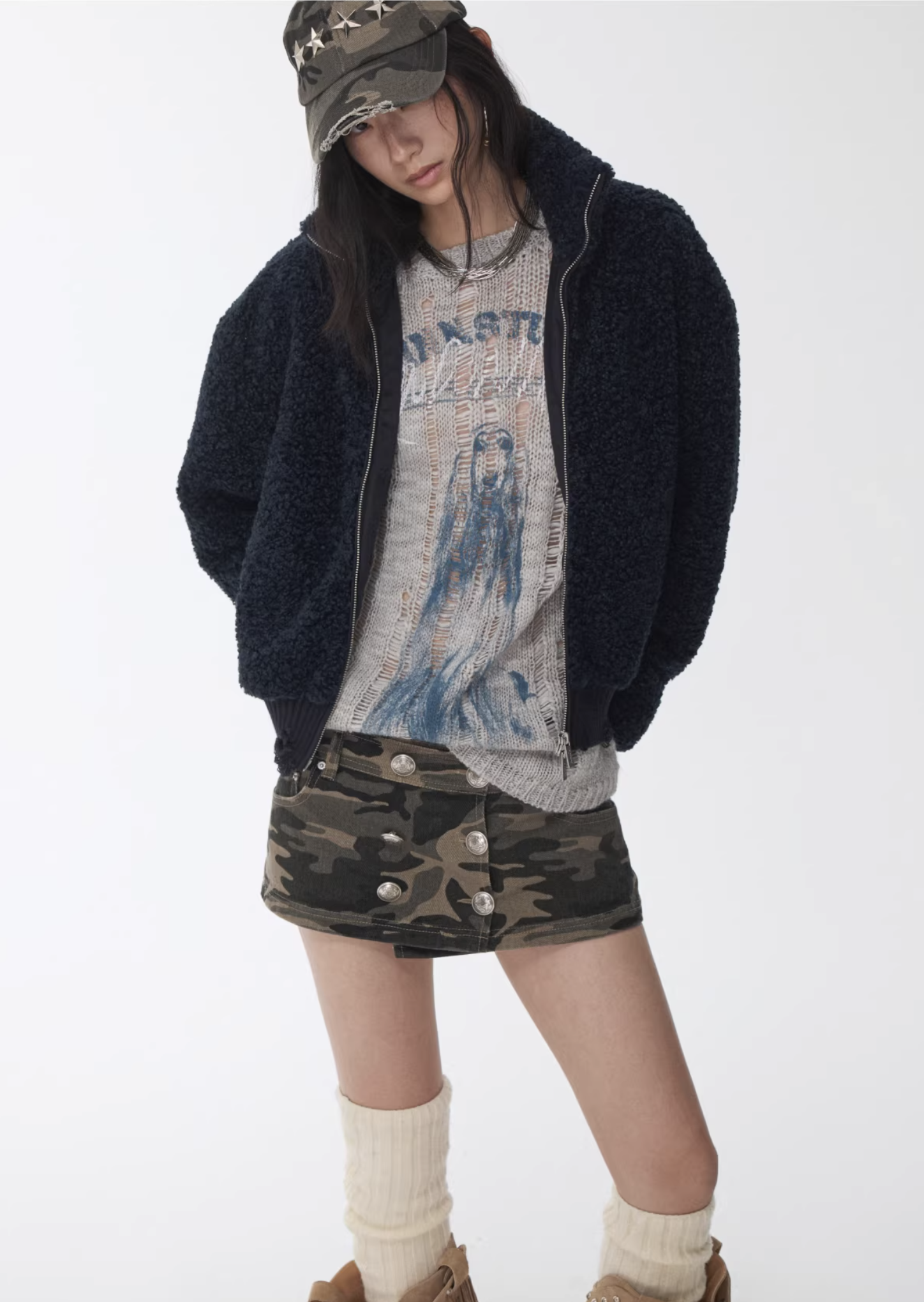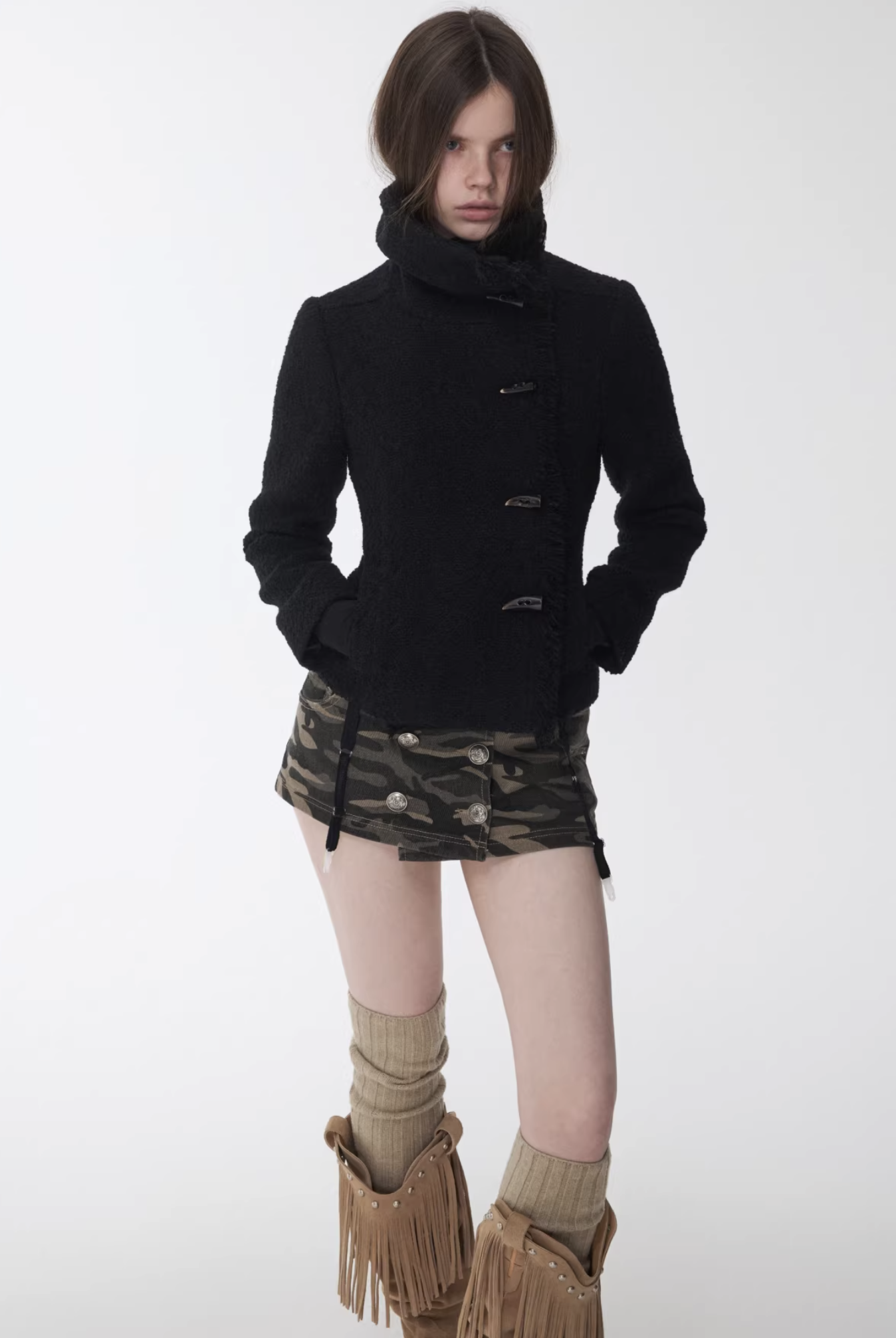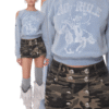 ✰ A mini camouflage low-rise skort with a structured A-line silhouette, wrap-style front panel, accented by custom silver-tone buttons double-row buttons at the waistband and vertical decorative buttons, belt loops, and classic pocket detailing, giving a bold Y2K military-inspired streetwear vibe.
