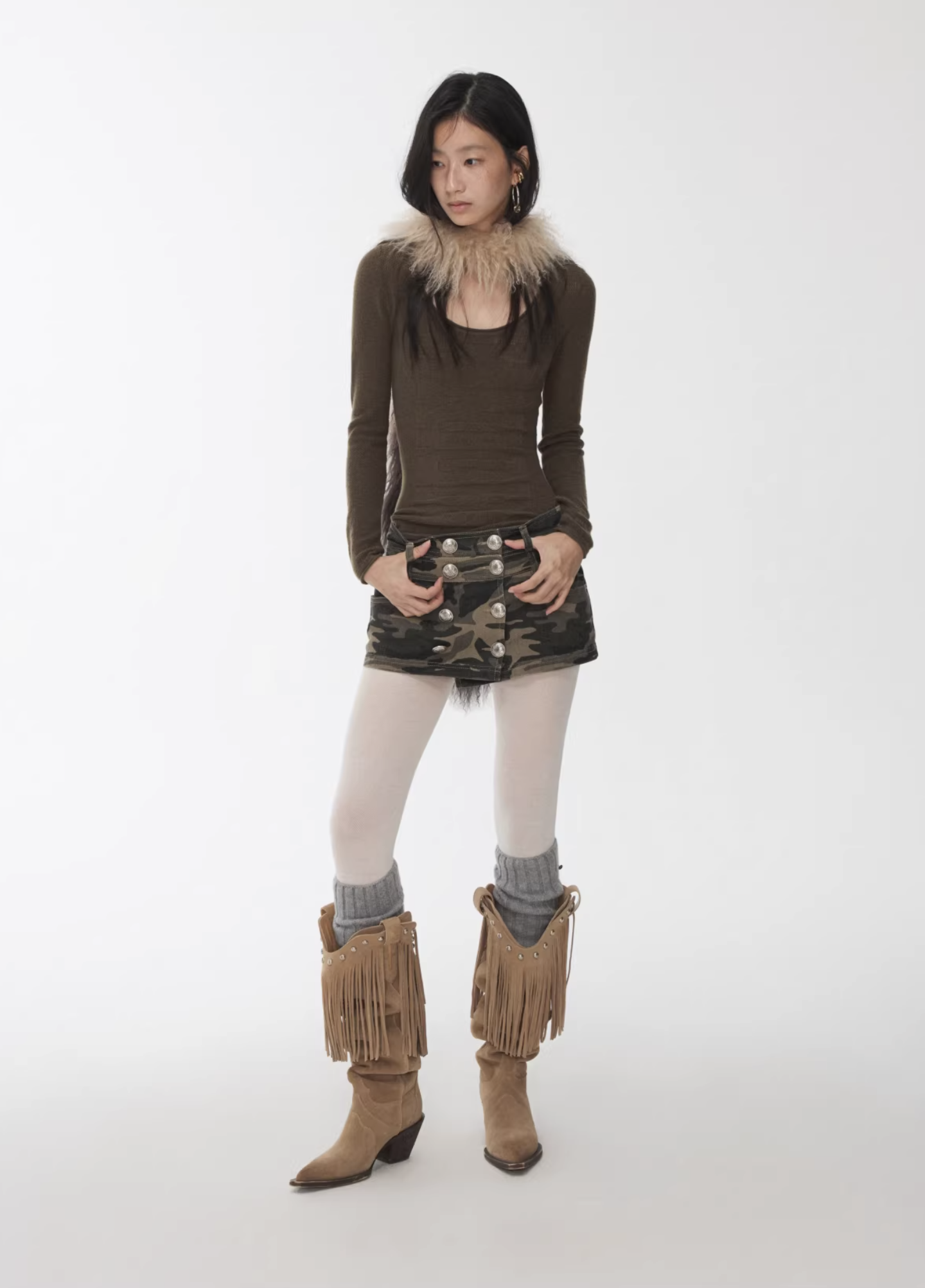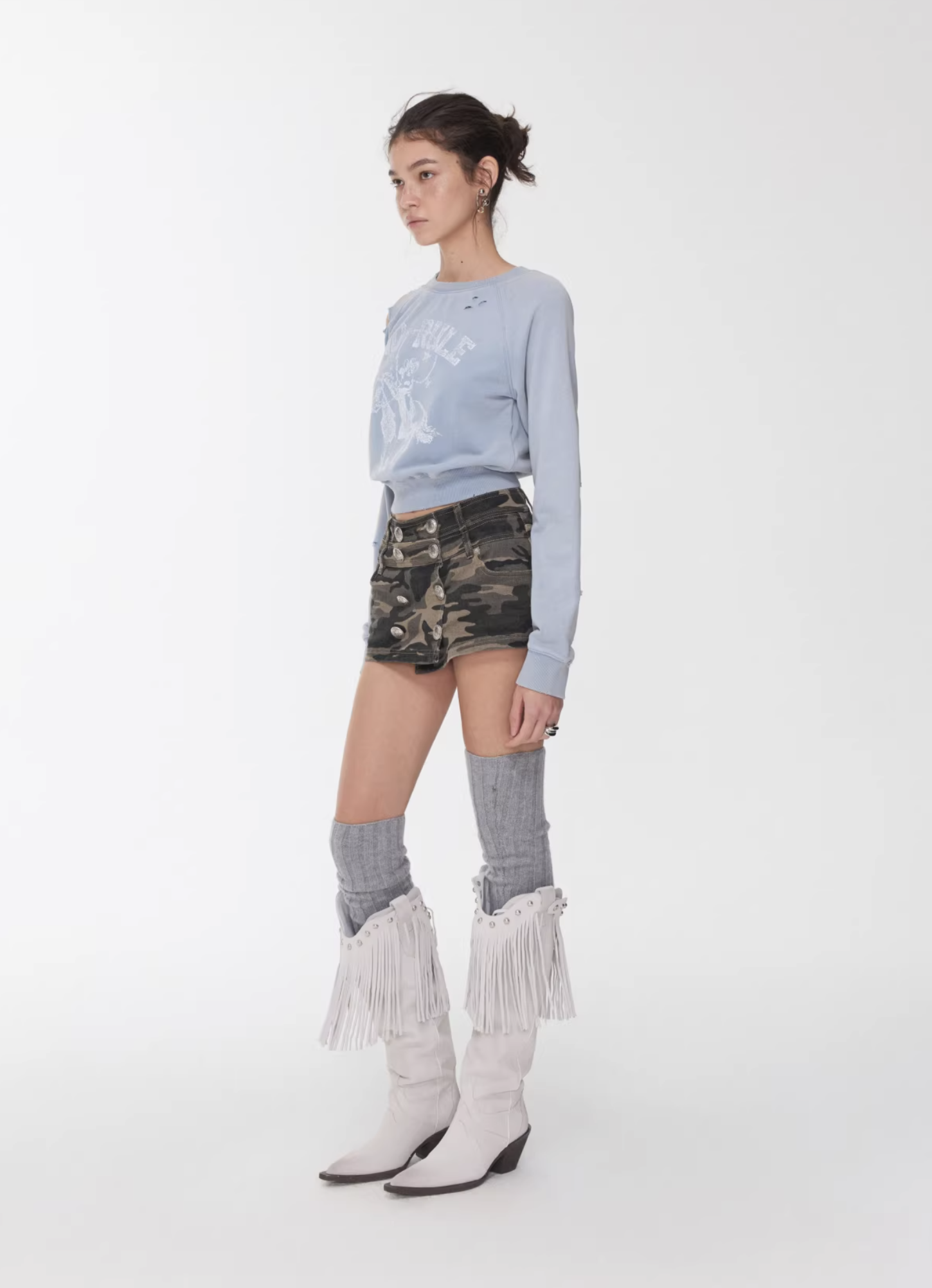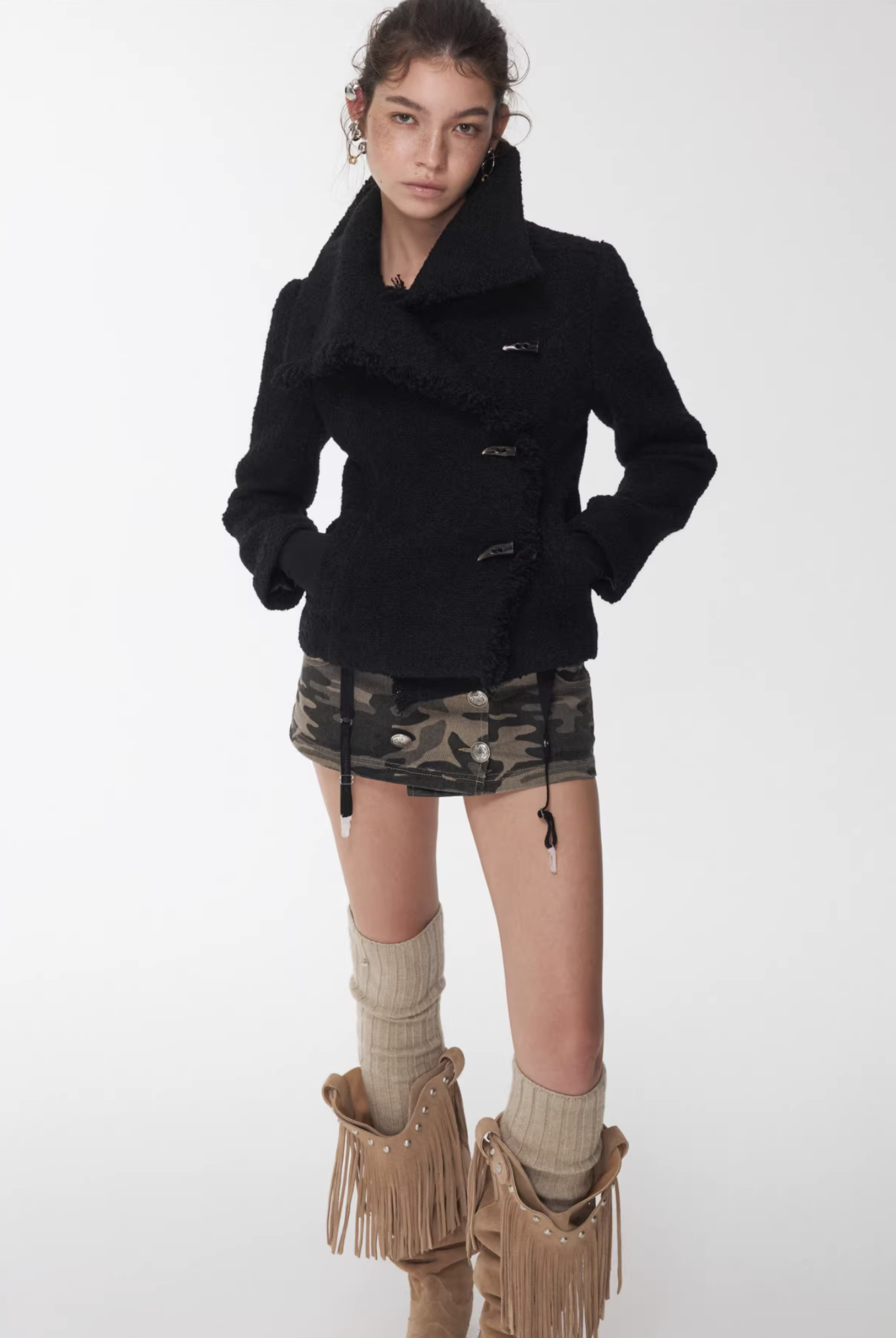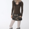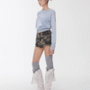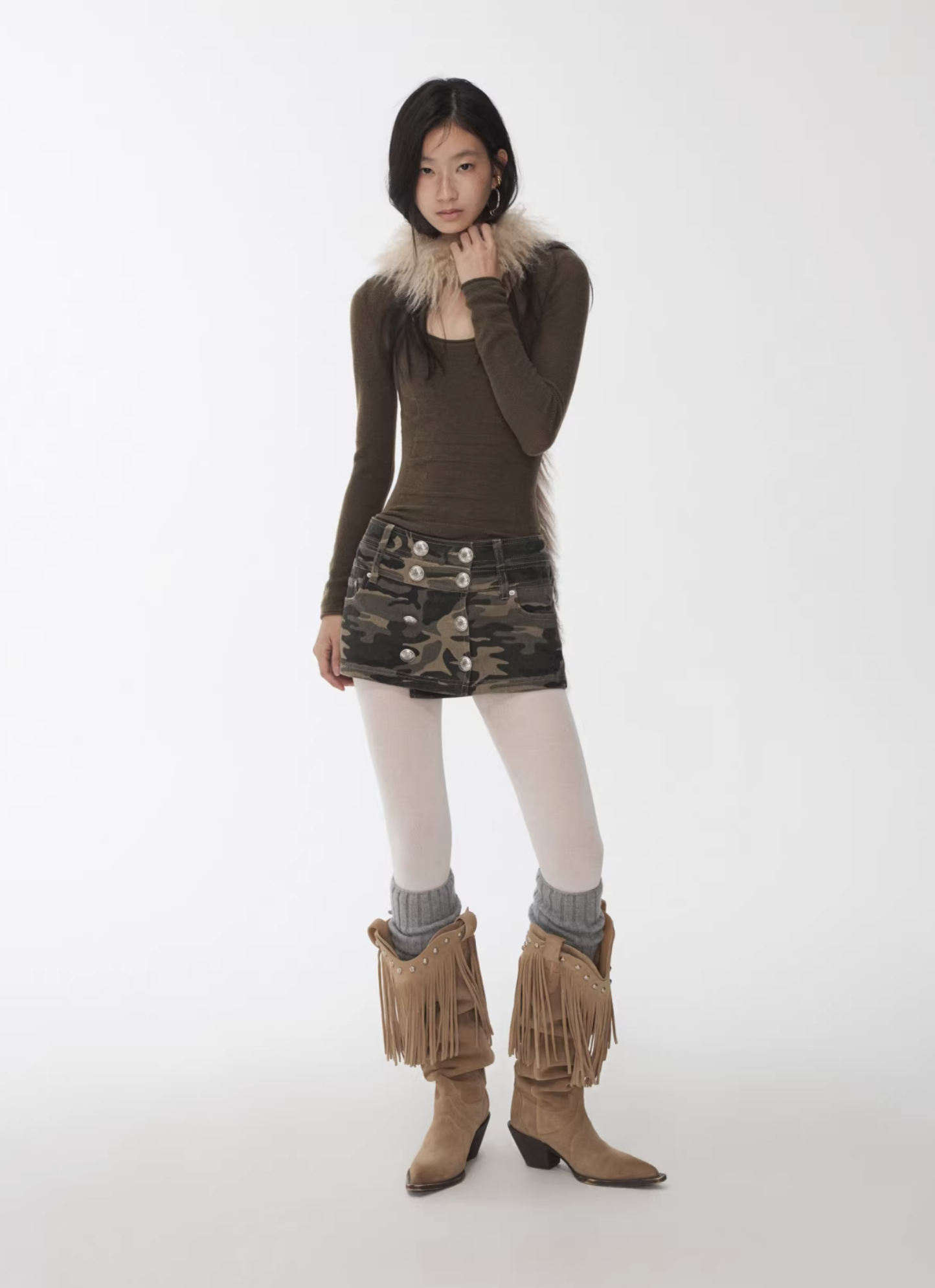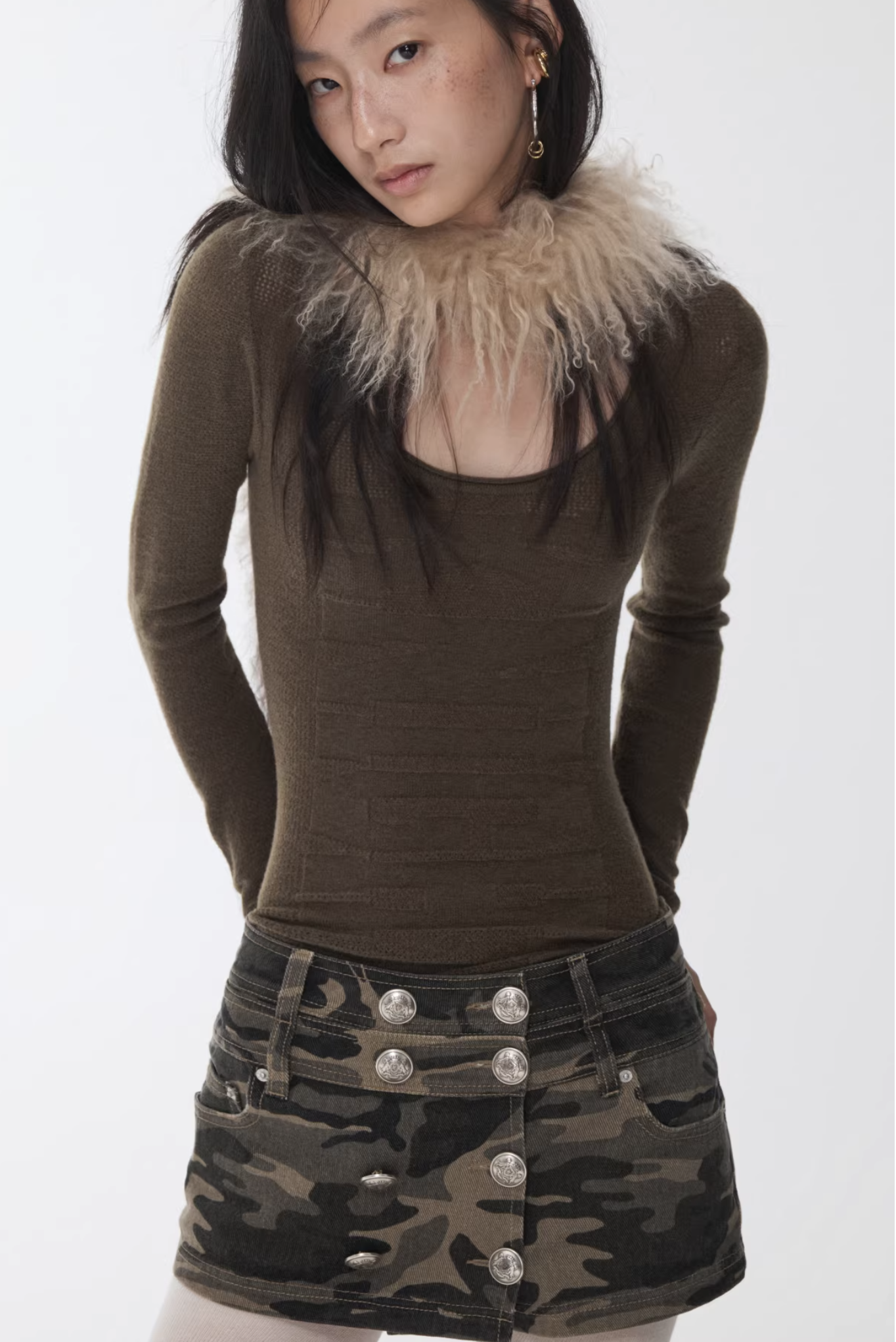 ✰ A mini camouflage low-rise skort with a structured A-line silhouette, wrap-style front panel, accented by custom silver-tone buttons double-row buttons at the waistband and vertical decorative buttons, belt loops, and classic pocket detailing, giving a bold Y2K military-inspired streetwear vibe.