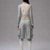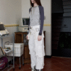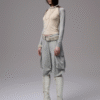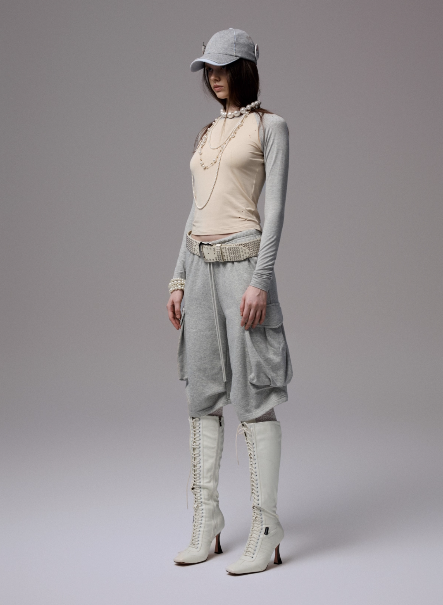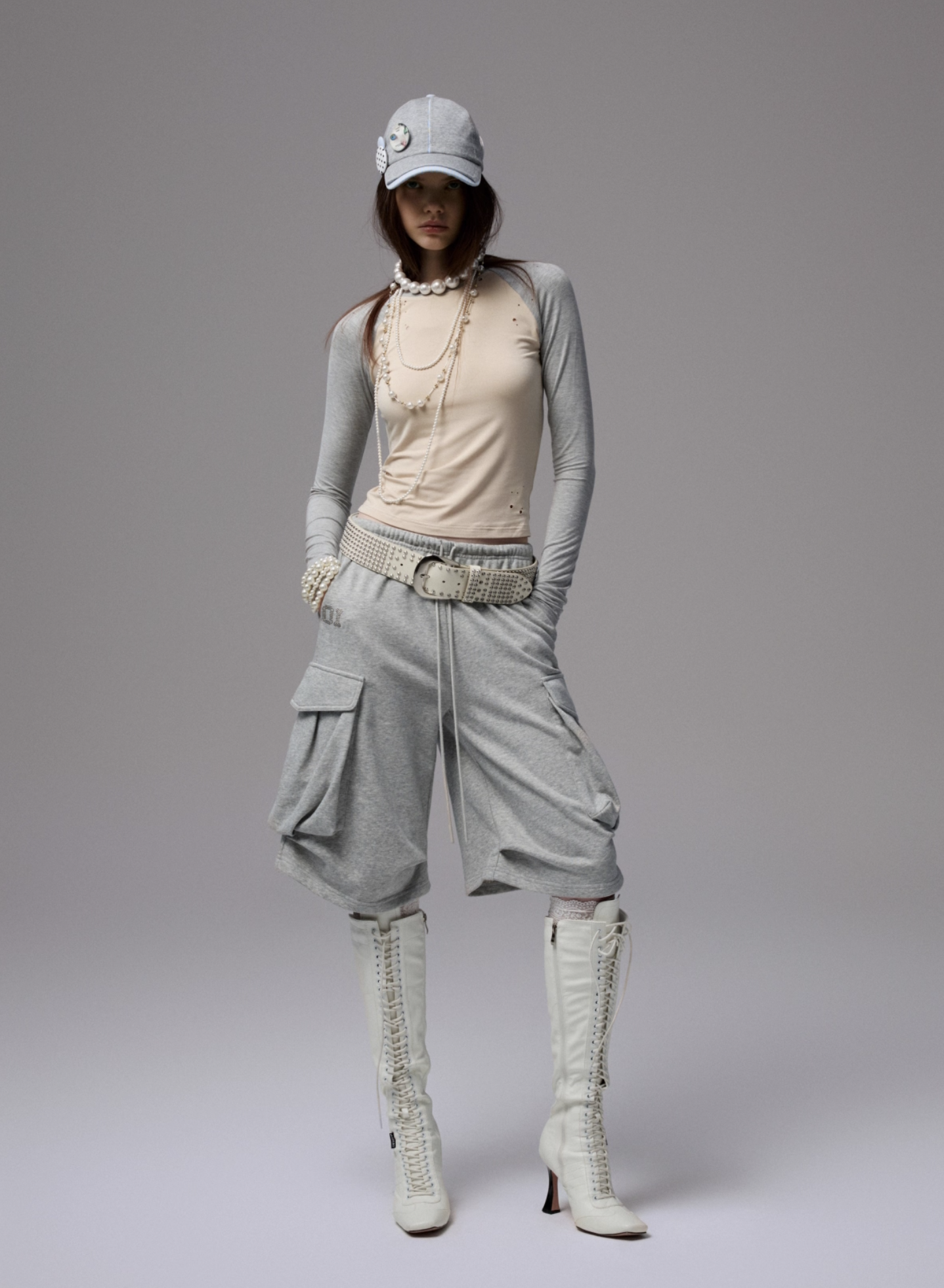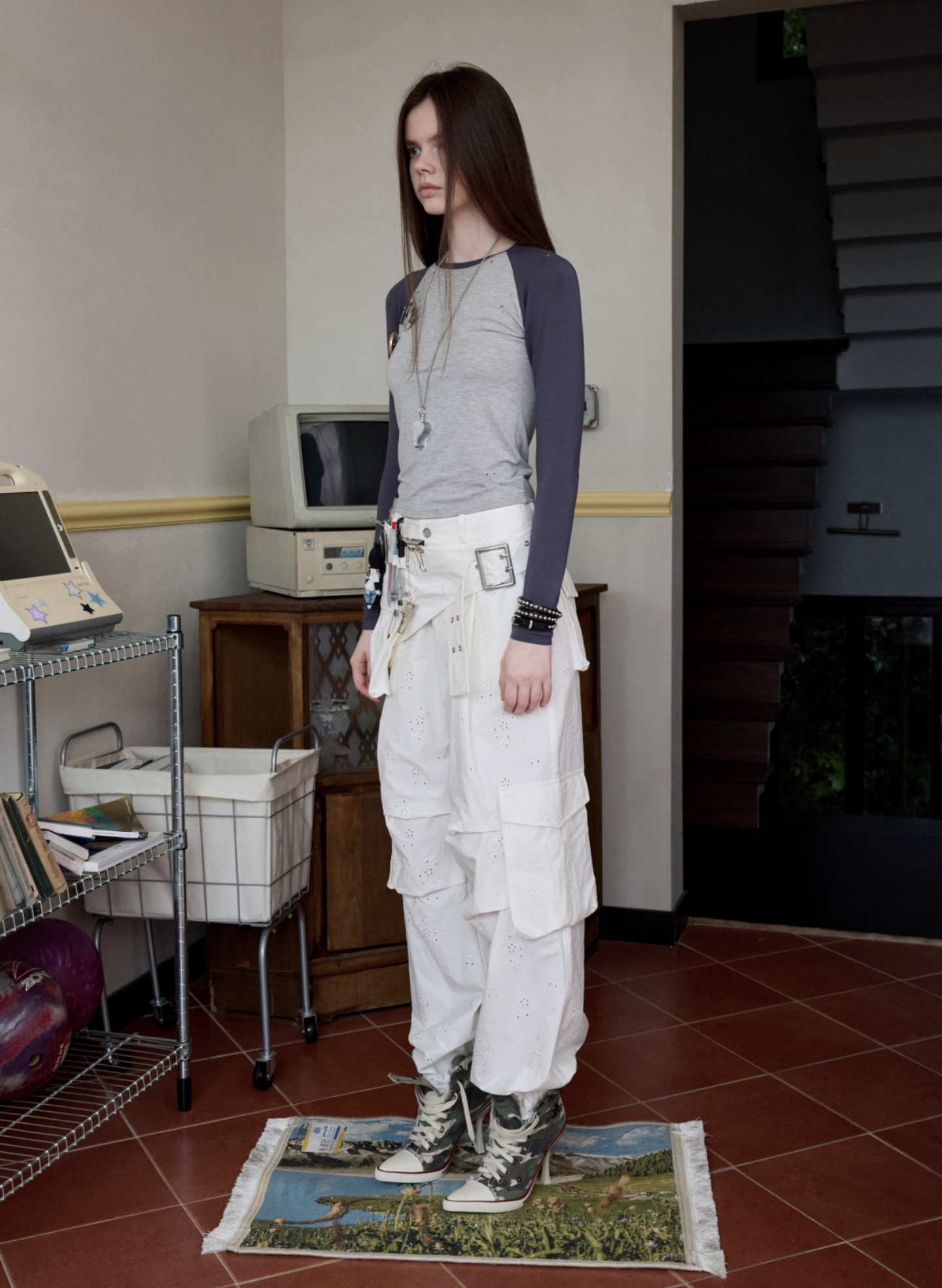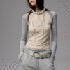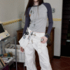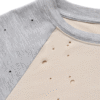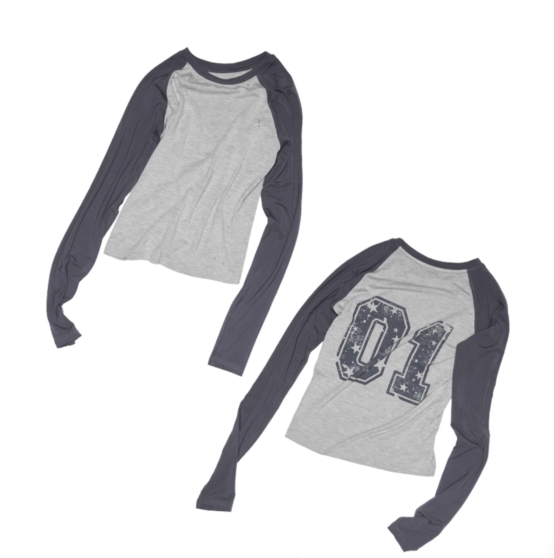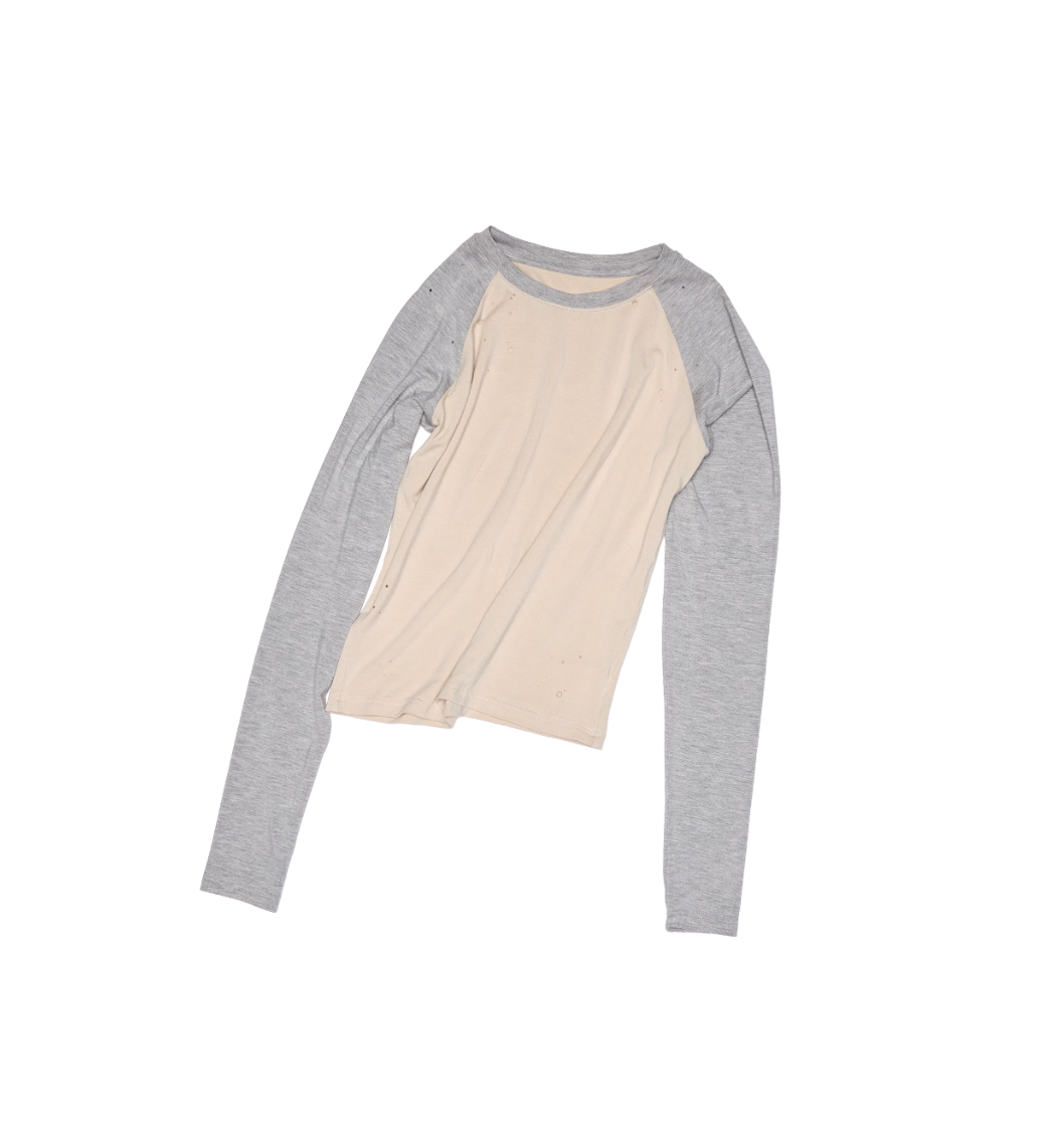 ✰ An ultra-oversized long sleeve tee designed with a relaxed, featuring loose straight-cut and fake two-piece long-sleeve design. Made in a washed light-grey tone for a soft vintage look, the piece features subtle distressed details and a naturally faded texture and vintage punched design. Extra-long sleeves provide a cozy drape, rhinestone bone embellishment on both sleeve add a unique visual accent. Perfect for creating an easy, laid-back, slightly grunge aesthetic.