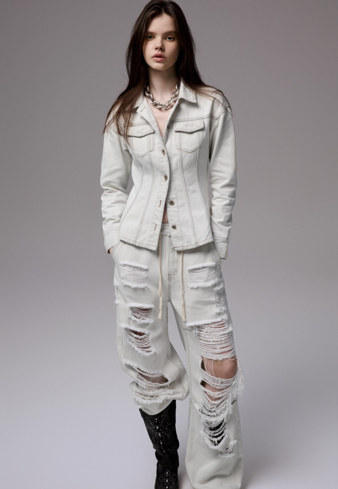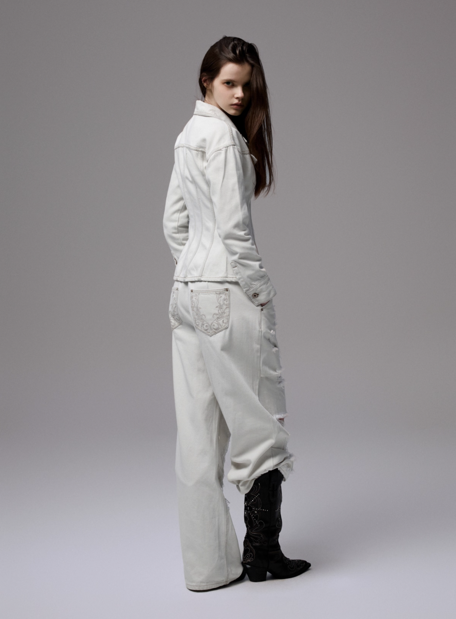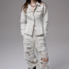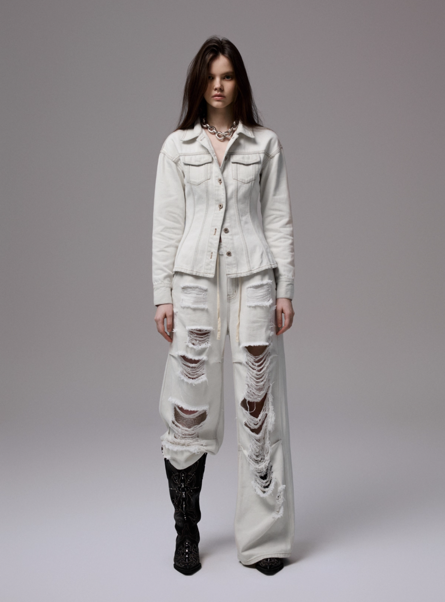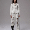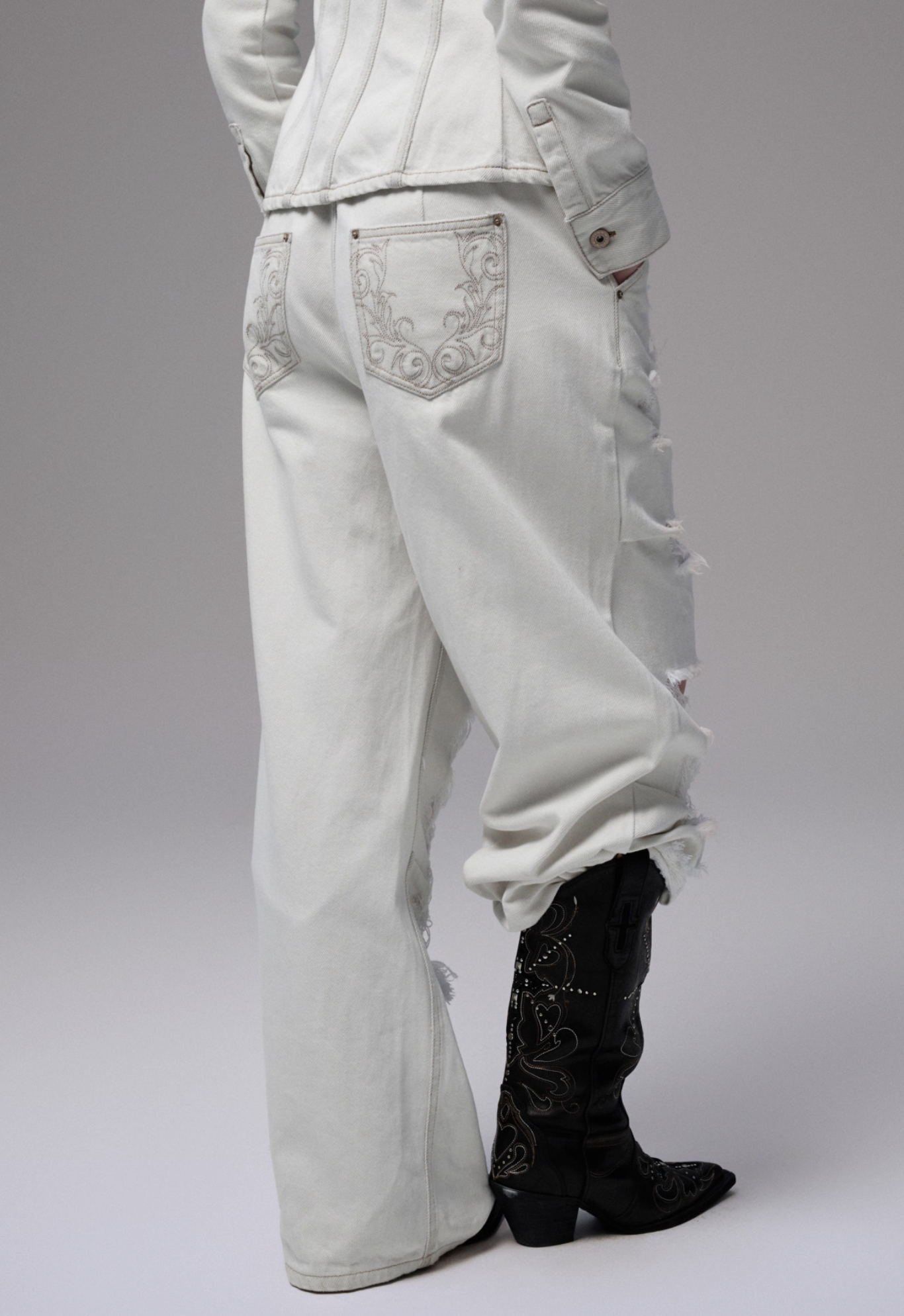 ✰ Fitted off-white denim jacket with corset-style seaming, pointed collar, chest flap pockets, long sleeves, front metal button closure, and tonal stitching, paired with high-waisted wide-leg off-white jeans featuring extreme front shredding and heavy embroidery at back accents create a retro yet chic vibe, large distressed slashes from thigh to calf, frayed edges, and styled with slouchy embroidered ivory boots.