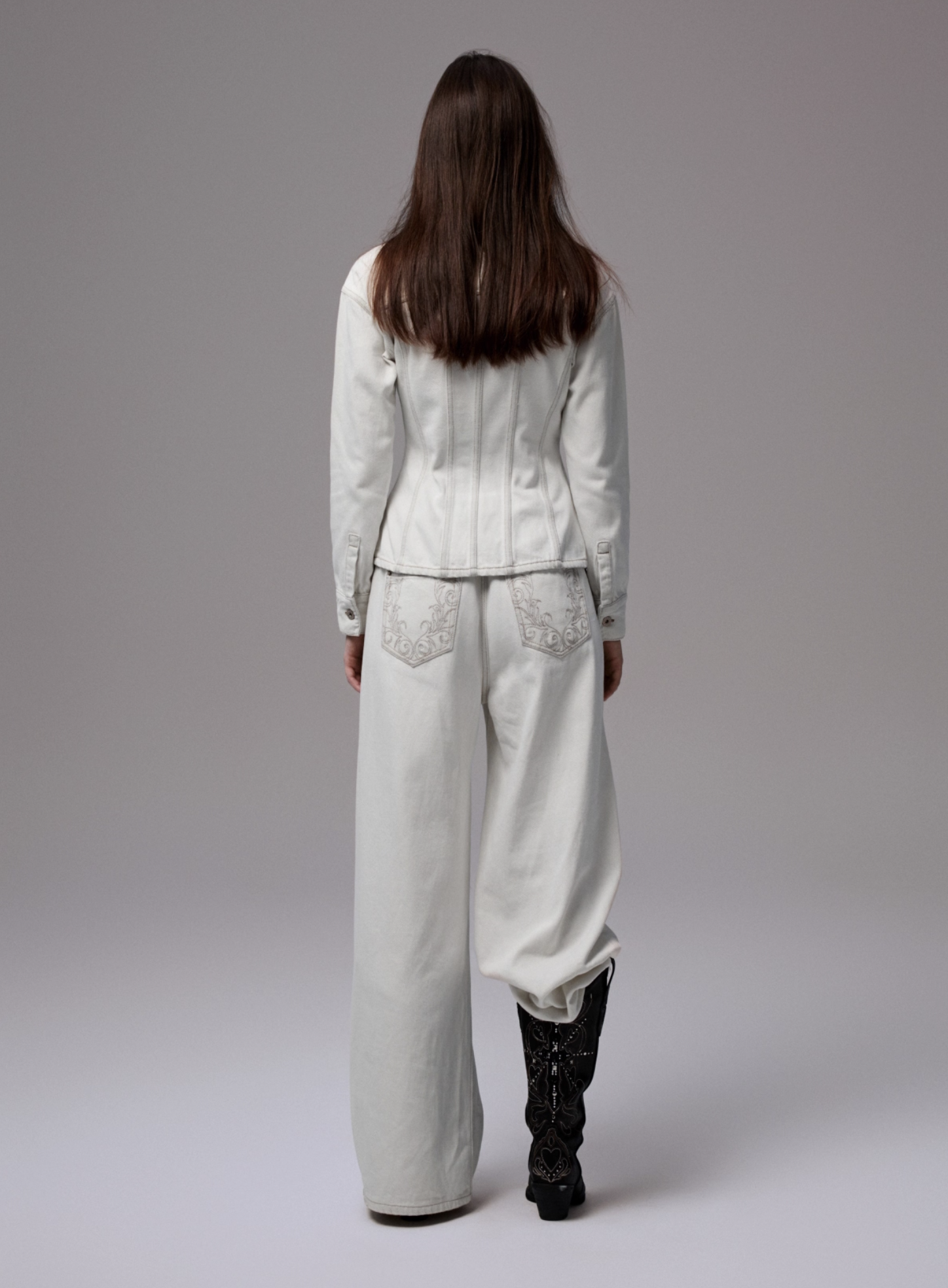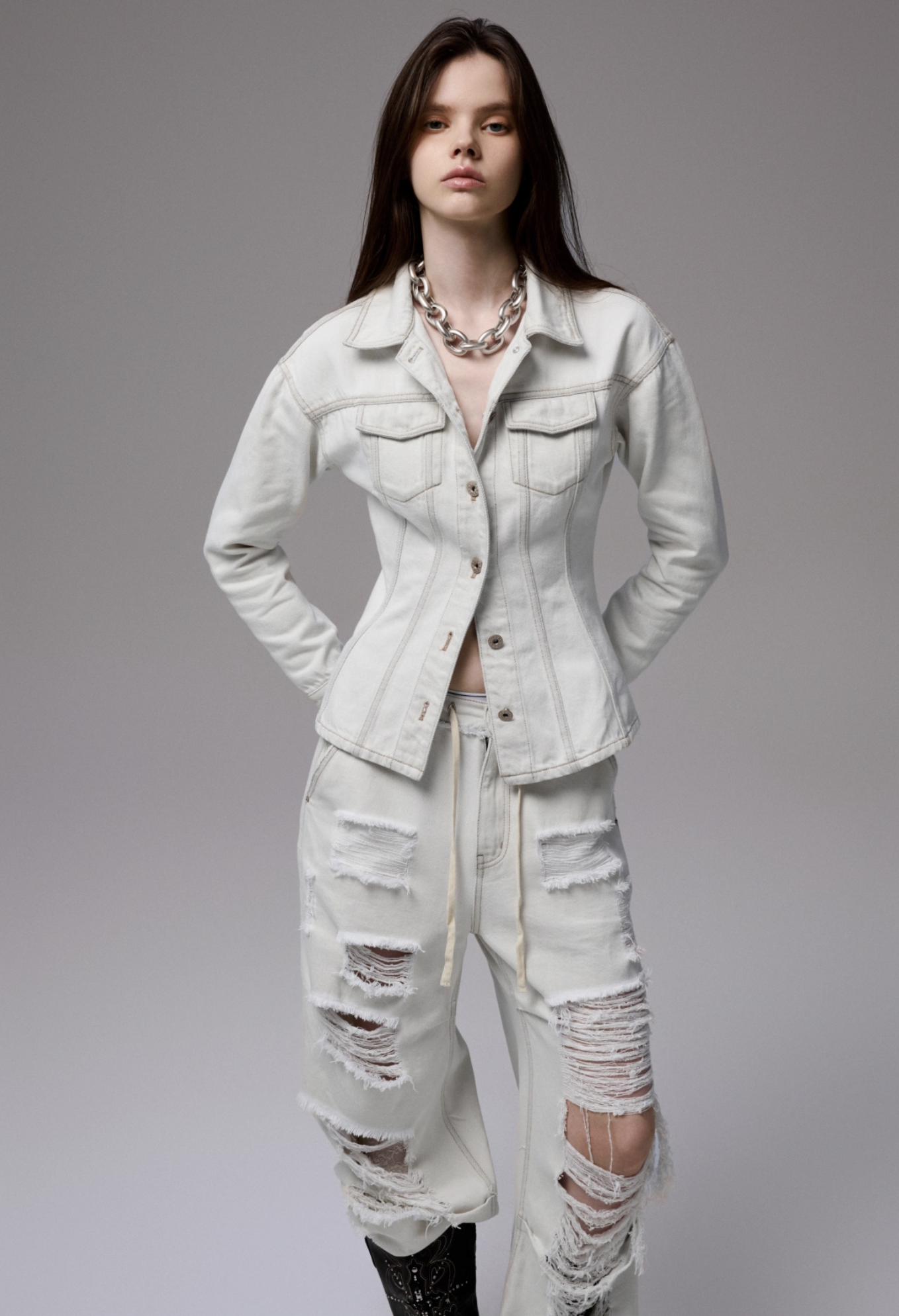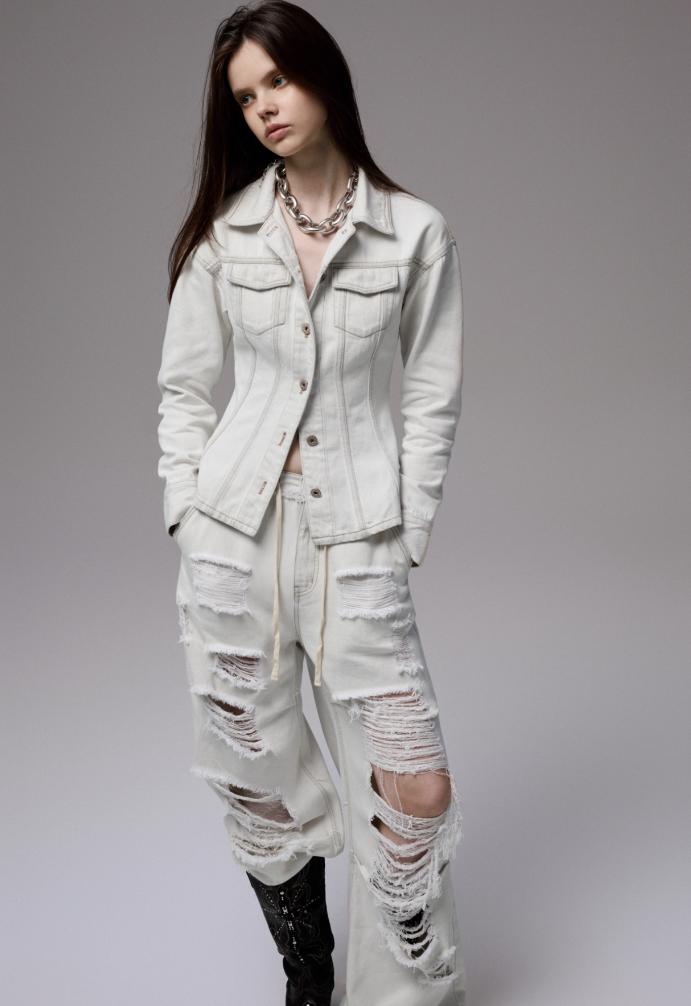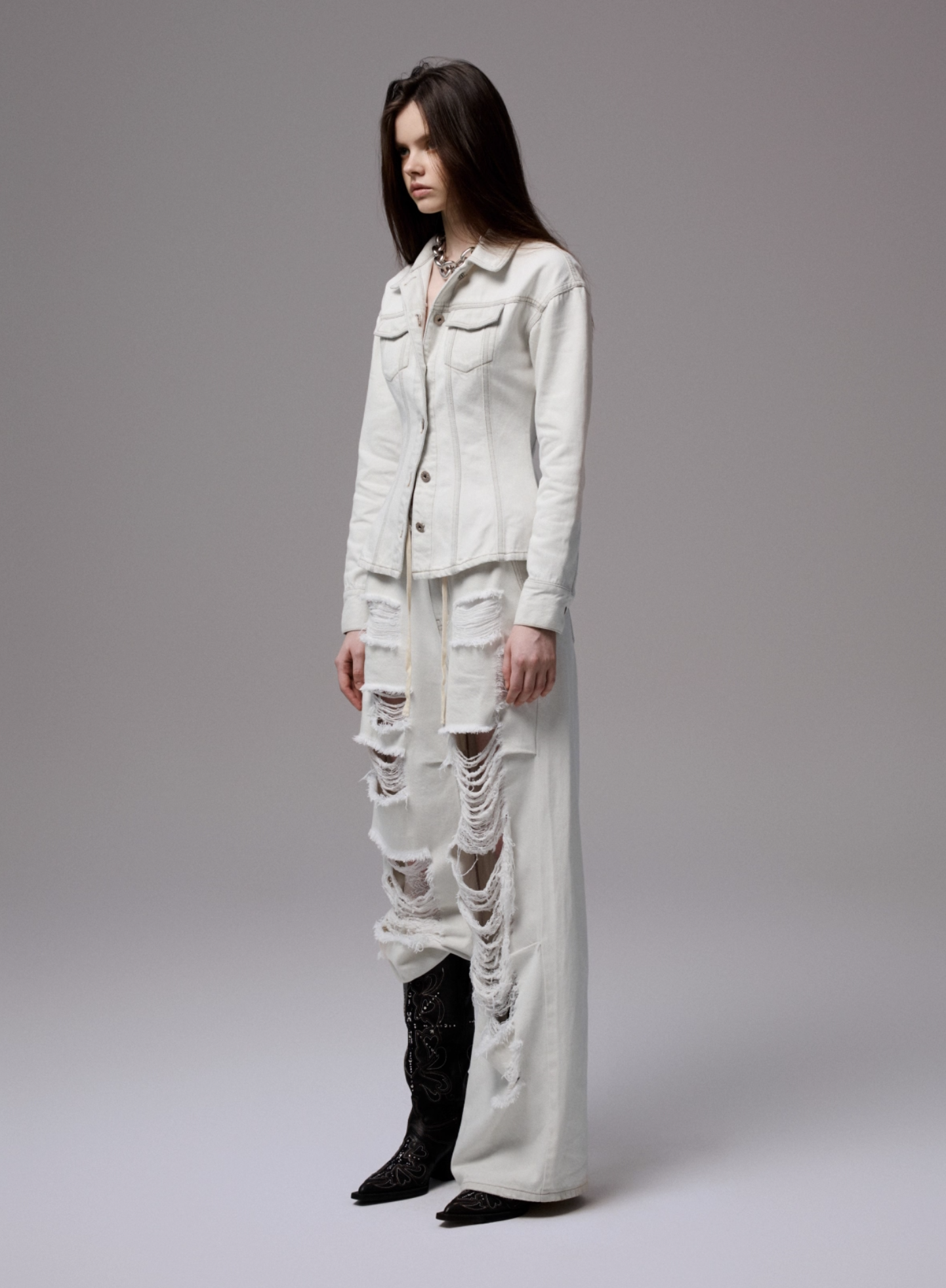 ✰ Fitted off-white denim jacket with corset-style seaming, pointed collar, chest flap pockets, long sleeves, front metal button closure, and tonal stitching, paired with high-waisted wide-leg off-white jeans featuring extreme front shredding and heavy embroidery at back accents create a retro yet chic vibe, large distressed slashes from thigh to calf, frayed edges, and styled with slouchy embroidered ivory boots.