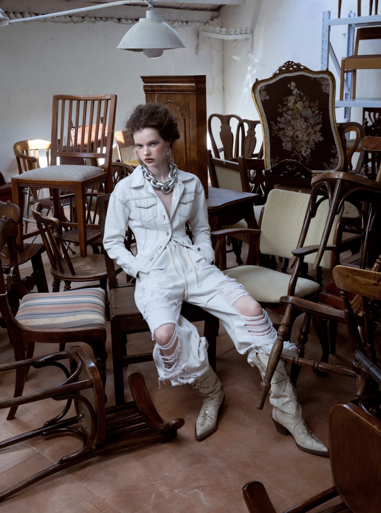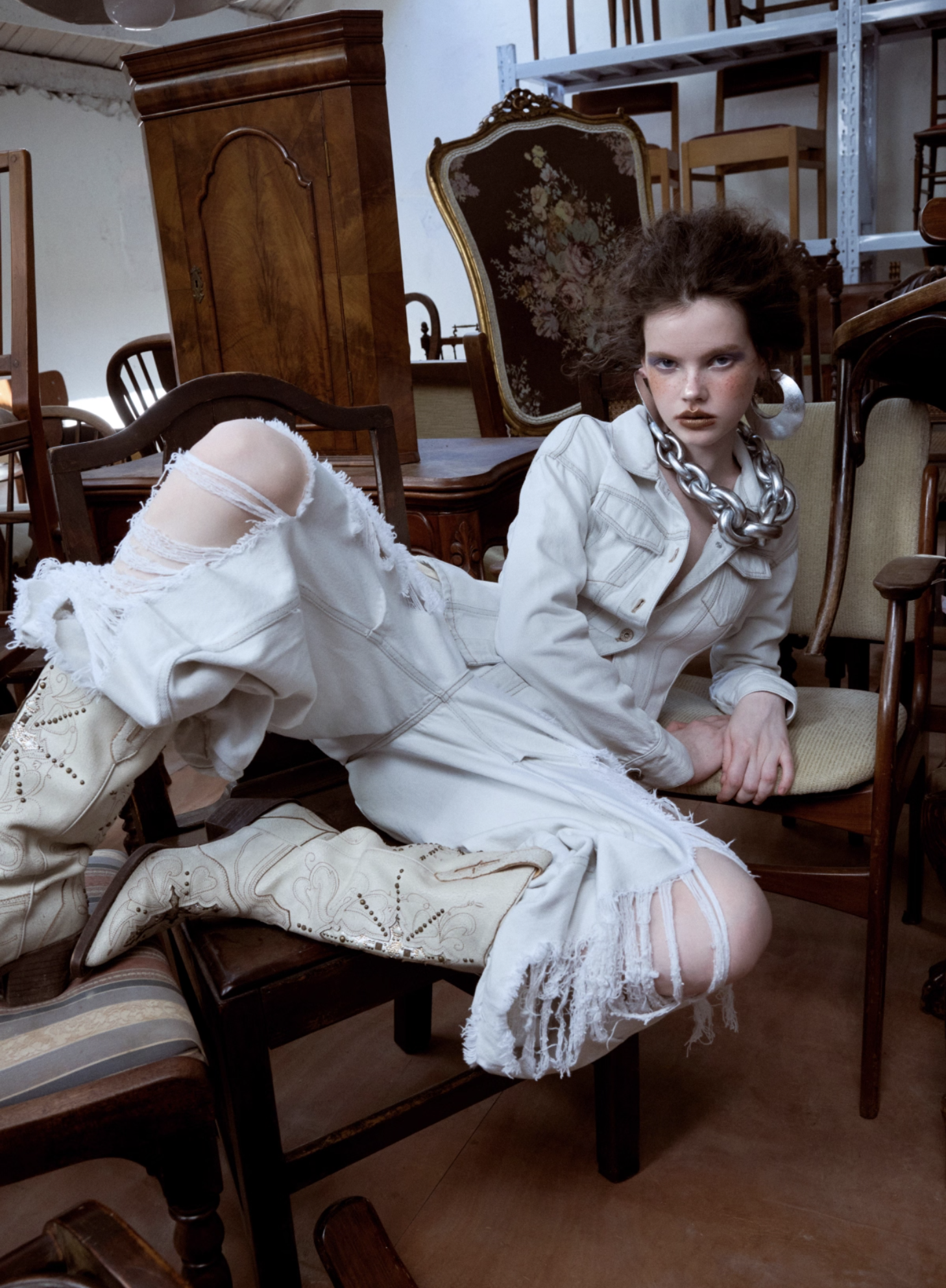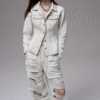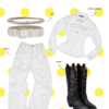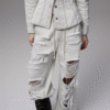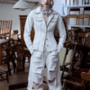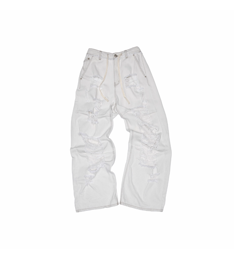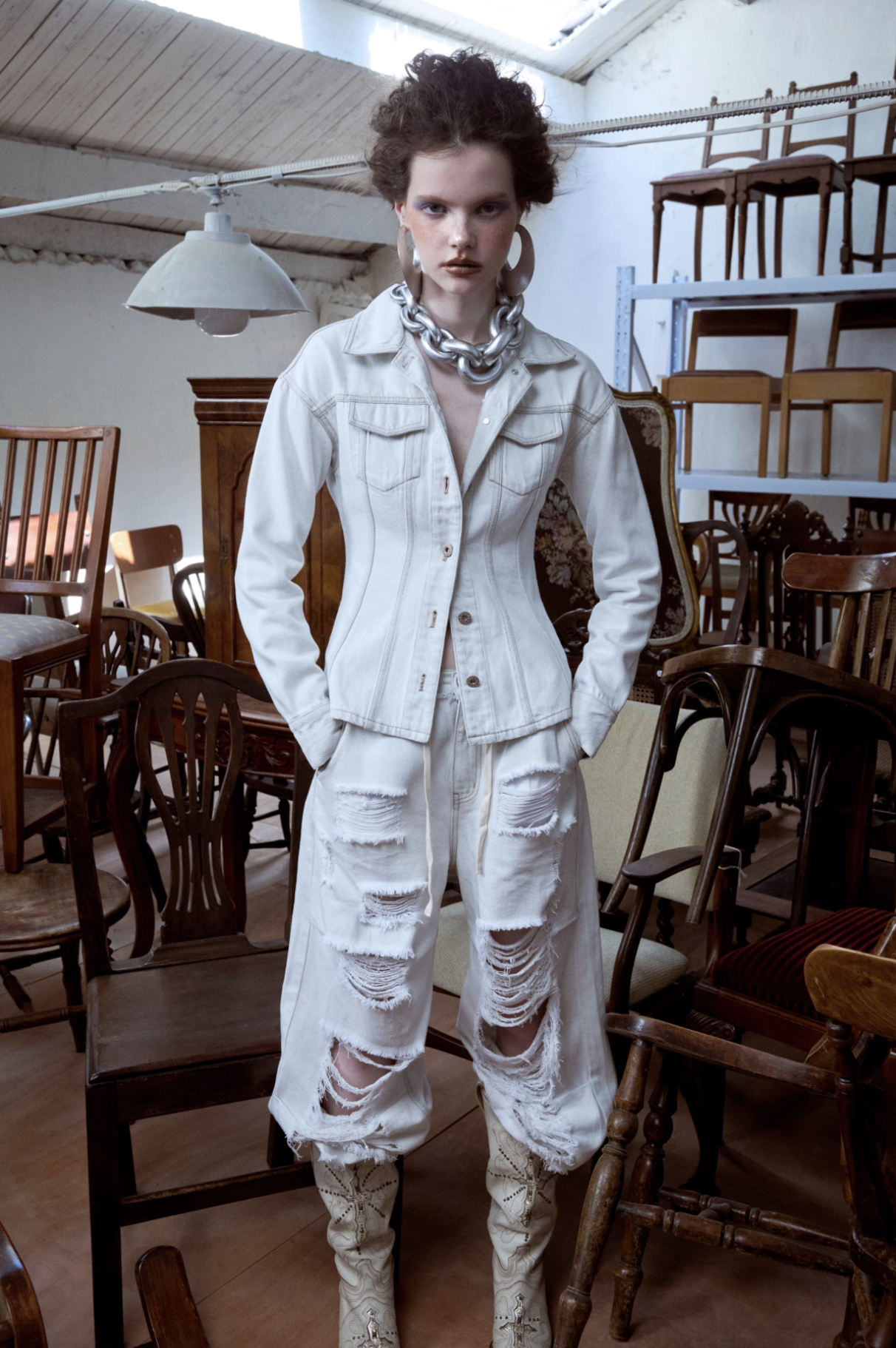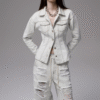 ✰ Fitted off-white denim jacket with corset-style seaming, pointed collar, chest flap pockets, long sleeves, front metal button closure, and tonal stitching, paired with high-waisted wide-leg off-white jeans featuring extreme front shredding and heavy embroidery at back accents create a retro yet chic vibe, large distressed slashes from thigh to calf, frayed edges, and styled with slouchy embroidered ivory boots.