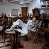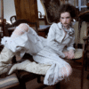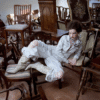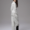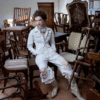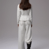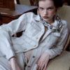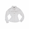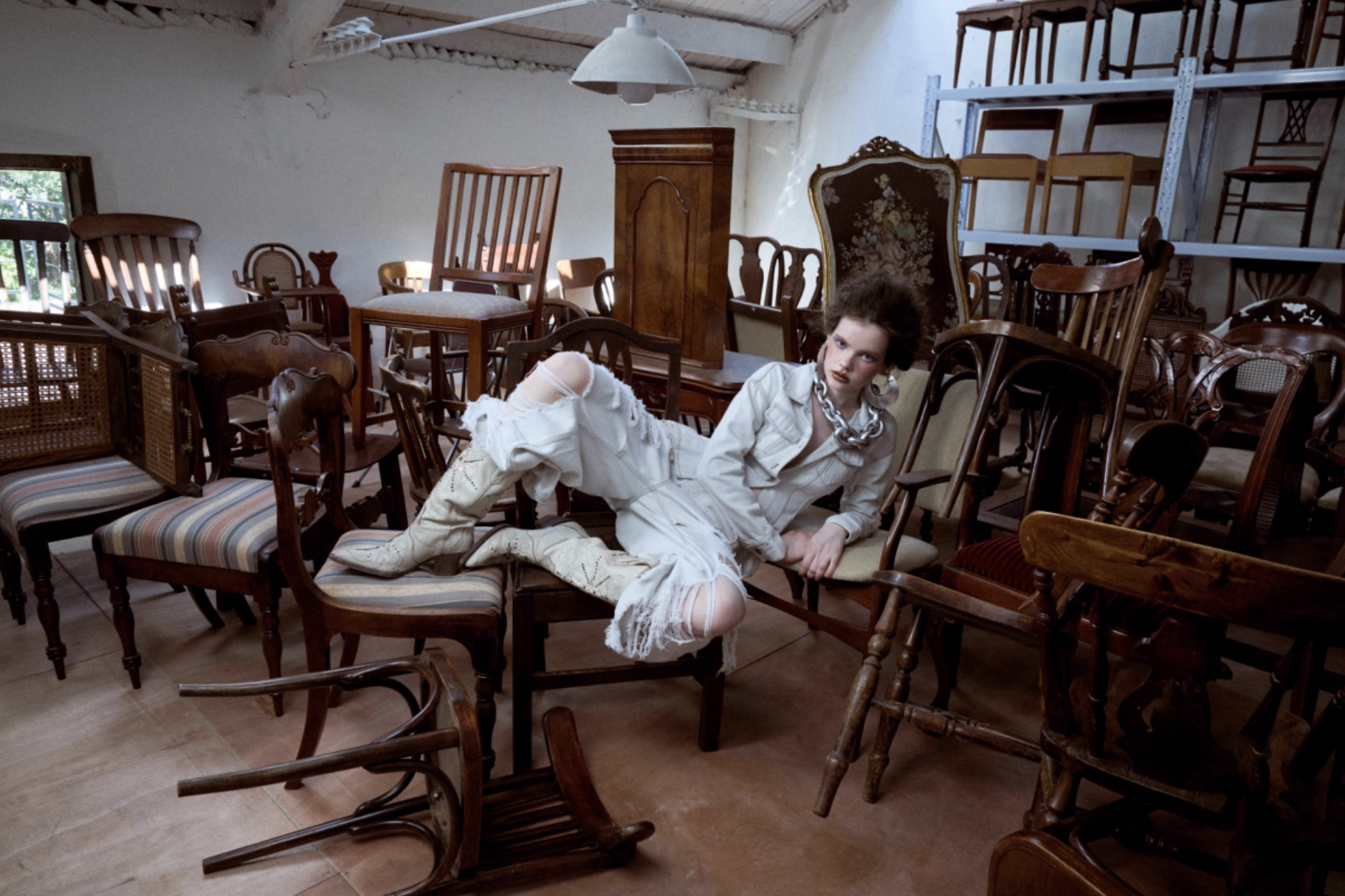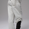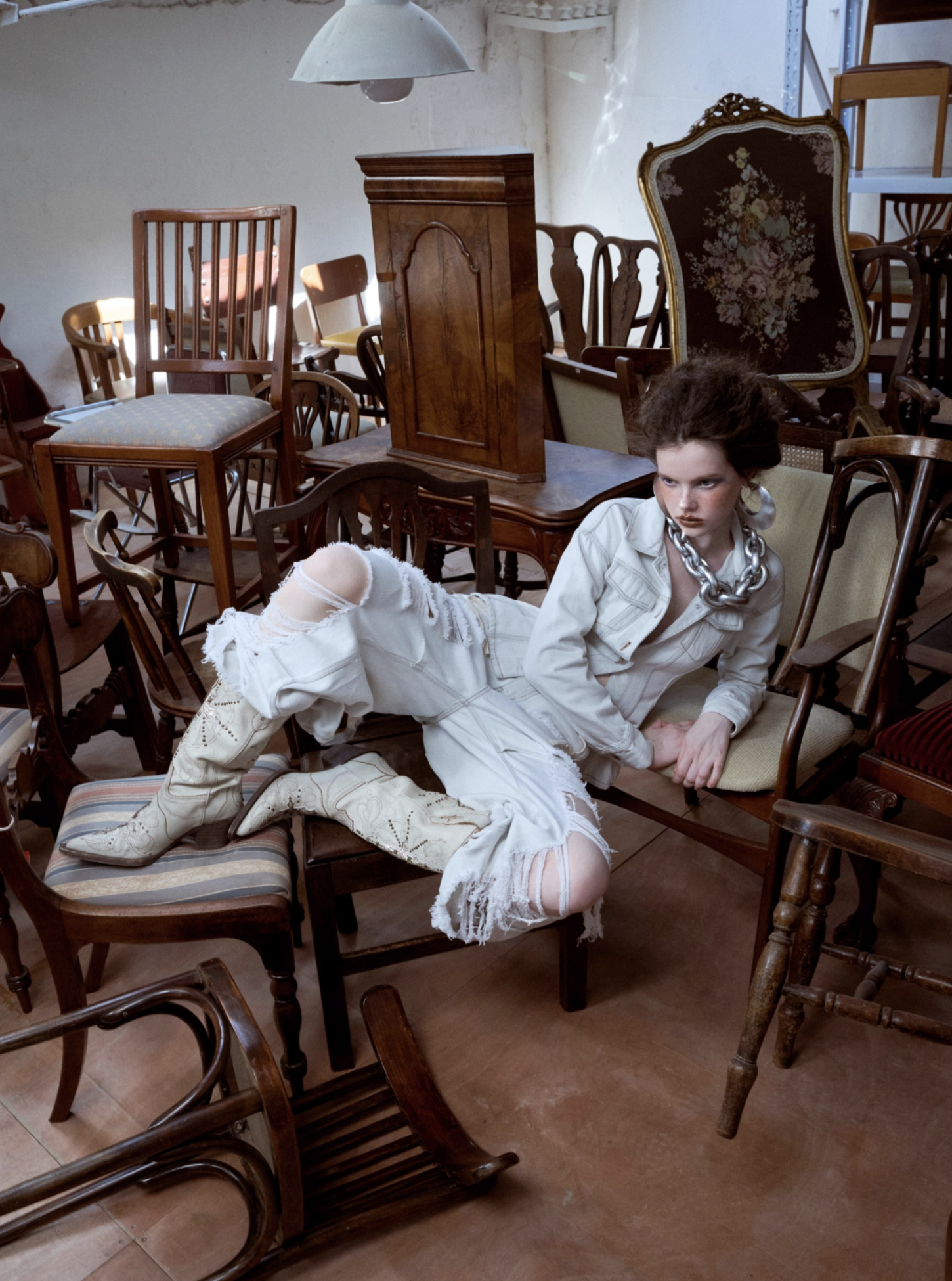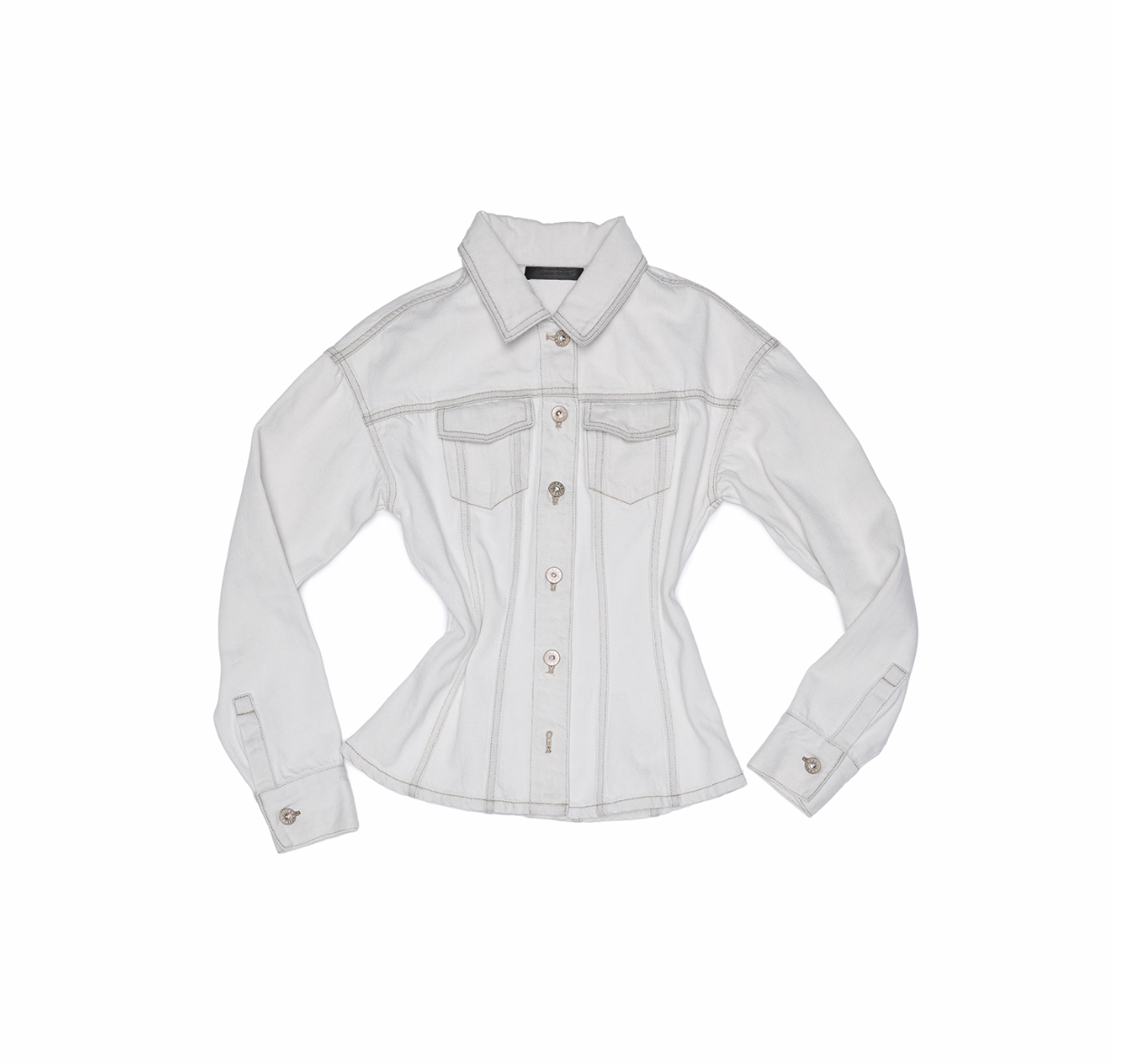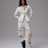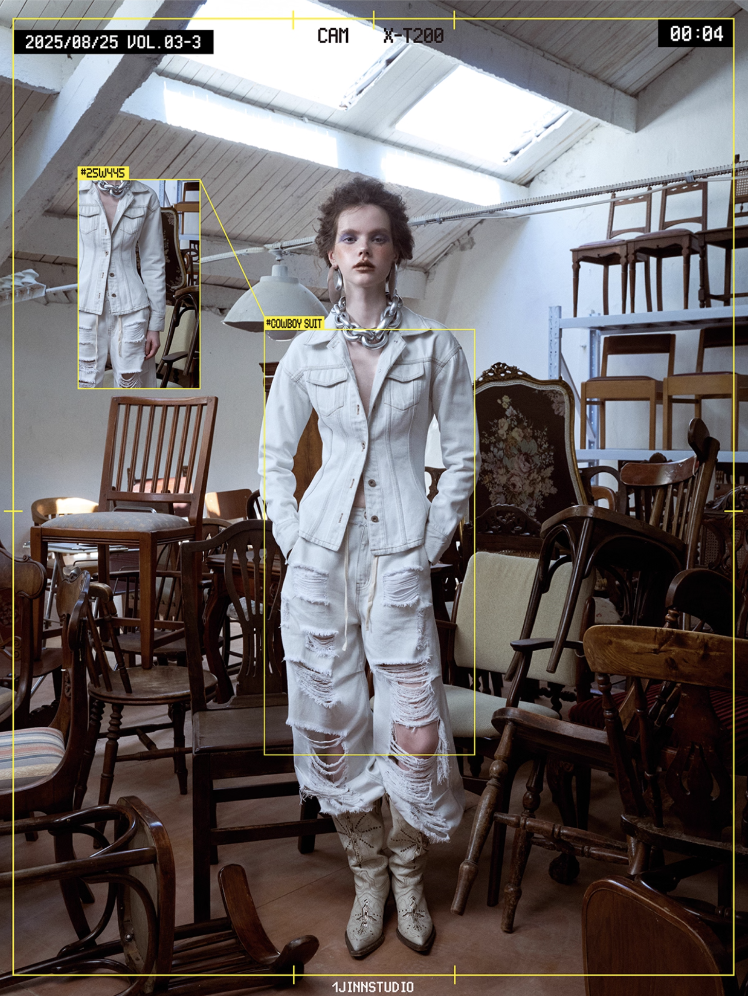 ✰ Fitted off-white denim jacket with corset-style seaming, pointed collar, chest flap pockets, long sleeves, front metal button closure, and tonal stitching, paired with high-waisted wide-leg off-white jeans featuring extreme front shredding and heavy embroidery at back accents create a retro yet chic vibe, large distressed slashes from thigh to calf, frayed edges, and styled with slouchy embroidered ivory boots.
