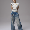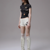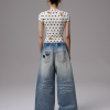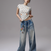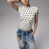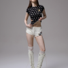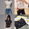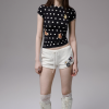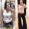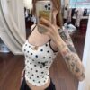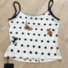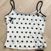 This is fitted camisole top featuring a playful print of contrast polka dots scattered across the fabric. The top has delicate contrast spaghetti straps with a scalloped lace trim along the neckline and hem. Adding a unique and charming touch, the front of the top is adorned with whimsical graphics of animals, including a cat and a rabbit, for a touch of sparkle, the top is also embellished with shimmering crystal accents. The design offers a cute and casual aesthetic, perfect for warm weather. The item appears to be new, with the tag from the brand “1 JINN” still attached.