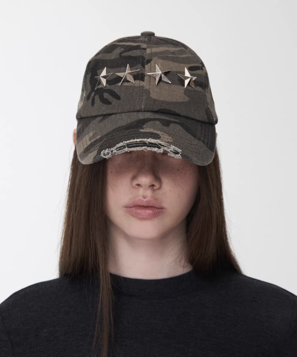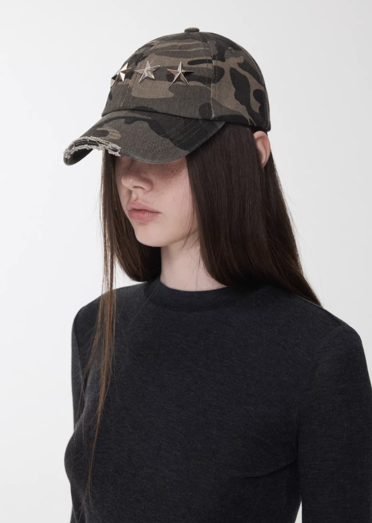 IN STOCK ♱ DISTRESSED STAR-STUDDED BASEBALL CAP ♱ GRAY CAMOUFLAGE