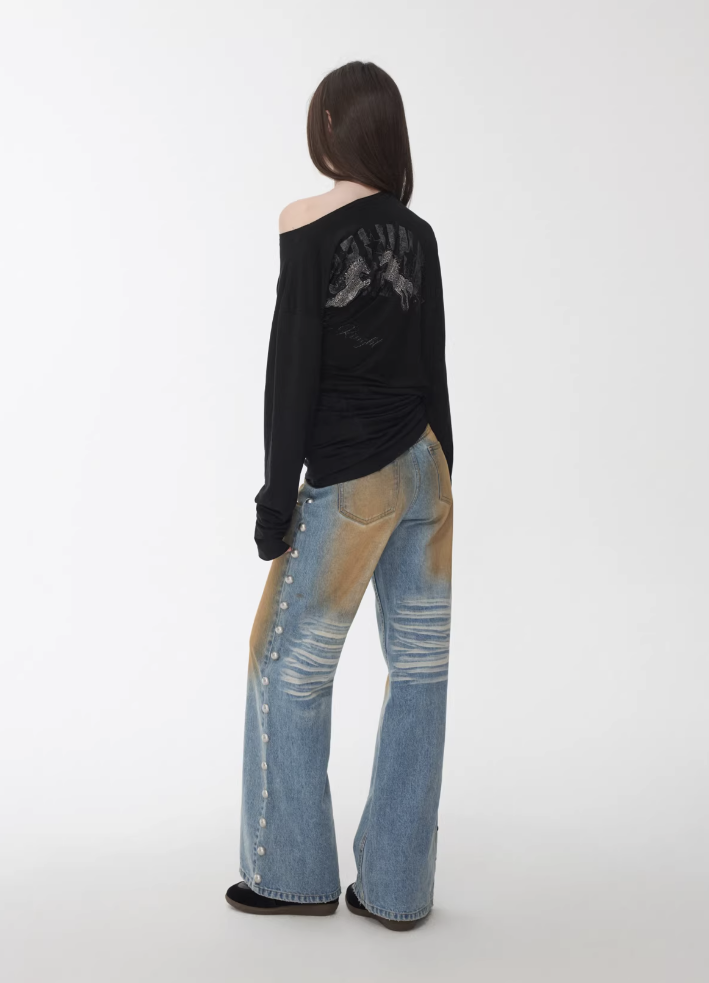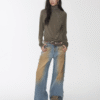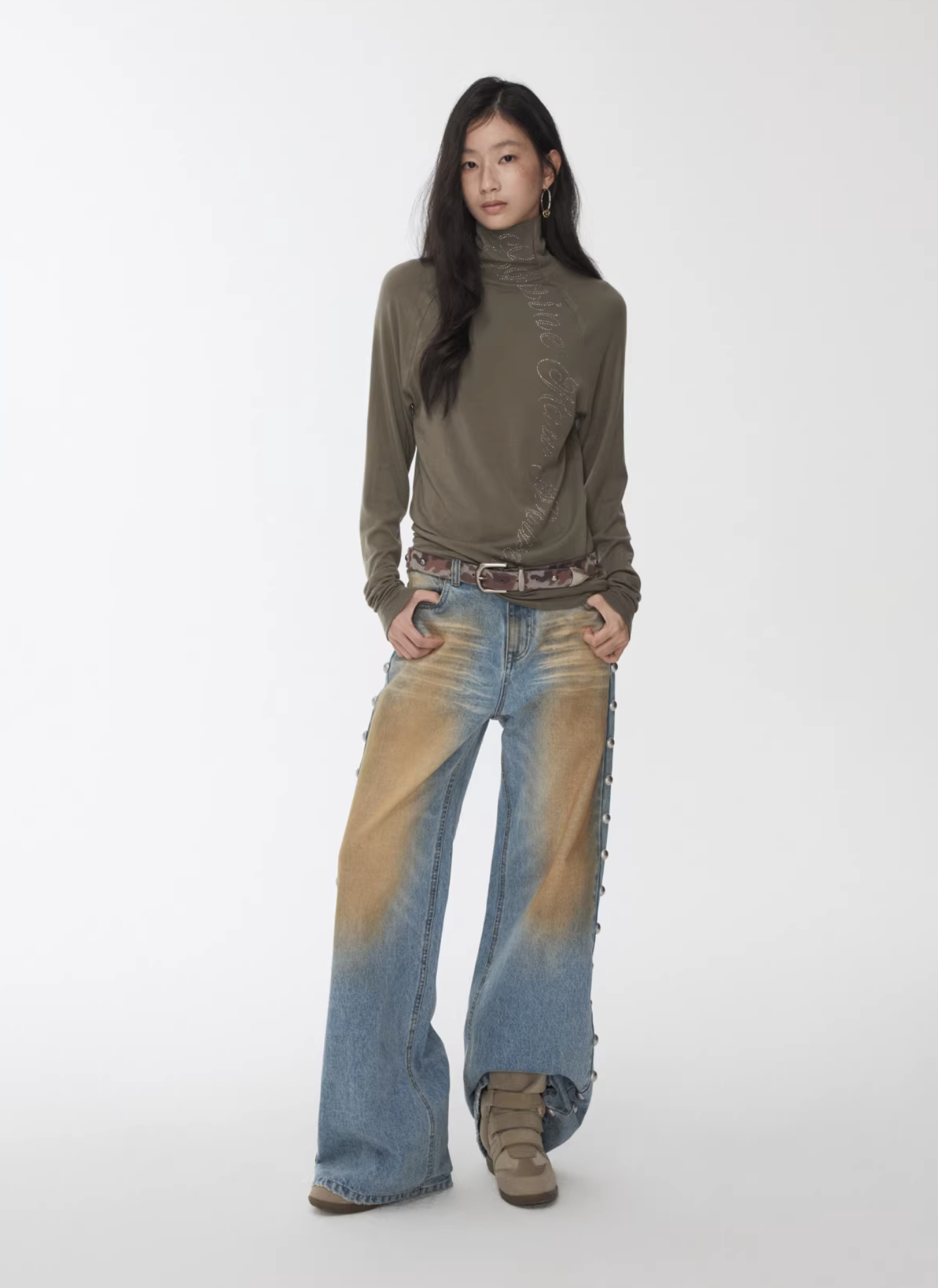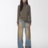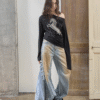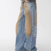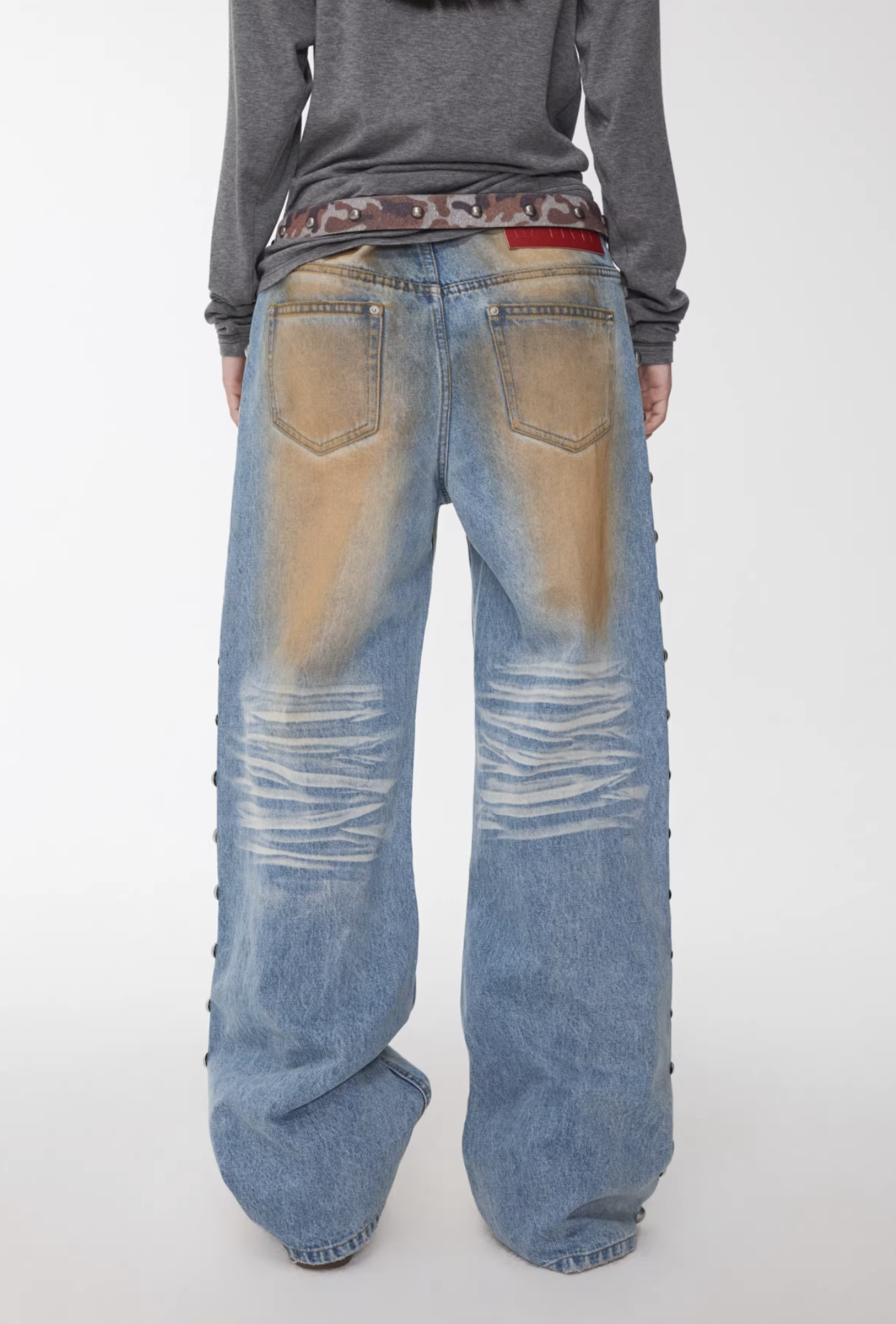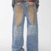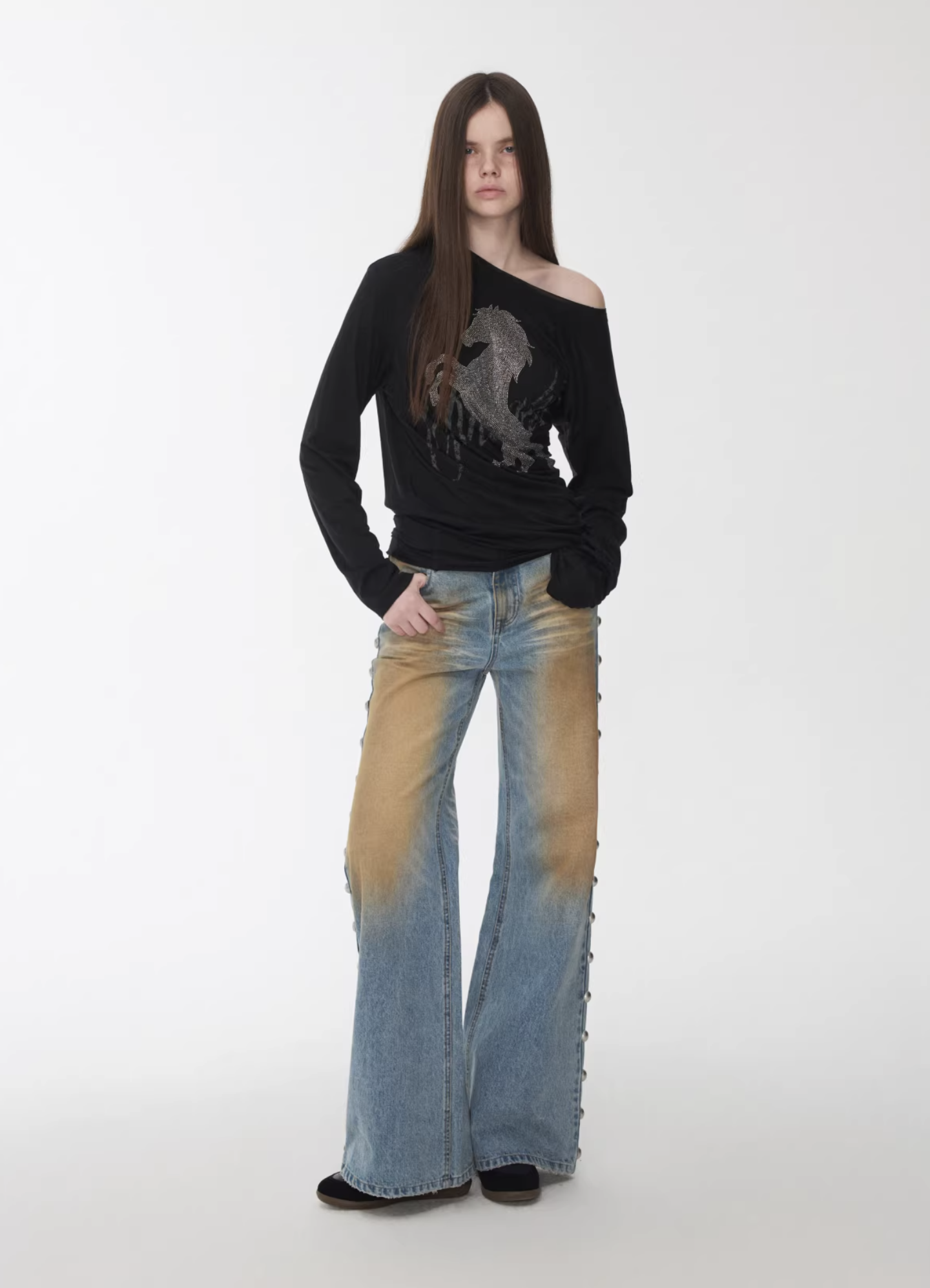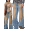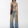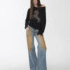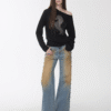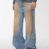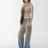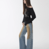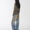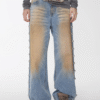 ✰ These statement jeans feature a vintage-inspired blue denim base with a distinctive sun-faded wash across the thighs, creating a worn-in, lived-through look. Designed with a relaxed flare leg, the silhouette elongates the frame while keeping a laid-back edge. Metal snap buttons run along the outer side seams, adding a subtle Western and utility influence. Finished with a mid-rise waist and classic five-pocket construction, this pair blends retro character with modern attitude—perfect for effortless, standout styling.