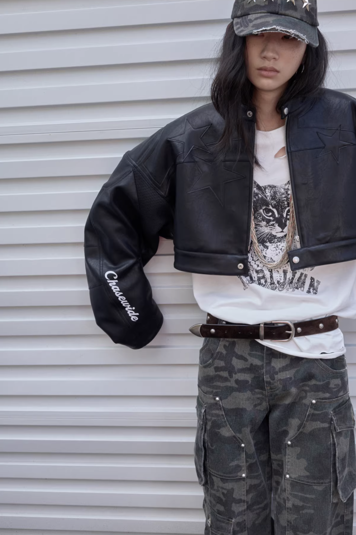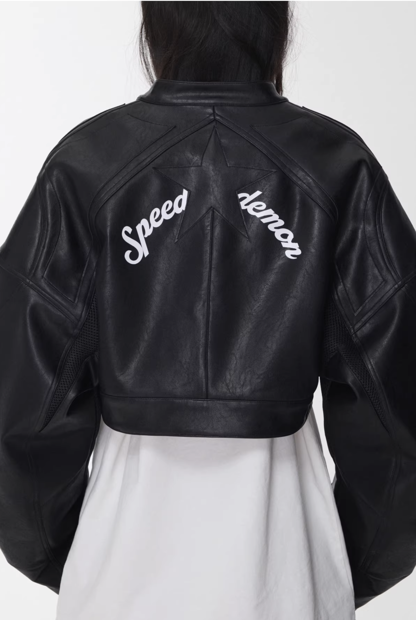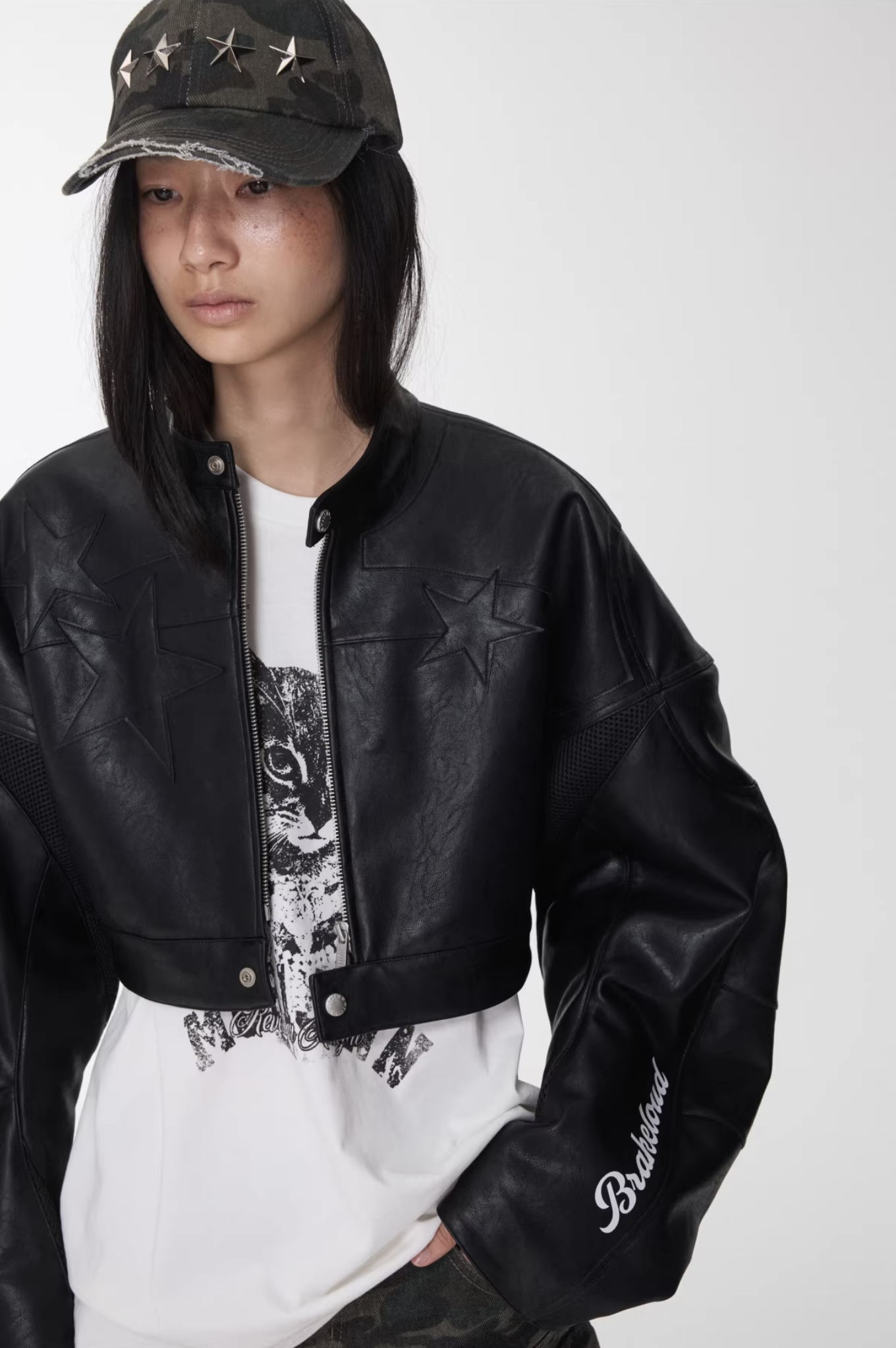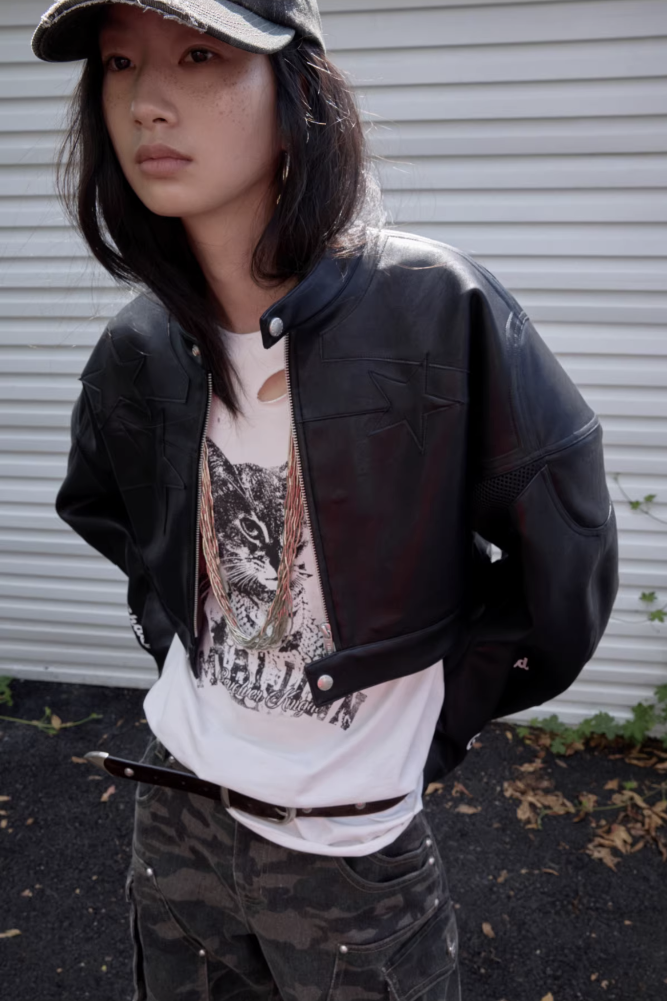 ✰ This cropped moto jacket features a sharp silhouette with relaxed shoulders and sculpted biker-style shoulder panels, effortlessly shaping a sleek yet casual look. The piece showcases a heavy-duty paneled construction with irregular embossed star-shaped leather appliqués, complemented by contrast letter prints on the sleeves and back. The special rubberized print technique adds a unique tactile depth and layered dimension. Made from eco-friendly metallic faux leather with a subtle luster and fine-grain lambskin texture, the jacket combines quality and attitude. The design incorporates mesh-like breathable panels and a soft quilted lining for warmth and structure — achieving a perfect balance between edgy design and practical comfort.