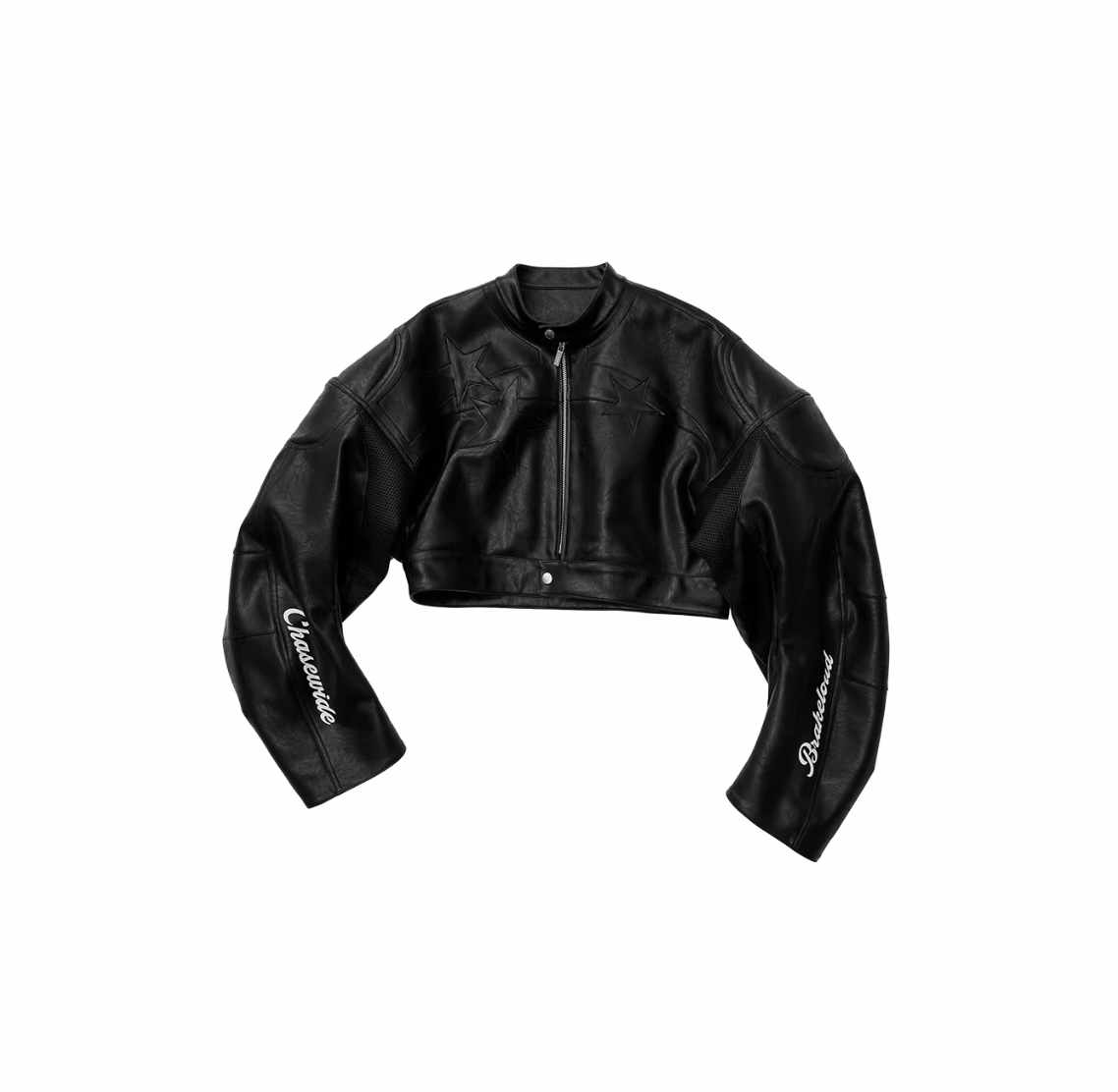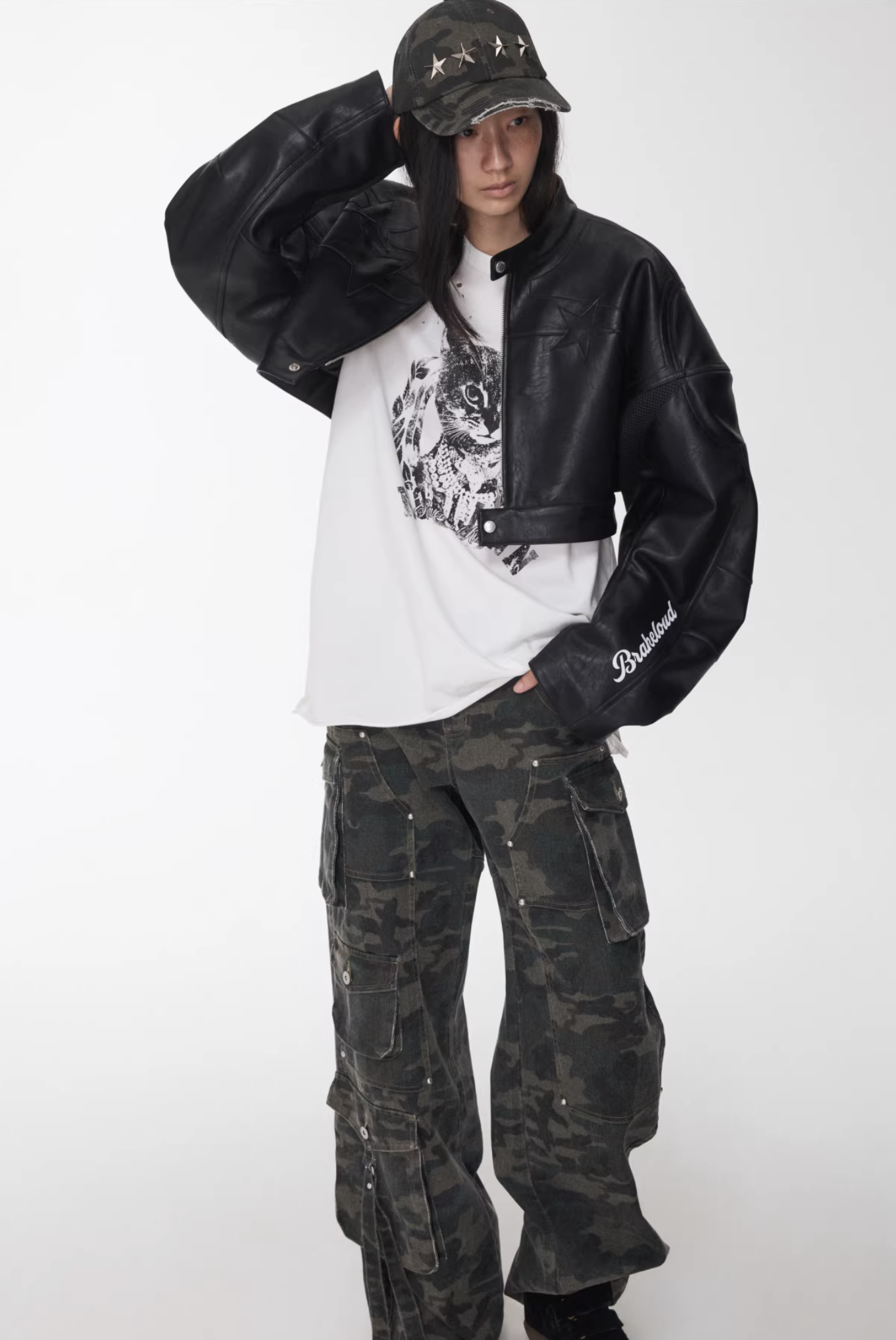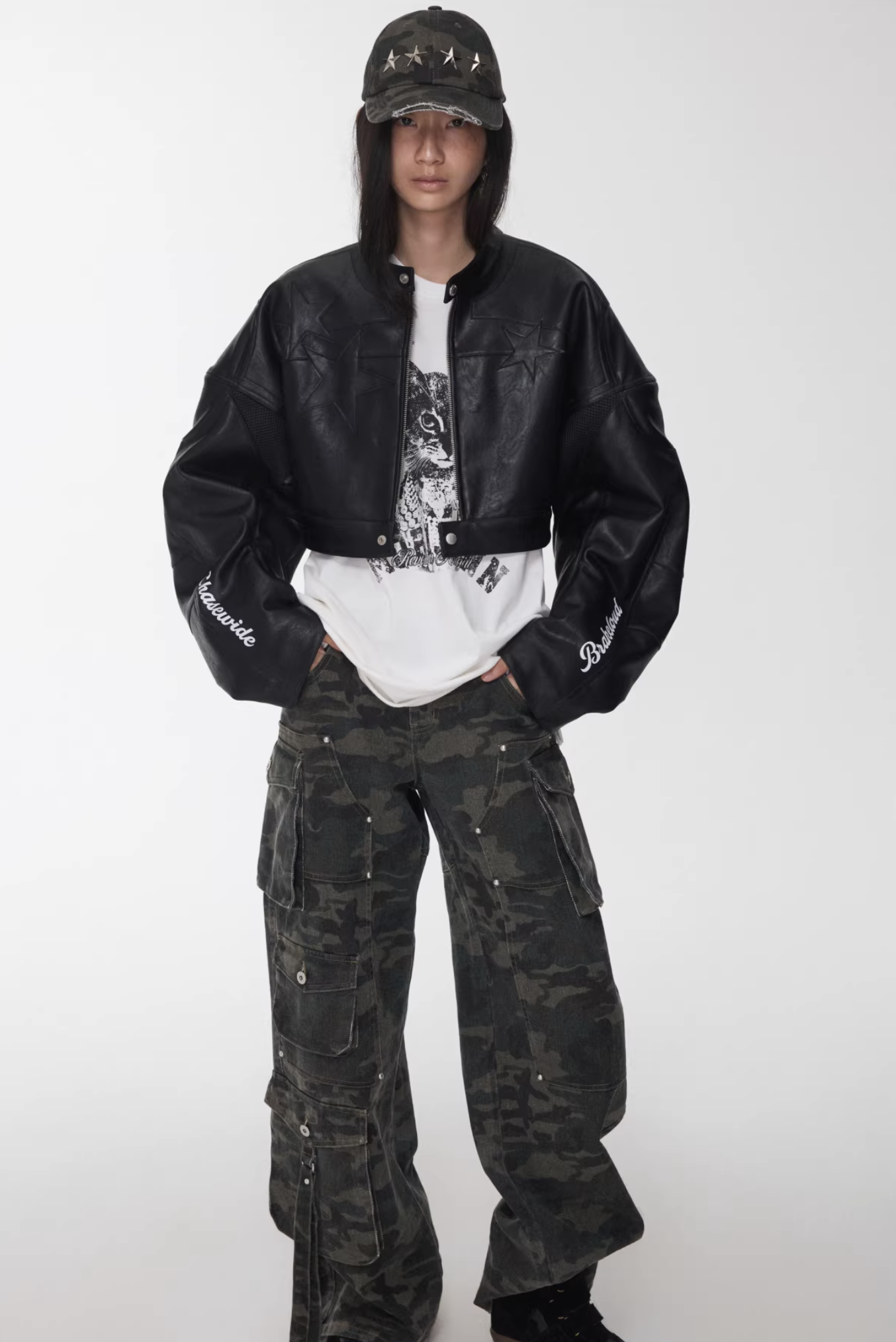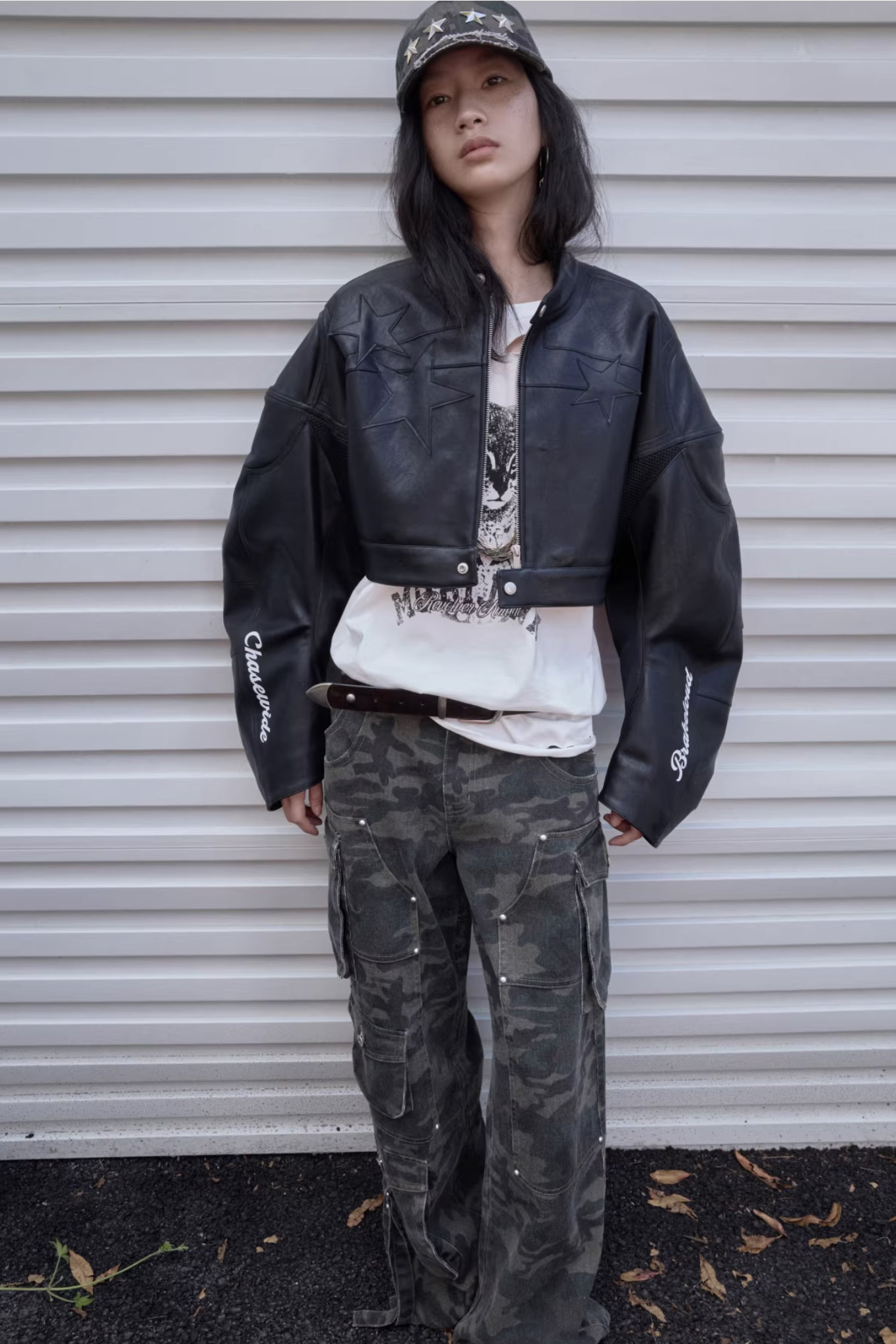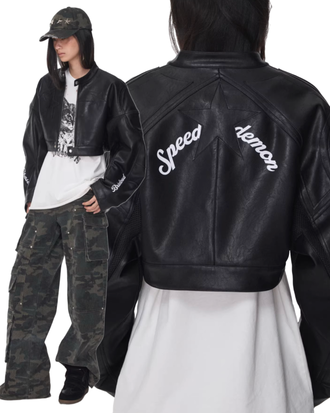 ✰ This cropped moto jacket features a sharp silhouette with relaxed shoulders and sculpted biker-style shoulder panels, effortlessly shaping a sleek yet casual look. The piece showcases a heavy-duty paneled construction with irregular embossed star-shaped leather appliqués, complemented by contrast letter prints on the sleeves and back. The special rubberized print technique adds a unique tactile depth and layered dimension. Made from eco-friendly metallic faux leather with a subtle luster and fine-grain lambskin texture, the jacket combines quality and attitude. The design incorporates mesh-like breathable panels and a soft quilted lining for warmth and structure — achieving a perfect balance between edgy design and practical comfort.