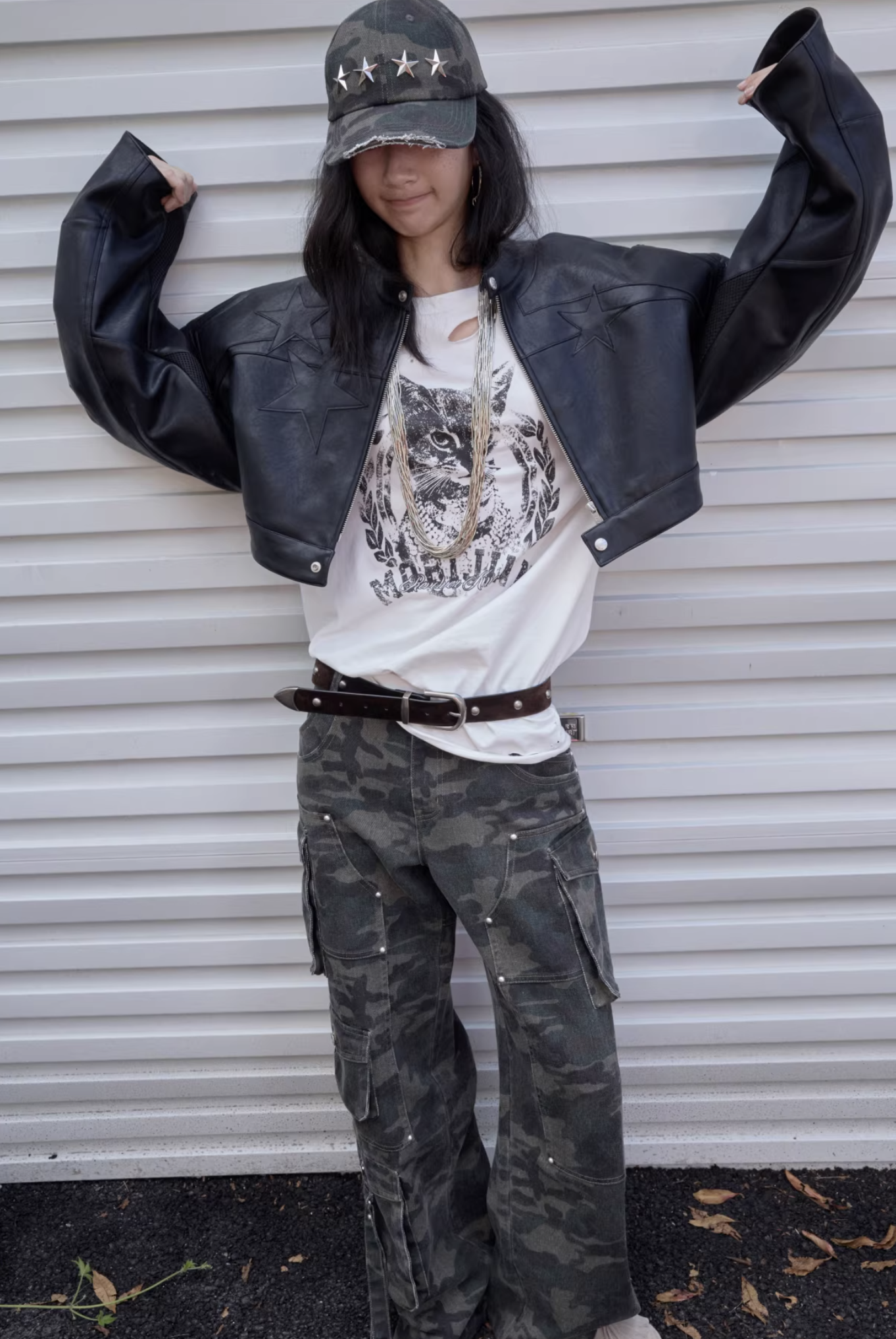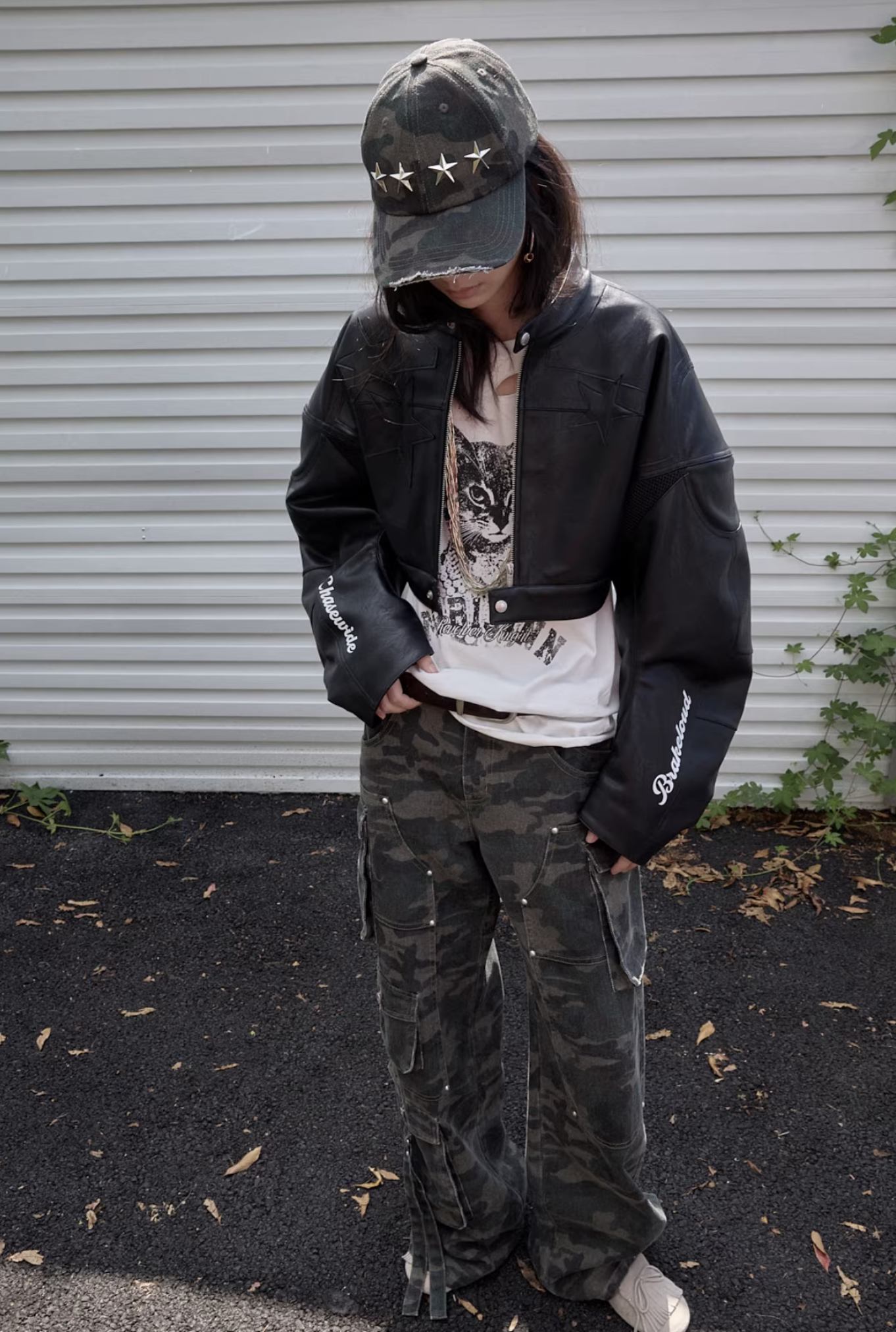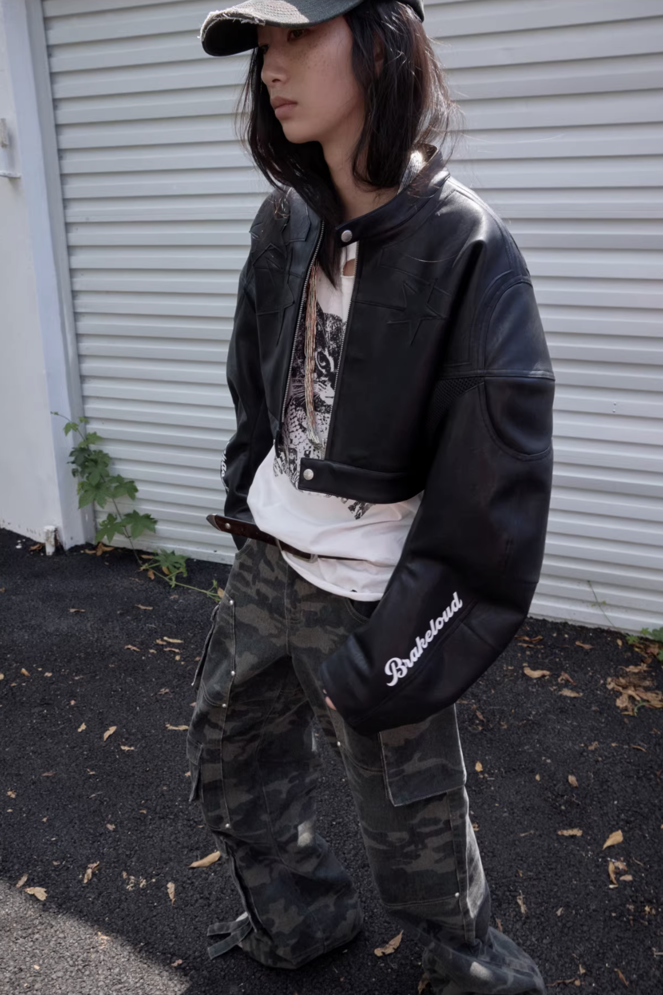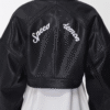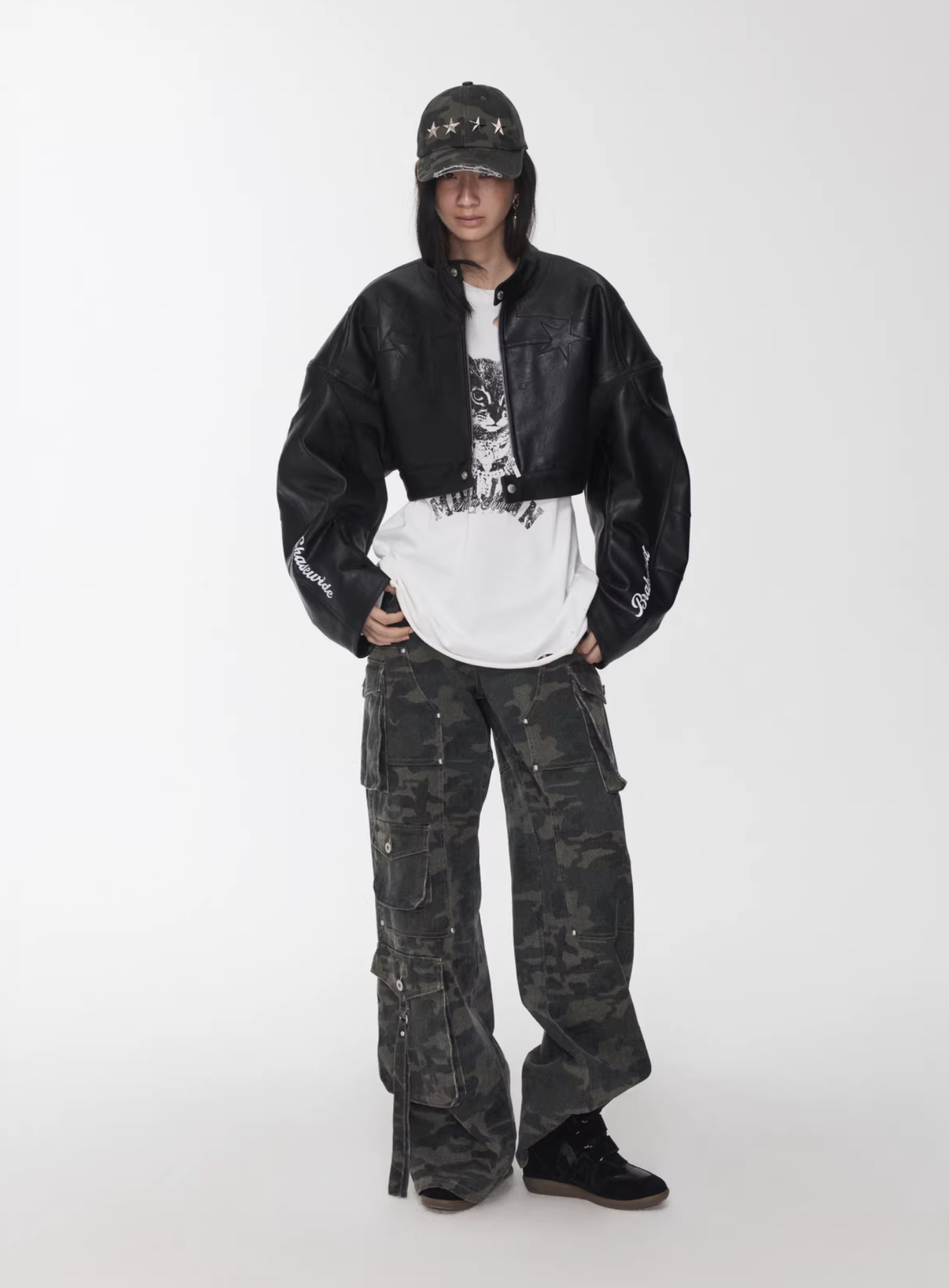 ✰ This cropped moto jacket features a sharp silhouette with relaxed shoulders and sculpted biker-style shoulder panels, effortlessly shaping a sleek yet casual look. The piece showcases a heavy-duty paneled construction with irregular embossed star-shaped leather appliqués, complemented by contrast letter prints on the sleeves and back. The special rubberized print technique adds a unique tactile depth and layered dimension. Made from eco-friendly metallic faux leather with a subtle luster and fine-grain lambskin texture, the jacket combines quality and attitude. The design incorporates mesh-like breathable panels and a soft quilted lining for warmth and structure — achieving a perfect balance between edgy design and practical comfort.
