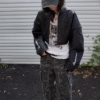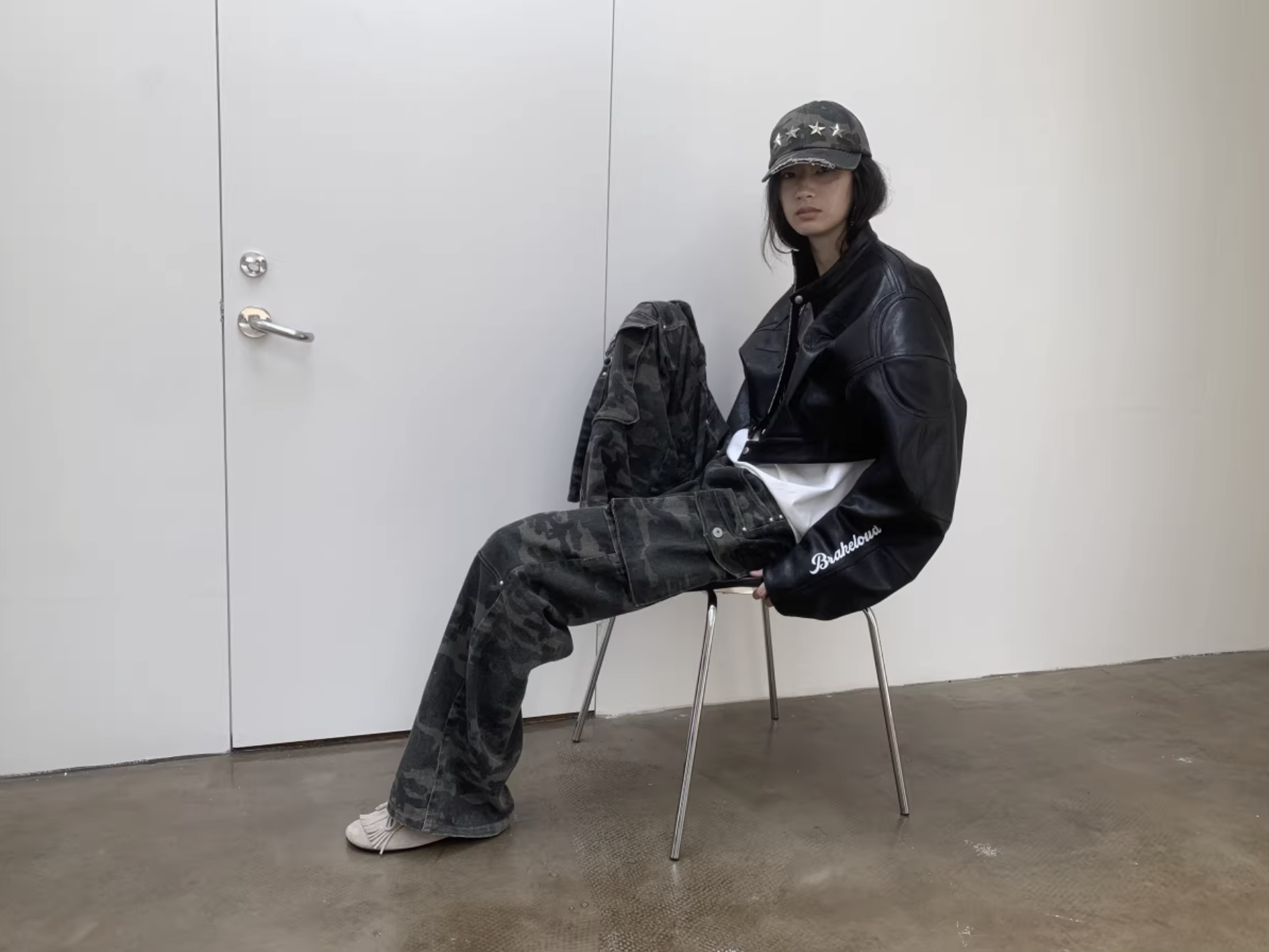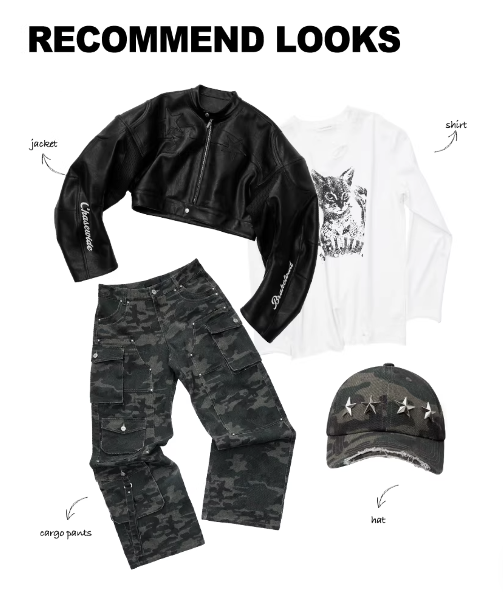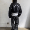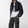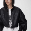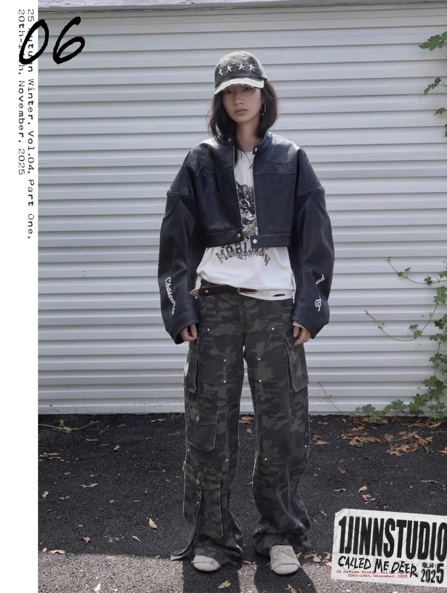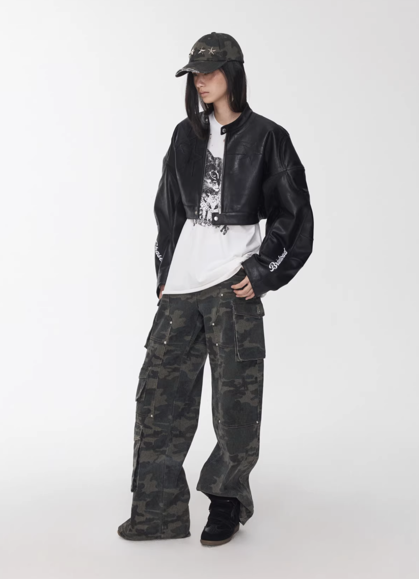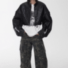 ✰ This cropped moto jacket features a sharp silhouette with relaxed shoulders and sculpted biker-style shoulder panels, effortlessly shaping a sleek yet casual look. The piece showcases a heavy-duty paneled construction with irregular embossed star-shaped leather appliqués, complemented by contrast letter prints on the sleeves and back. The special rubberized print technique adds a unique tactile depth and layered dimension. Made from eco-friendly metallic faux leather with a subtle luster and fine-grain lambskin texture, the jacket combines quality and attitude. The design incorporates mesh-like breathable panels and a soft quilted lining for warmth and structure — achieving a perfect balance between edgy design and practical comfort.