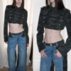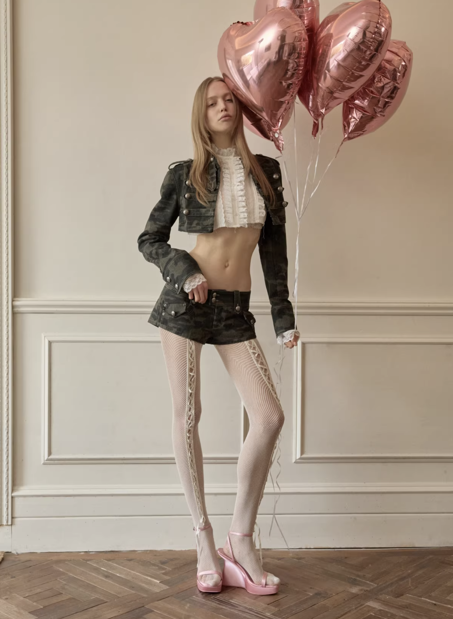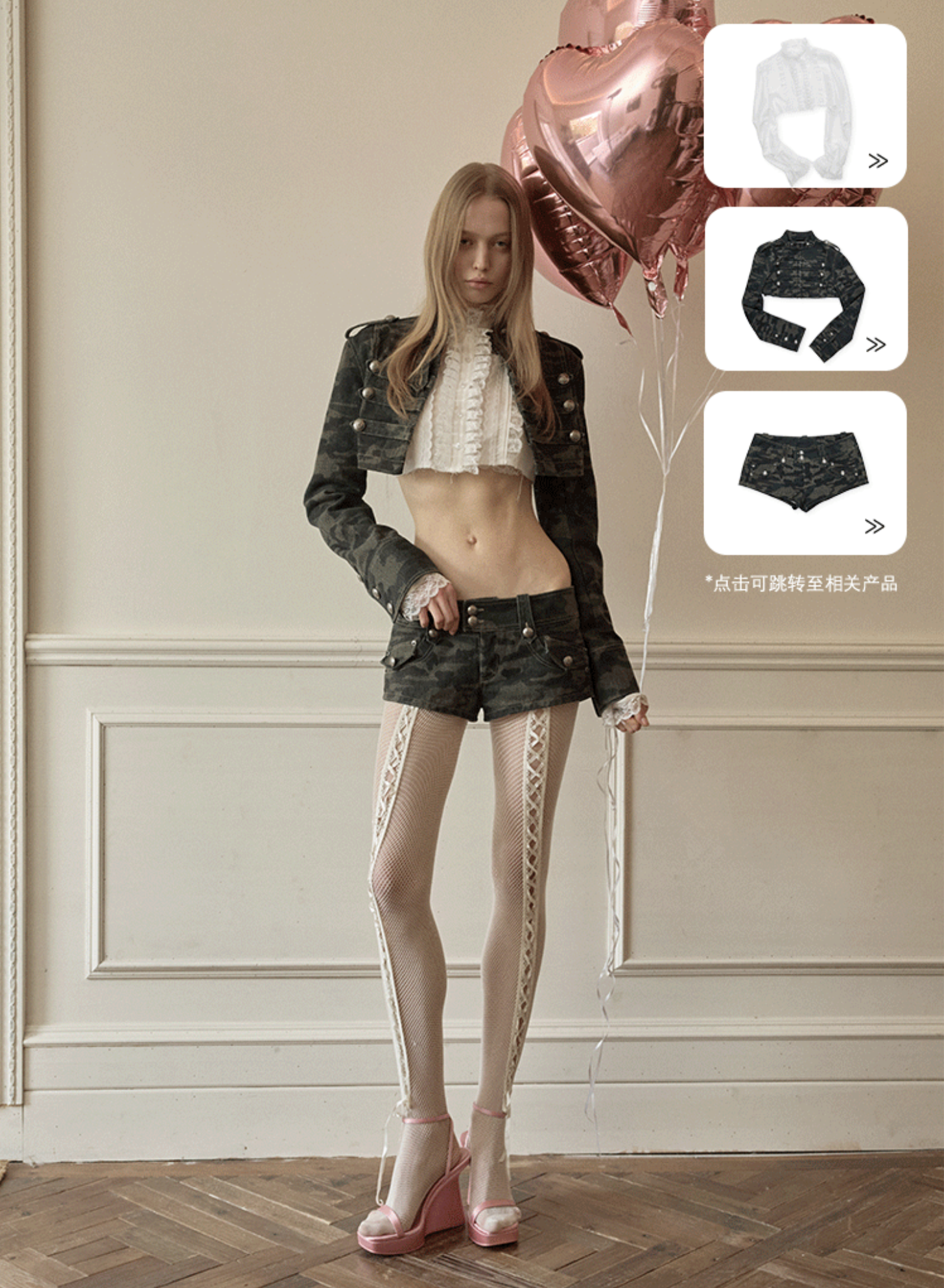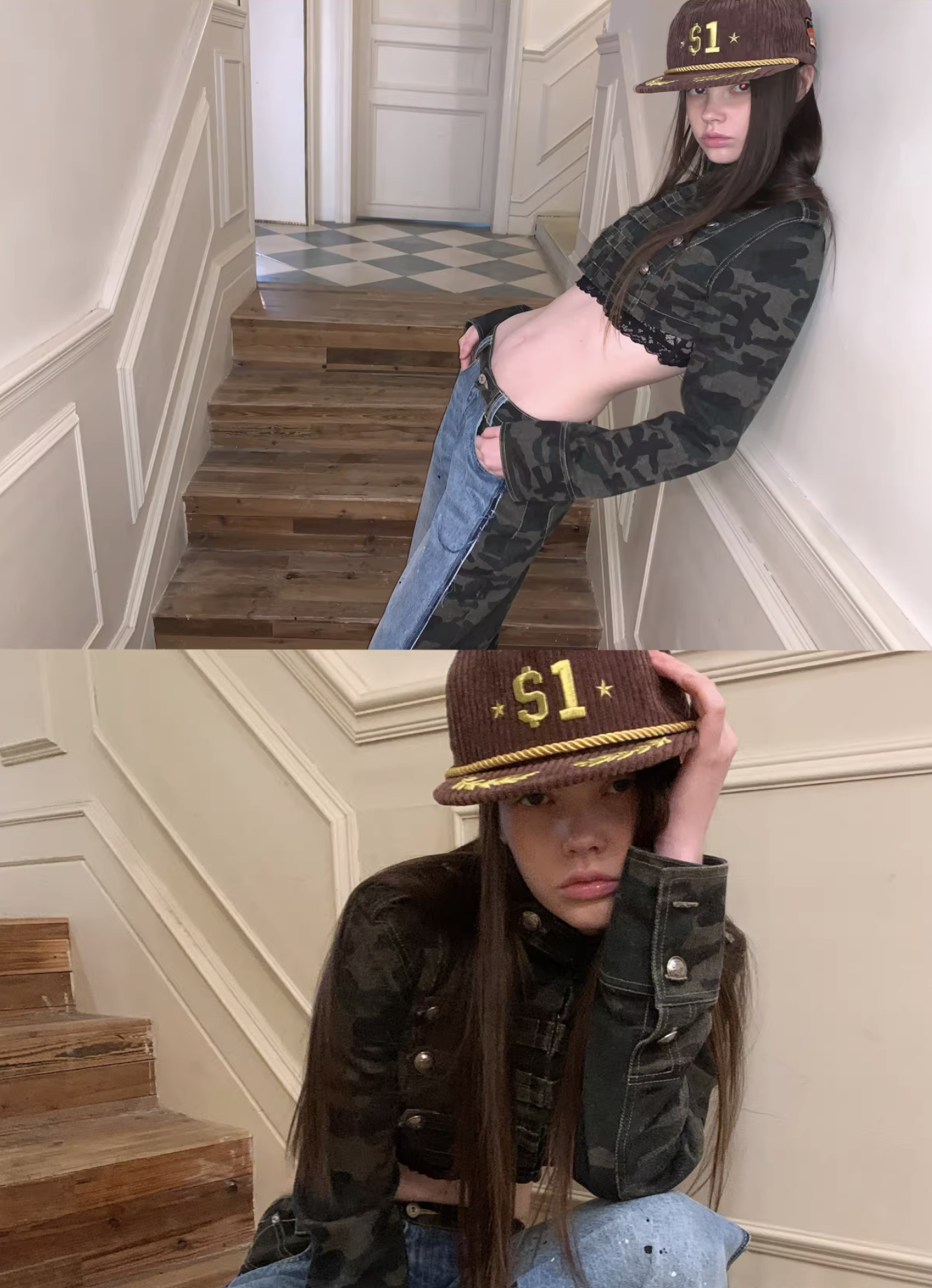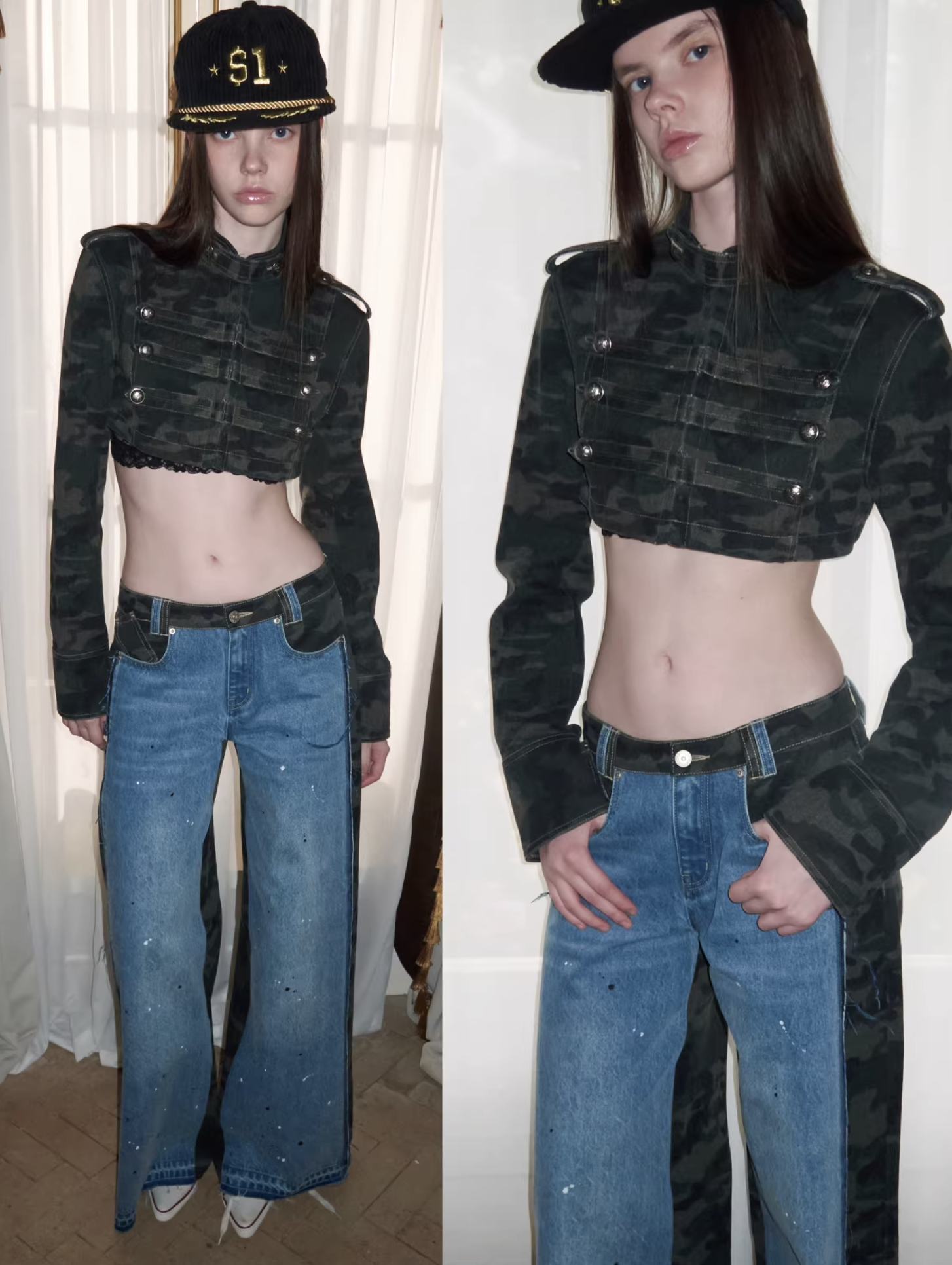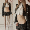 ✰ This coordinated set features a structured cropped jacket paired with matching camouflage shorts, combining vintage military elements with a modern tailored silhouette.