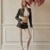 ✰ The matching shorts feature a clean mid-rise waist and compact silhouette, balancing the cropped jacket while maintaining a relaxed streetwear attitude. The minimal structure ensures versatility whether worn as a set or styled separately.