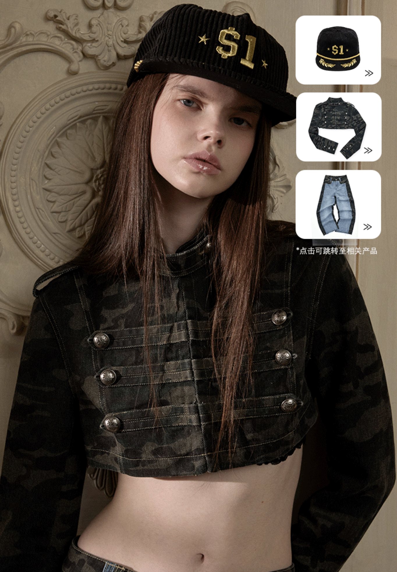 ✰ The cropped jacket is designed with a straight-shoulder structure and a distinctive double-breasted front. The innovative hook closure system keeps the placket clean while allowing easy wear. Vintage-inspired metal buttons decorate the sleeve tabs and cuffs, creating a refined contrast against the rugged camouflage canvas.