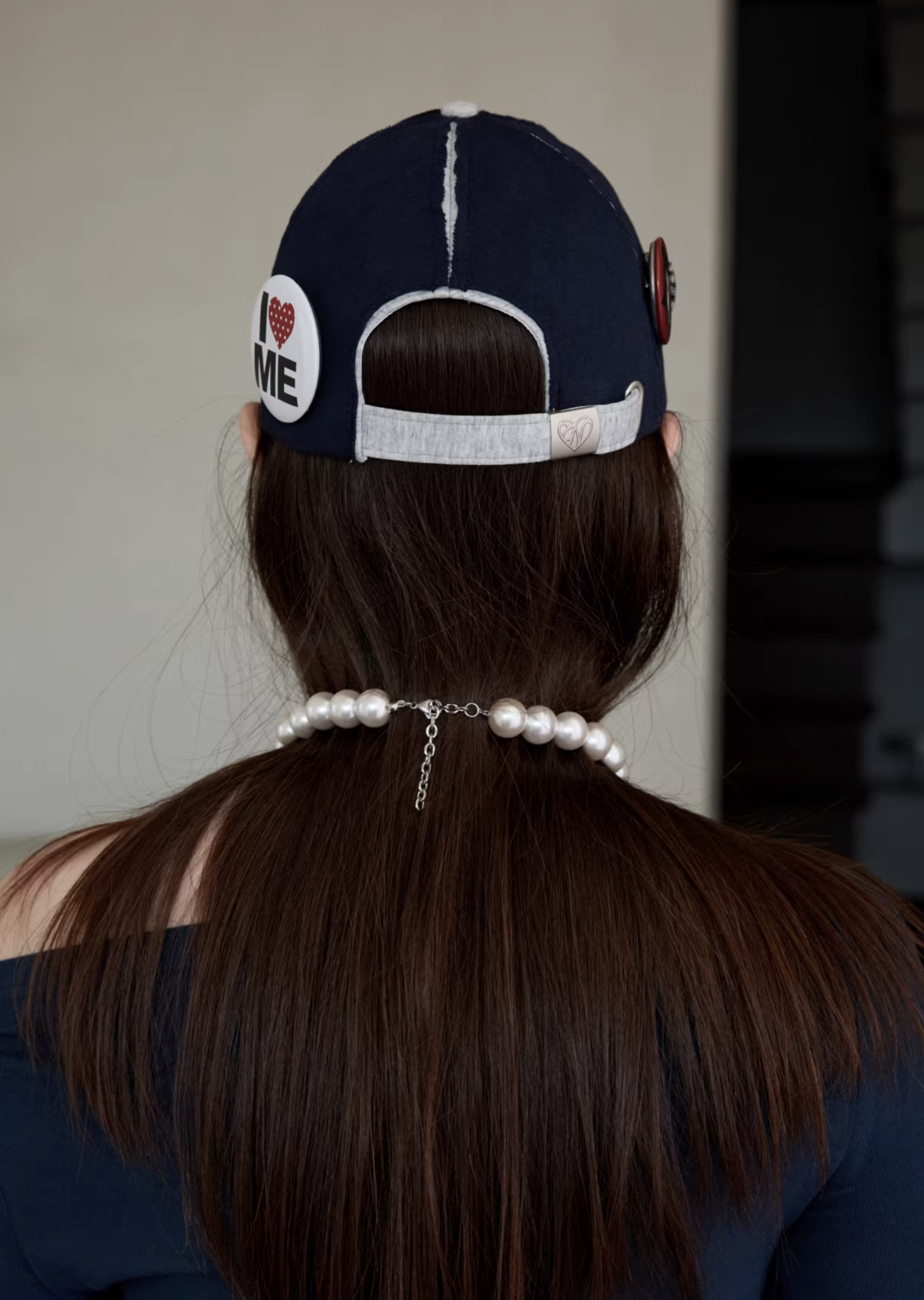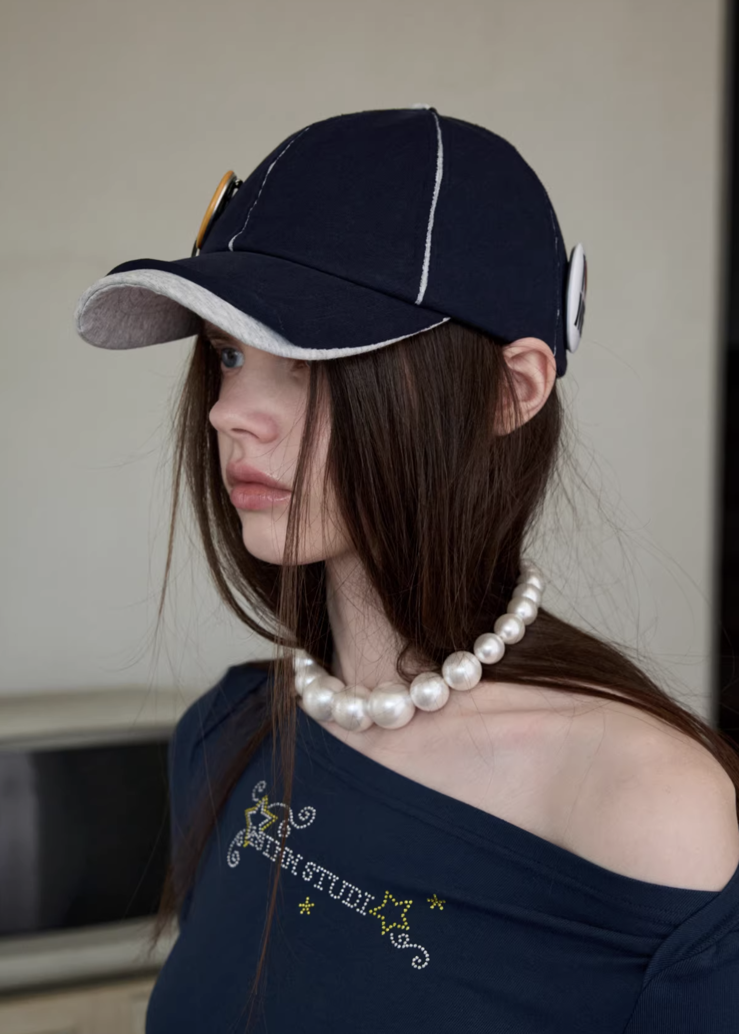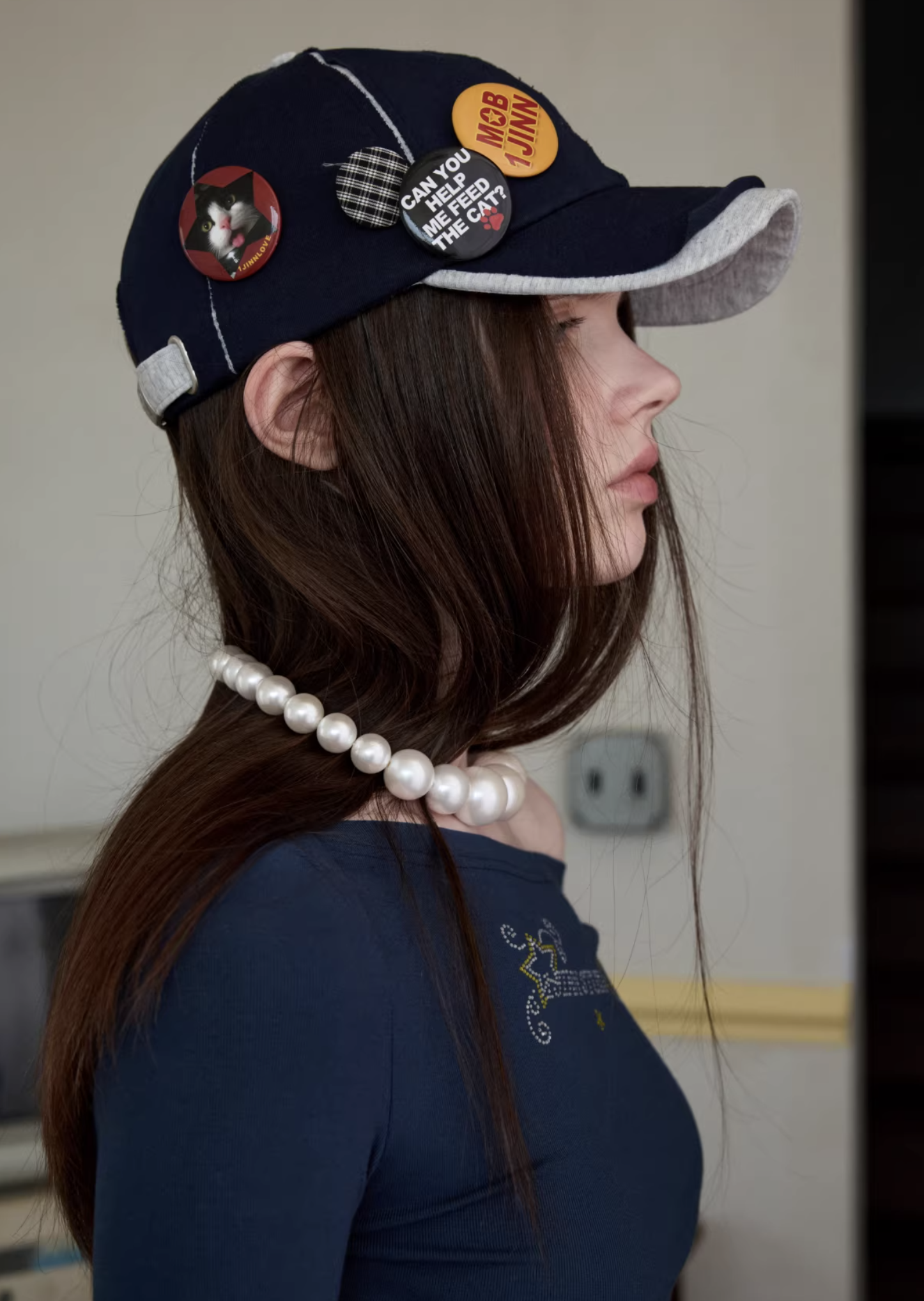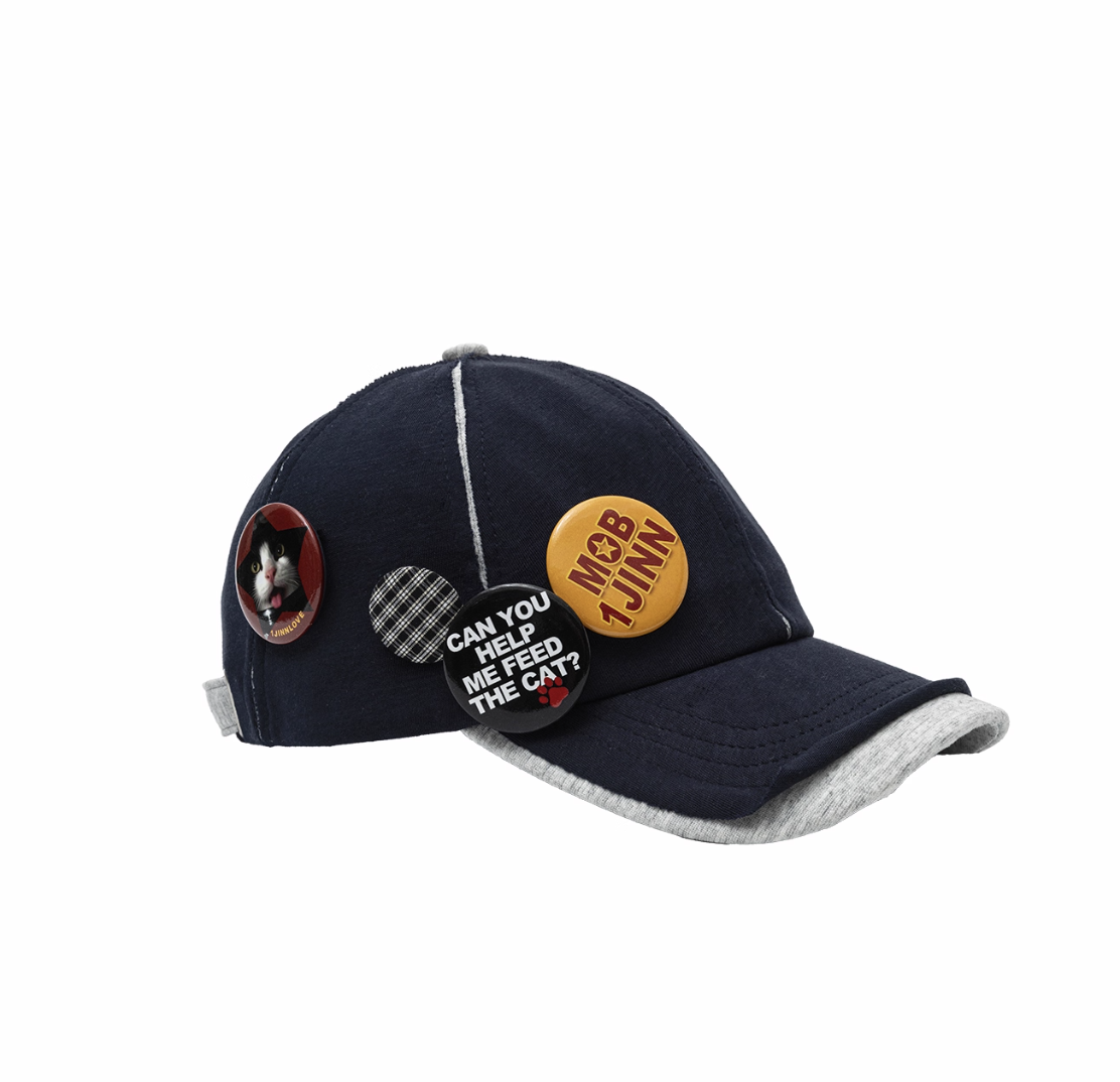 ✰ Soft navy jersey cap with contrast light-blue stitching and striped brim detail. Finished with playful removable pin badges for easy customization and a subtle statement look. Lightweight construction with a smooth inner band for comfort, and durable panel stitching to keep its shape. Adjustable fit at the back—clean, casual, and designed to add personality from every angle.