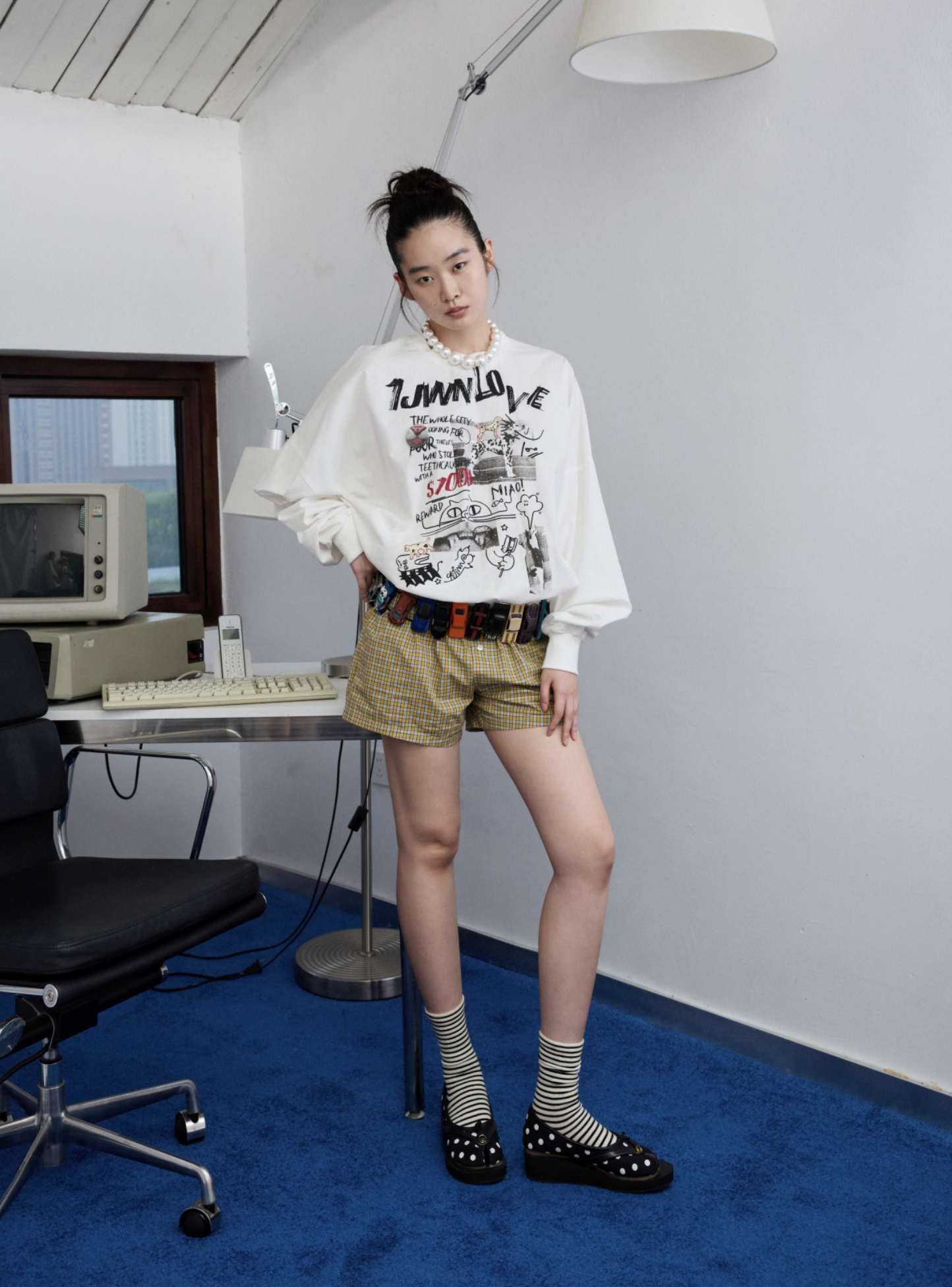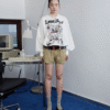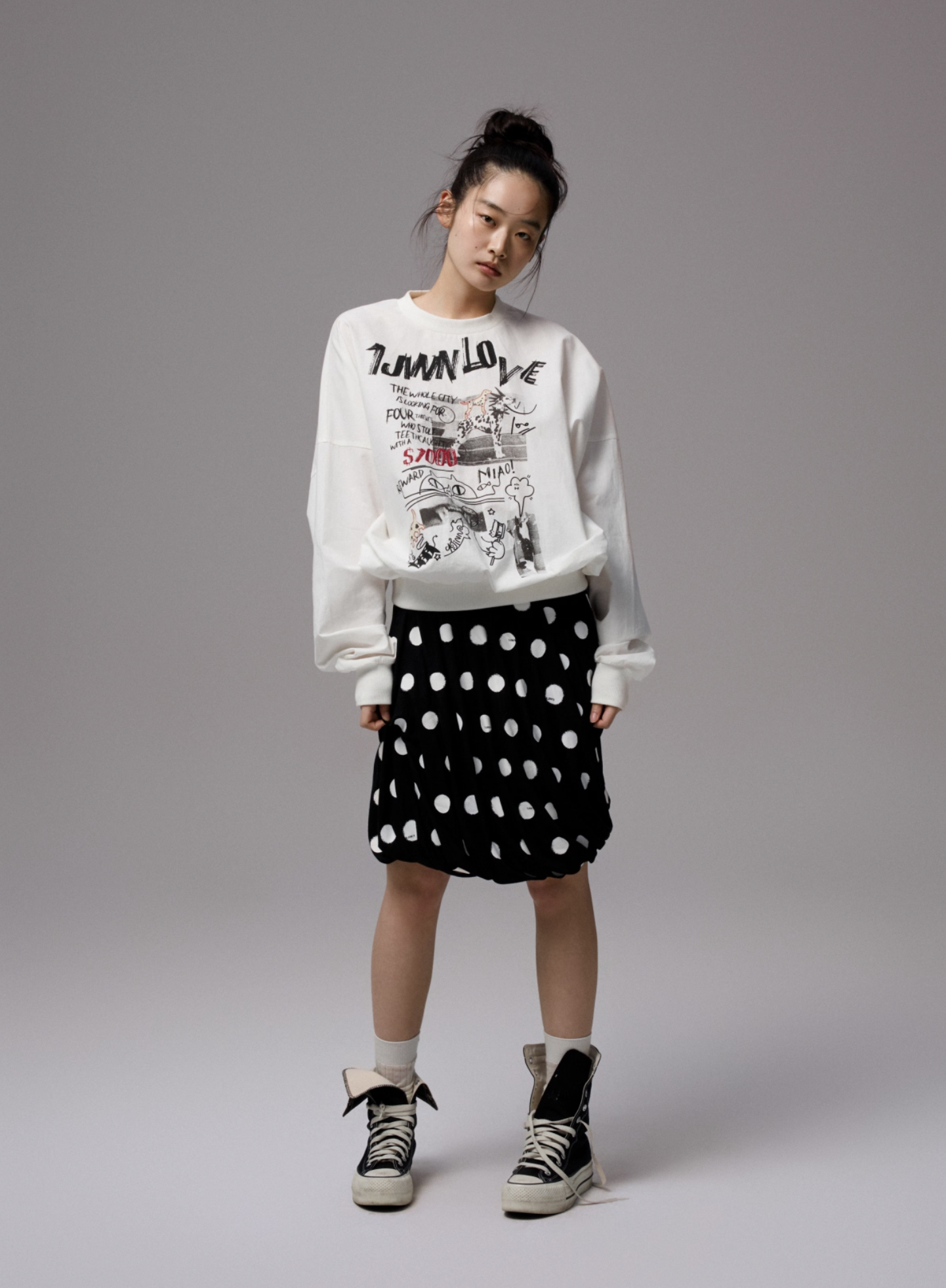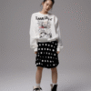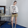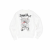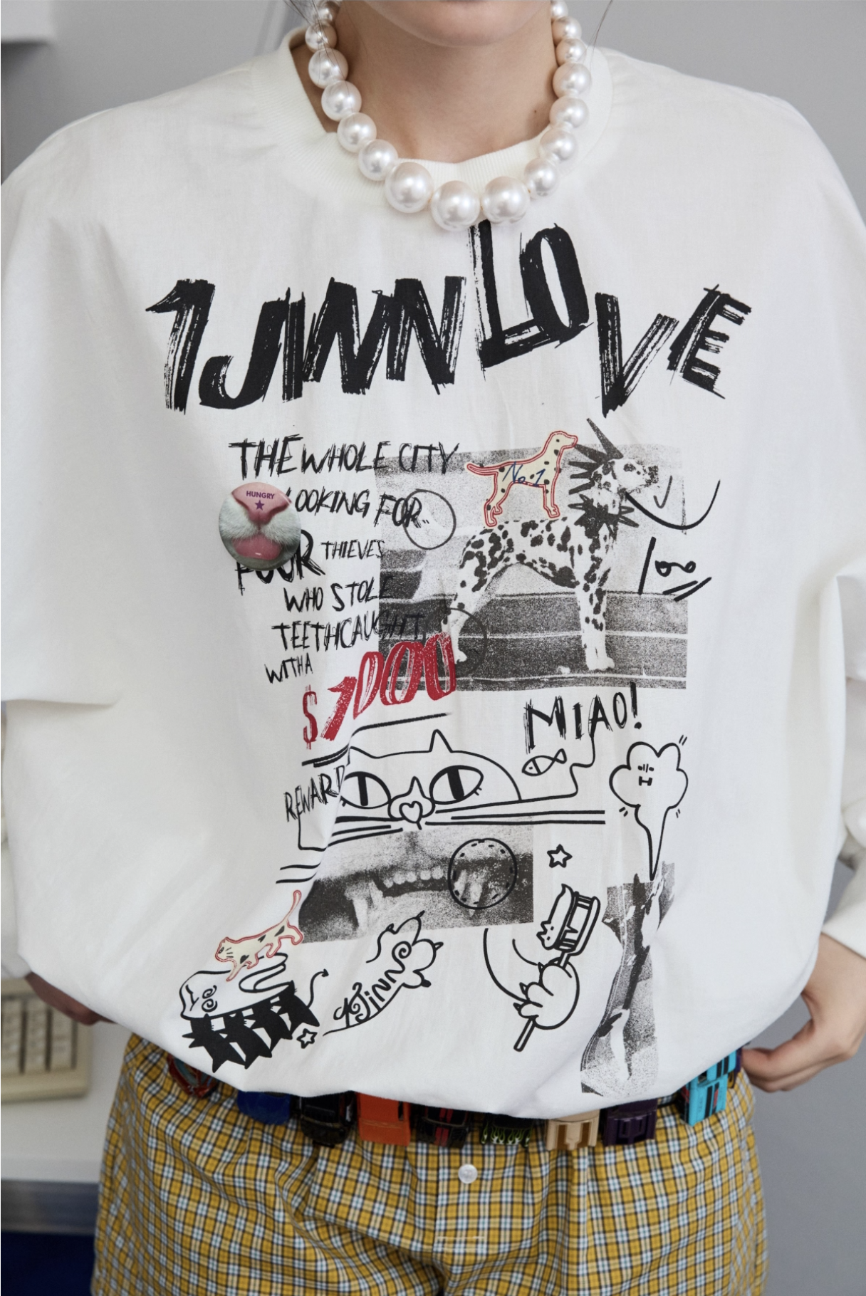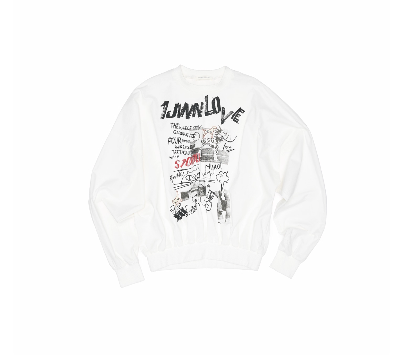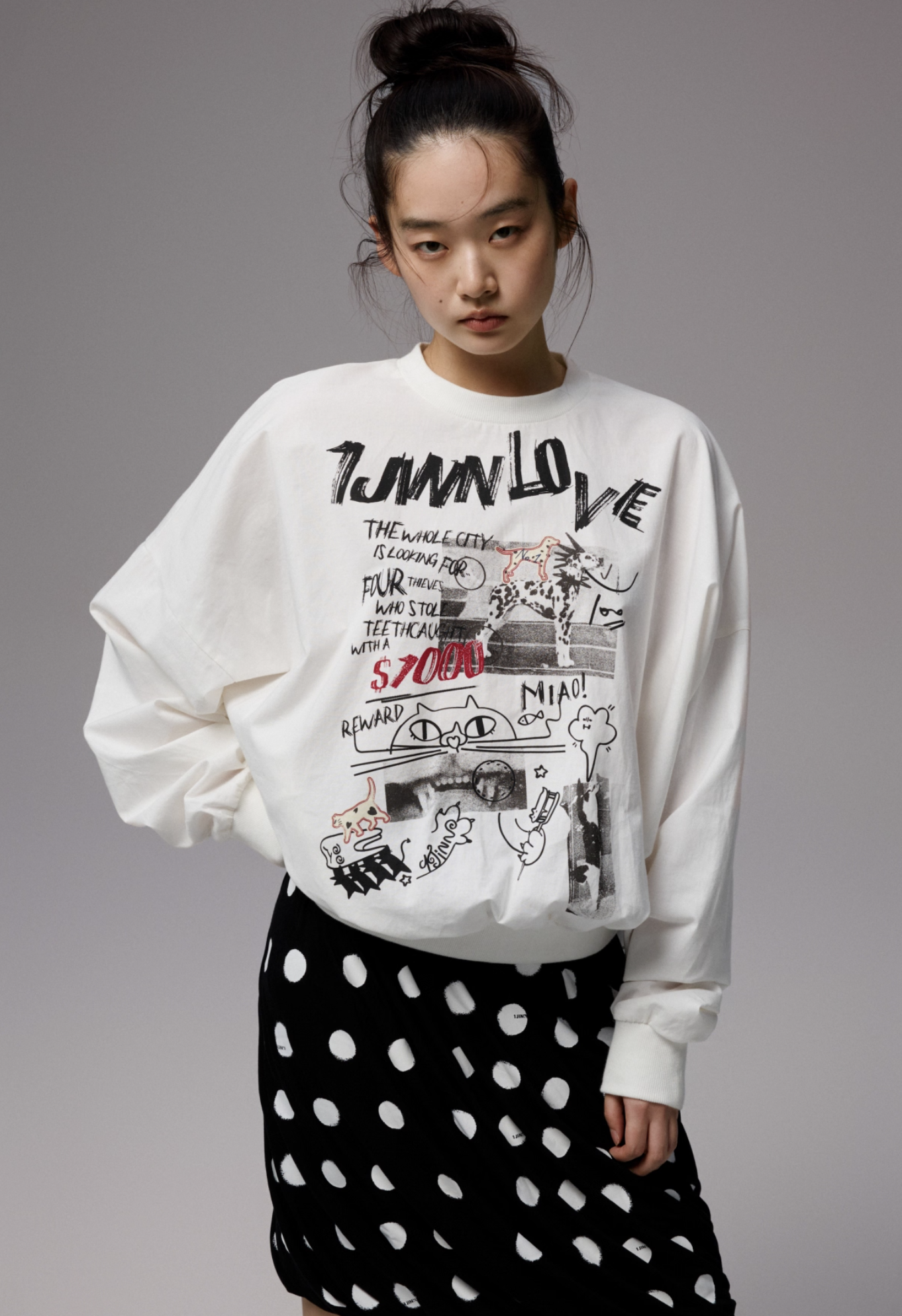 ✰ Oversized white long-sleeve sweatshirt/pullover with black graphic print, including text that reads “I WANT LOVE” and “THE WHOLE CITY IS LOOKING FOR FOUR THIEVES WHO STOLE TO THE CROWN WITH A $7000 REWARD.” It also features cartoonish doodle-style drawings and “MIAO!”