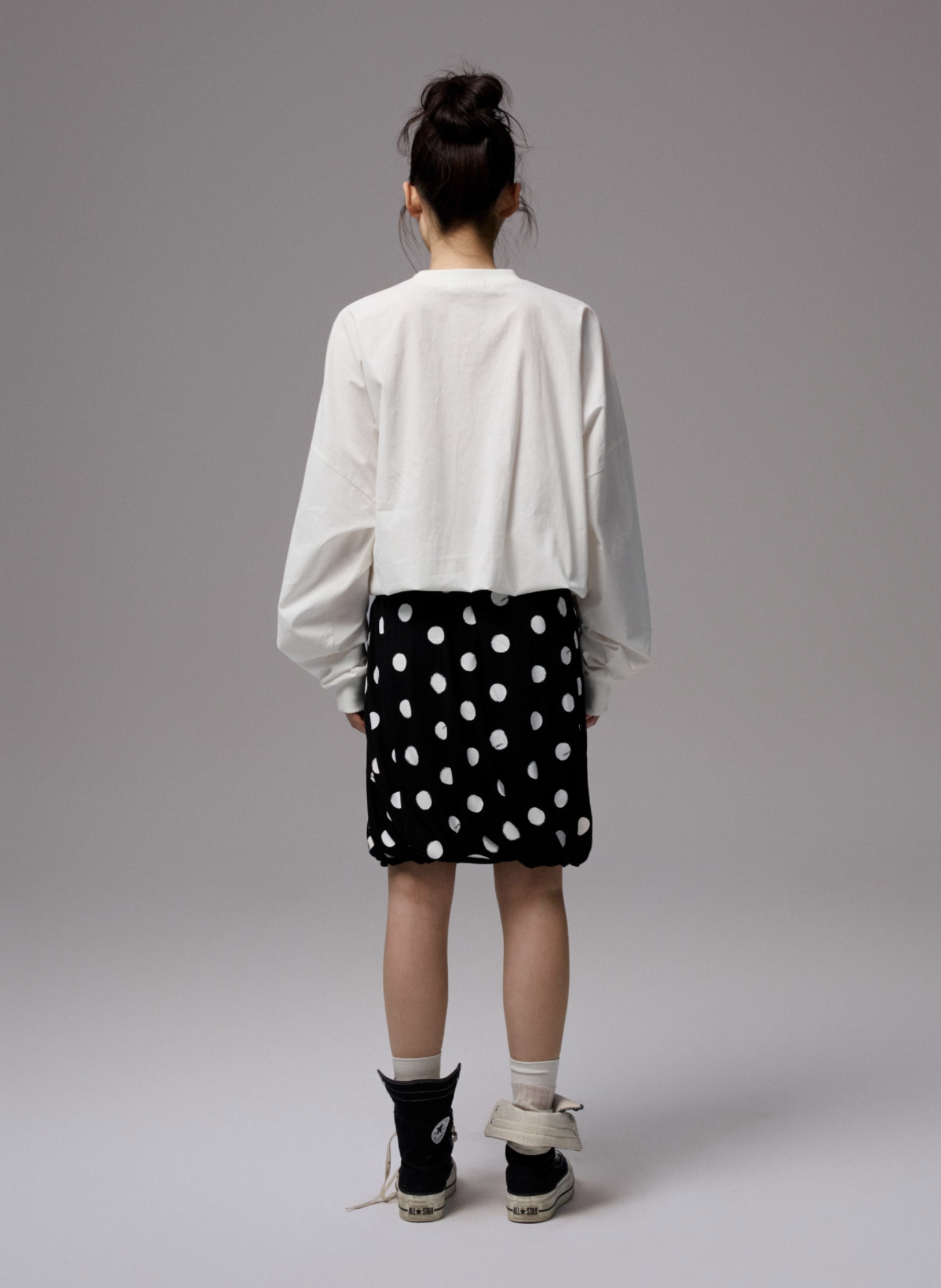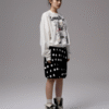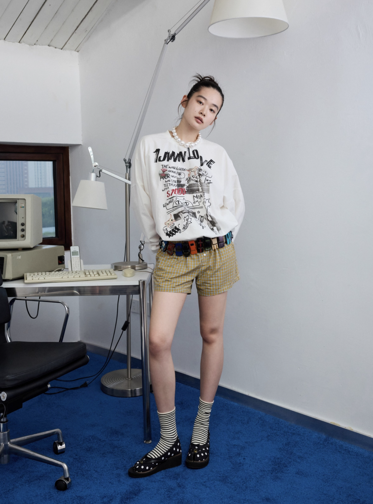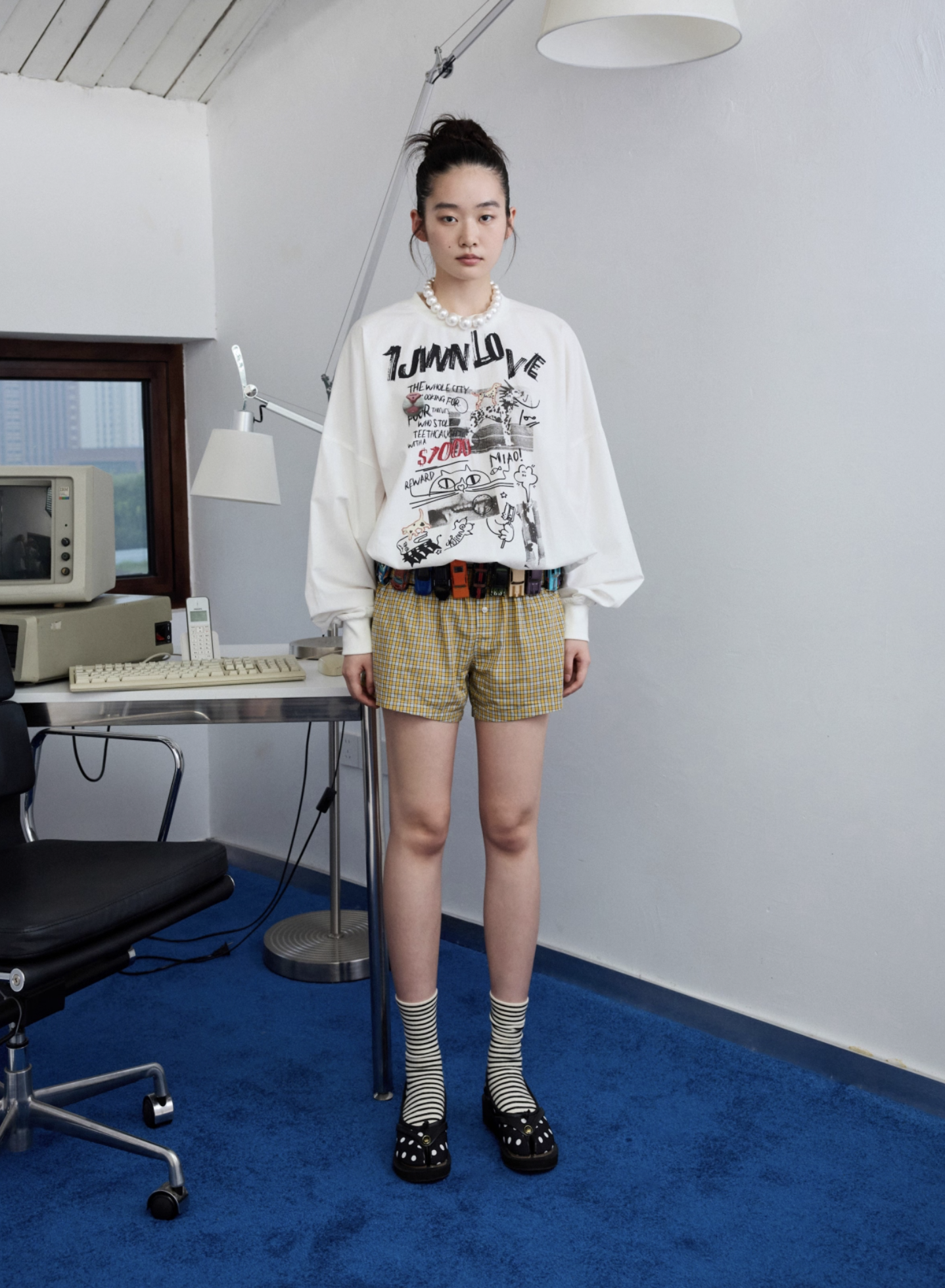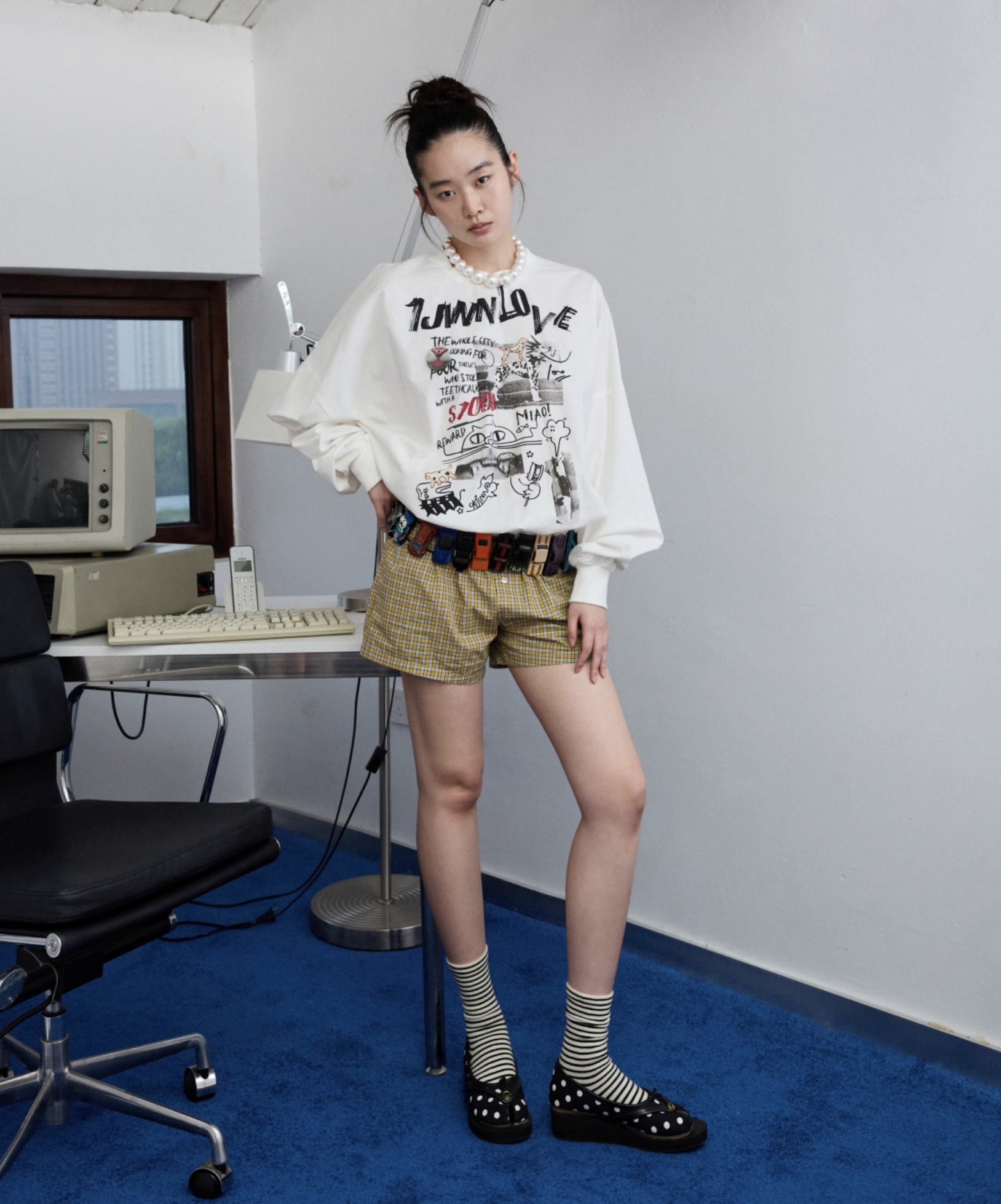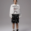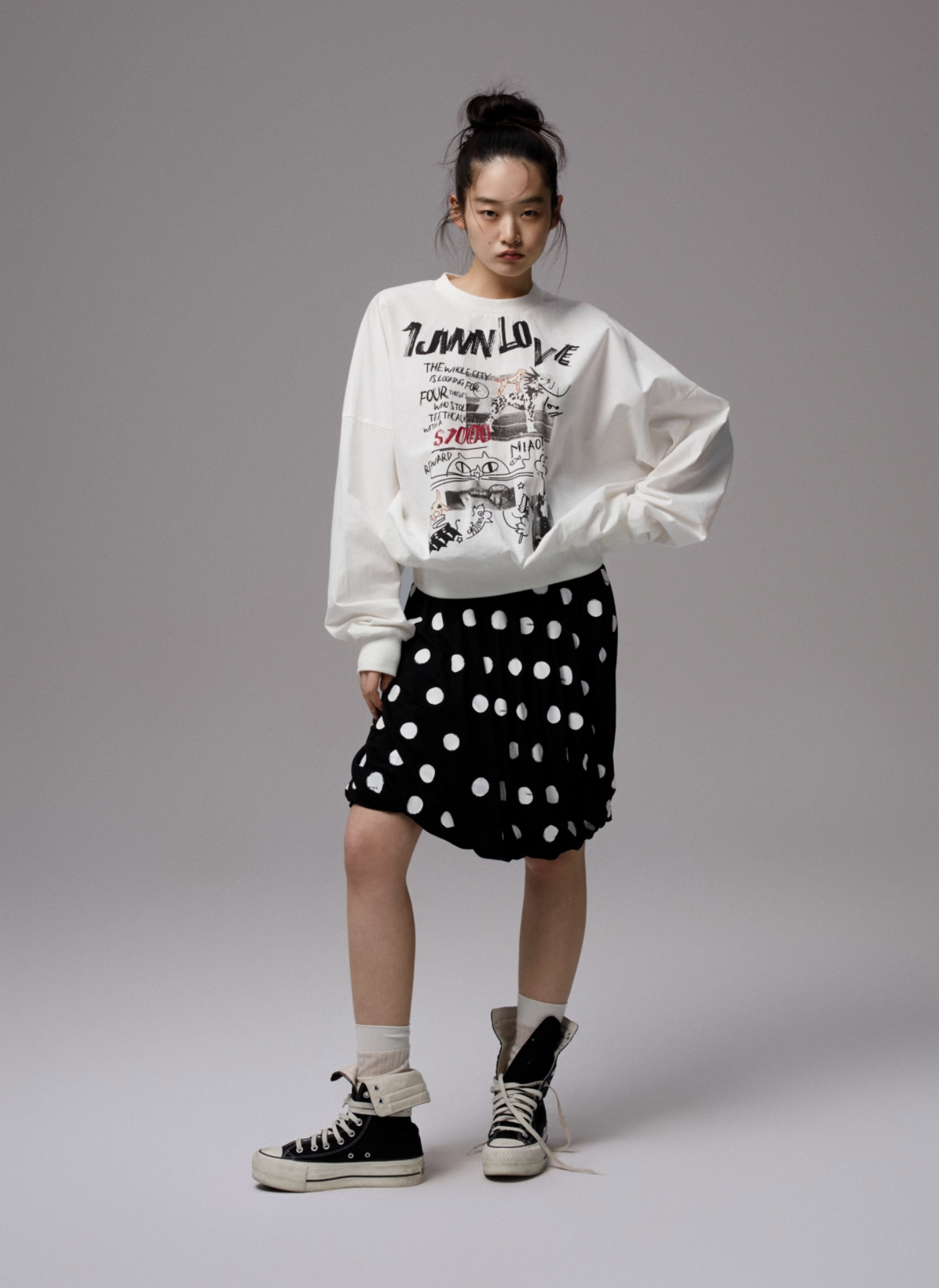 ✰ Oversized white long-sleeve sweatshirt/pullover with black graphic print, including text that reads “I WANT LOVE” and “THE WHOLE CITY IS LOOKING FOR FOUR THIEVES WHO STOLE TO THE CROWN WITH A $7000 REWARD.” It also features cartoonish doodle-style drawings and “MIAO!”