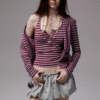 ✰ Stripe vest, featuring a tight and waist cinching fit that perfectly shapes the waist curve. The henley neckline is paired with an exquisite wrapped button design, making it more casual and practical. The back has an exclusive custom cat tooth logo decoration, adding a touch of delicacy and cuteness.