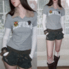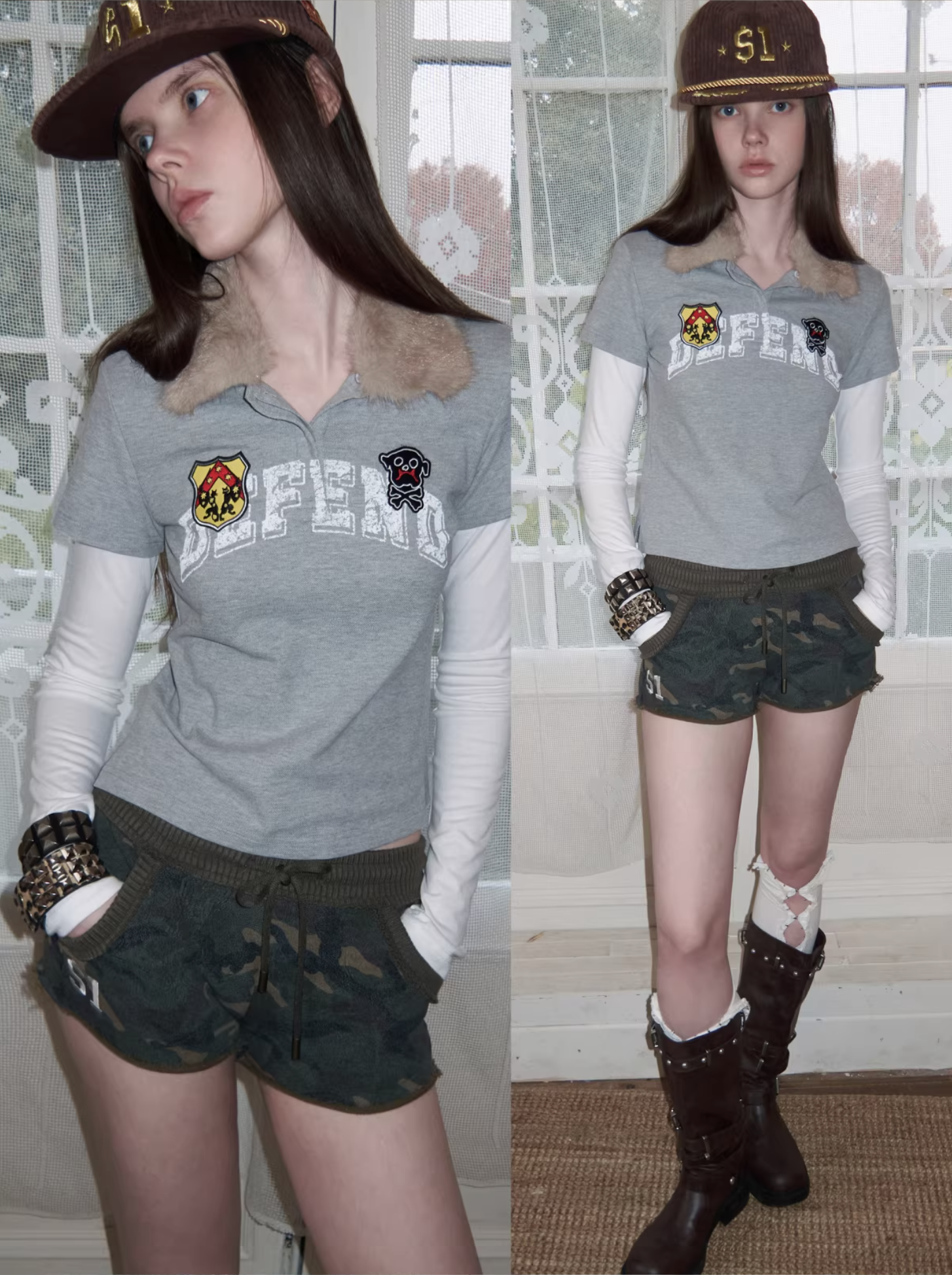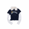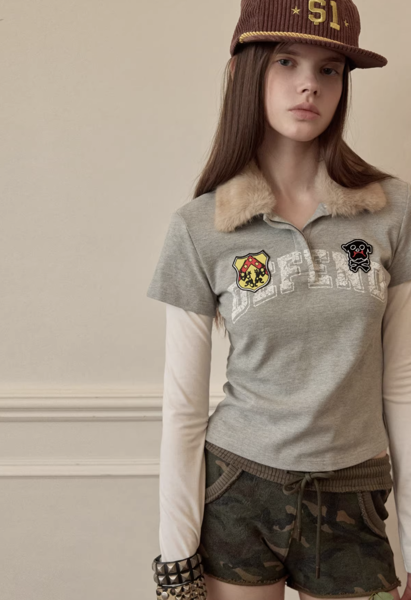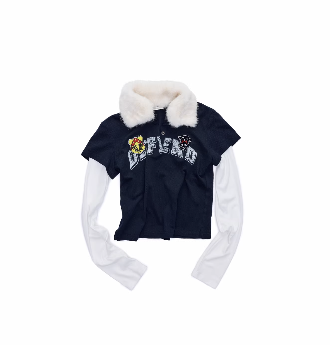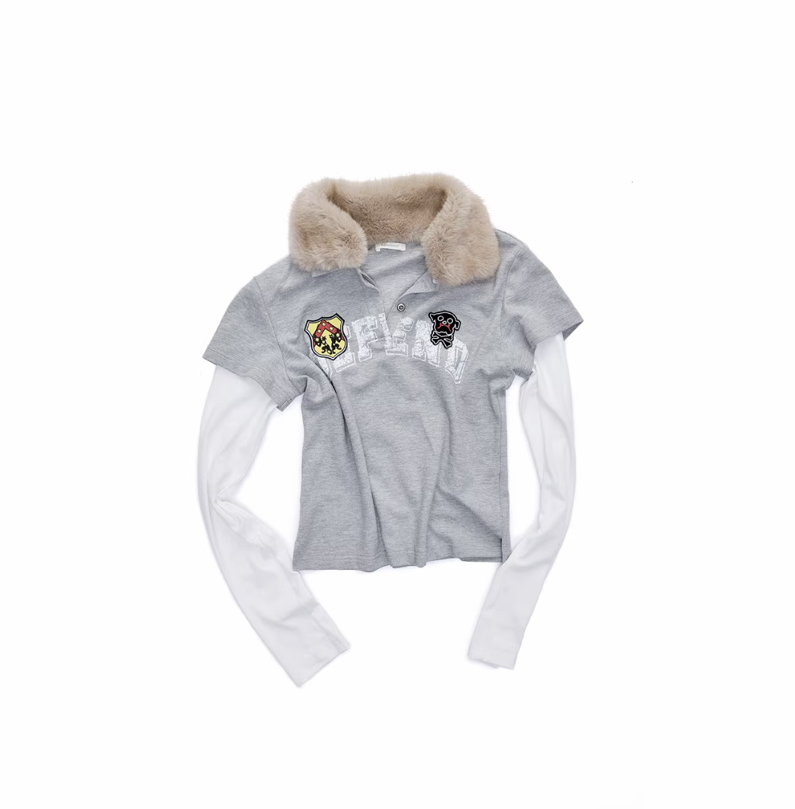 ✰ A playful layered top combining a short-sleeve polo with built-in long sleeves, finished with a soft faux-fur collar with a detachable and bold patch/logo details for that Y2K-meets-preppy edge. Crafted from textured cotton piqué fabric, the material offers a breathable and comfortable feel while maintaining a structured appearance. The natural texture enhances both durability and everyday wearability. Style it with cargos or mini skirts for a fun contrast, or pair with denim for an effortless everyday look.