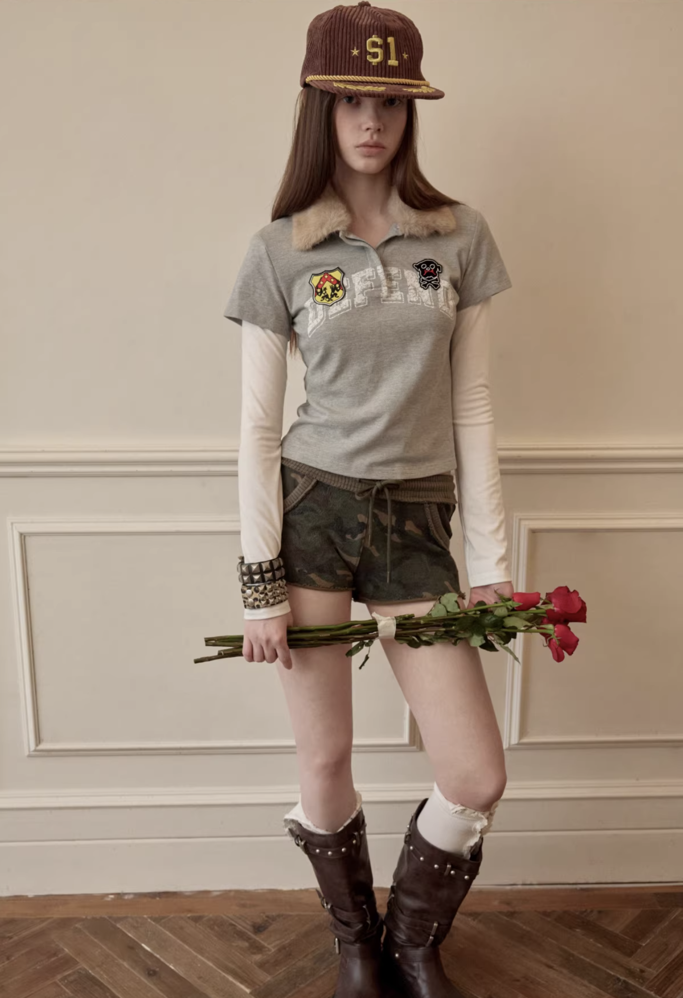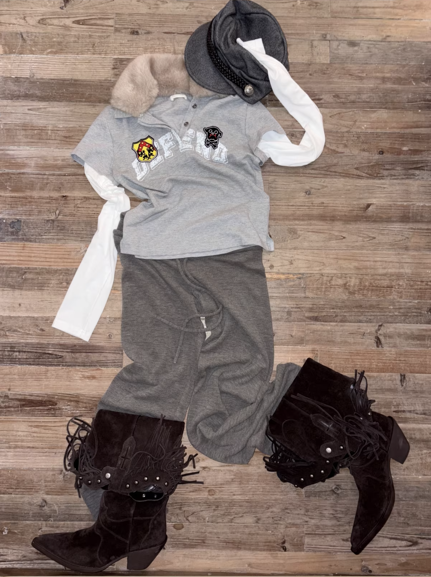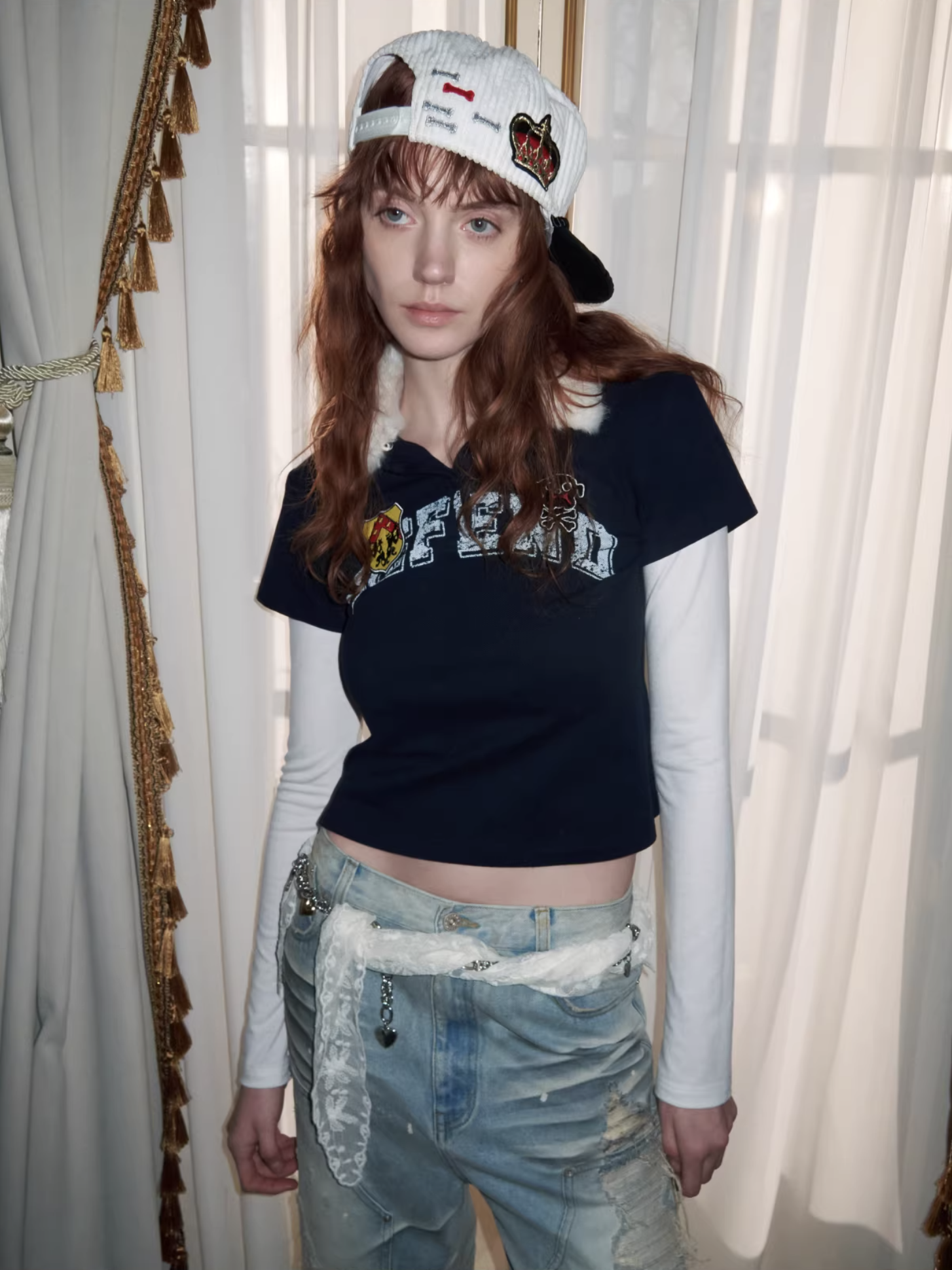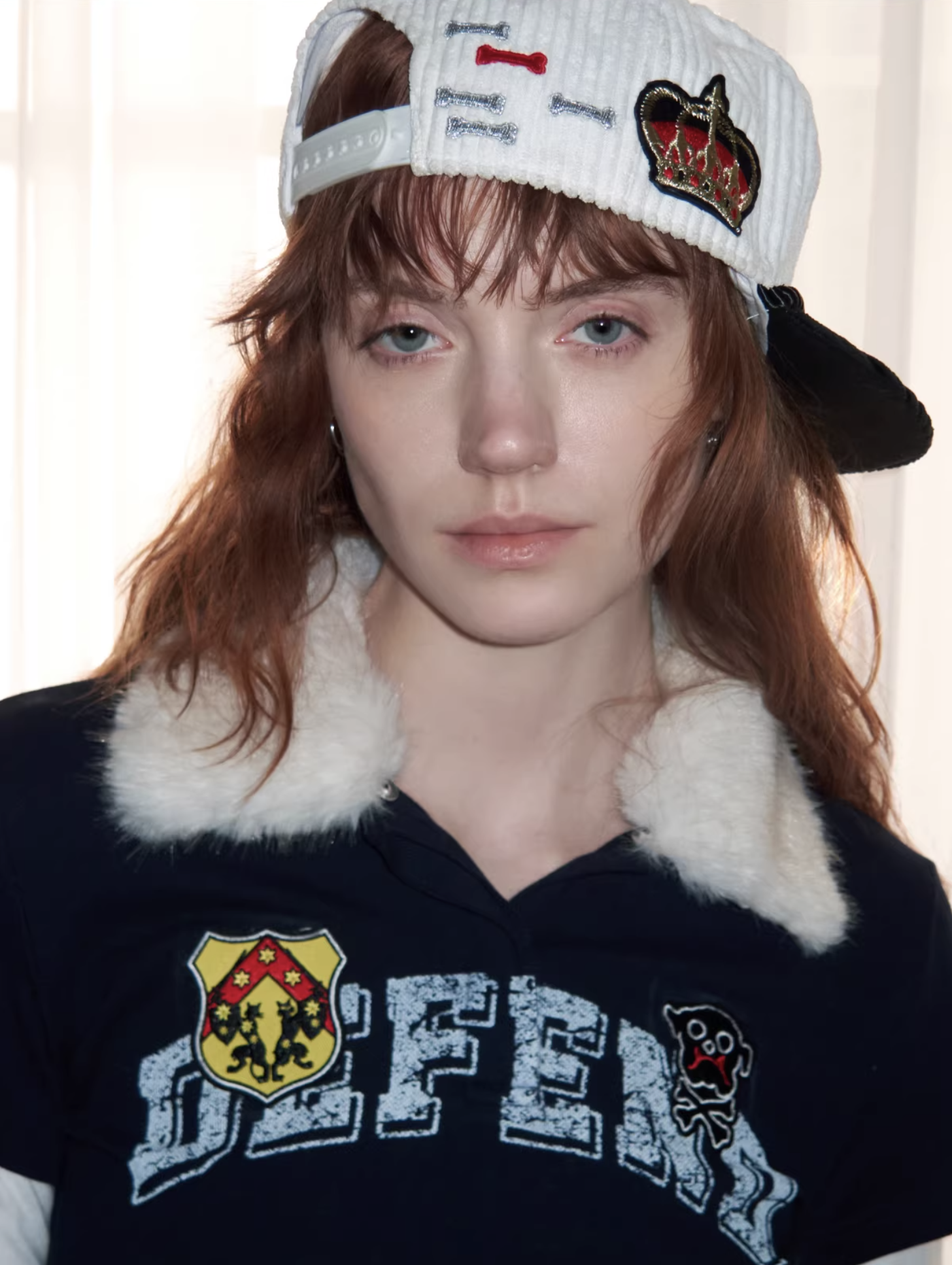 ✰ A playful layered top combining a short-sleeve polo with built-in long sleeves, finished with a soft faux-fur collar with a detachable and bold patch/logo details for that Y2K-meets-preppy edge. Crafted from textured cotton piqué fabric, the material offers a breathable and comfortable feel while maintaining a structured appearance. The natural texture enhances both durability and everyday wearability. Style it with cargos or mini skirts for a fun contrast, or pair with denim for an effortless everyday look.