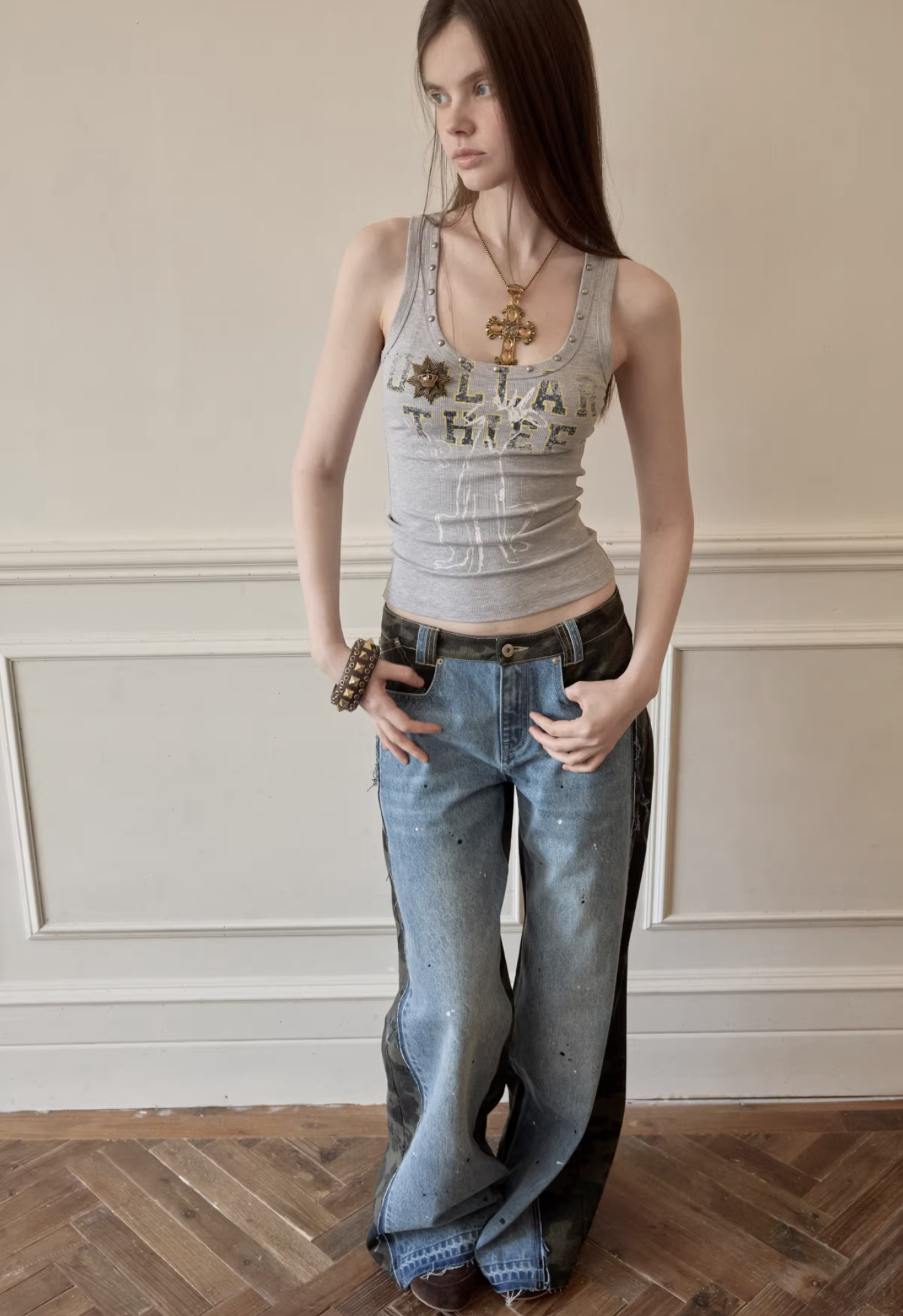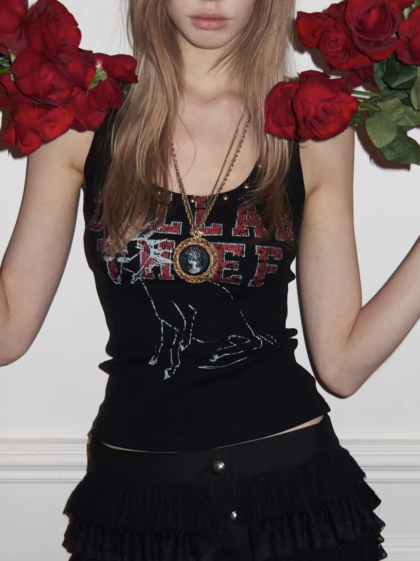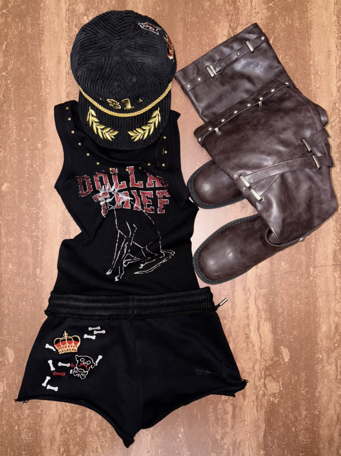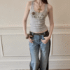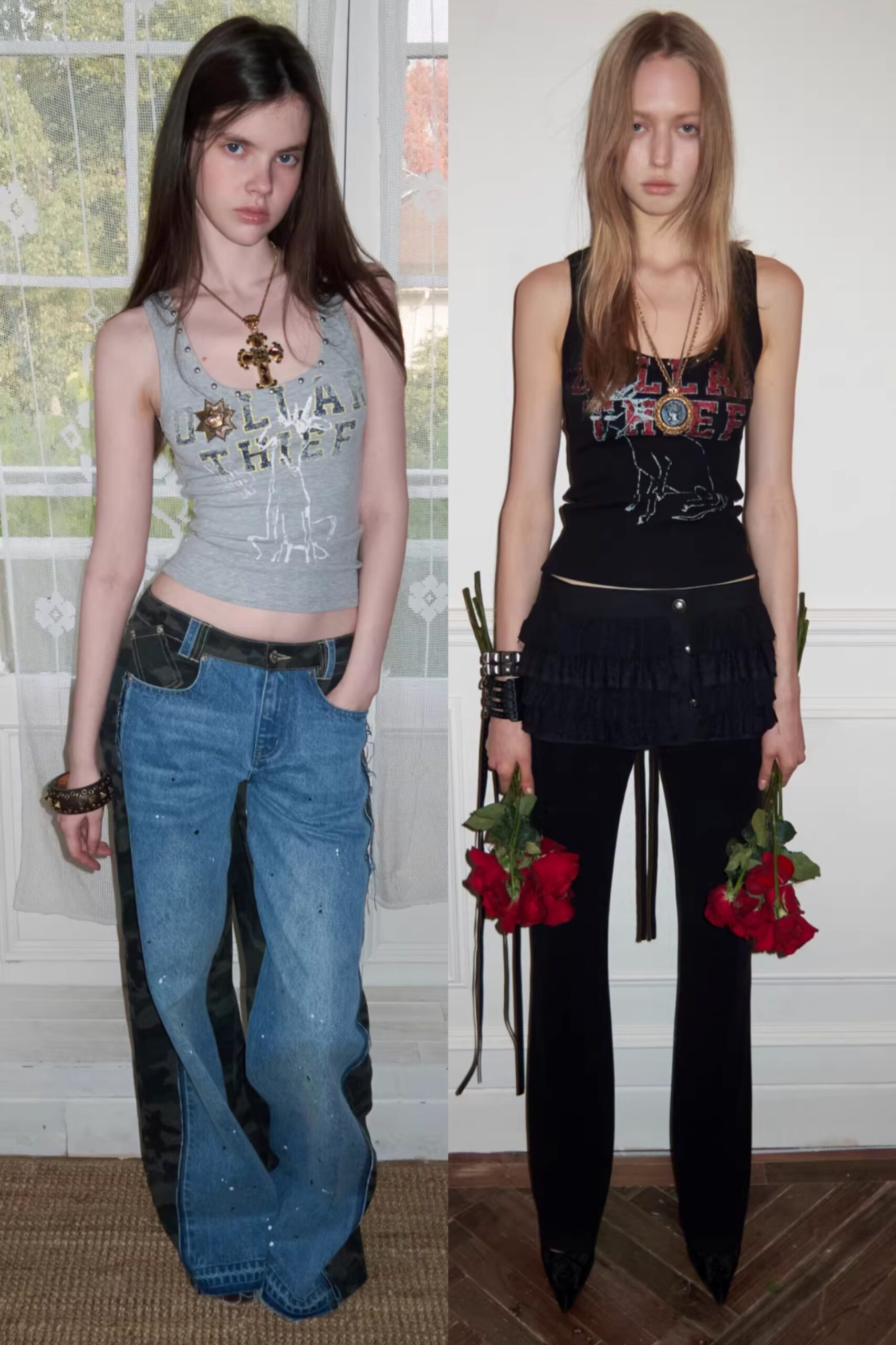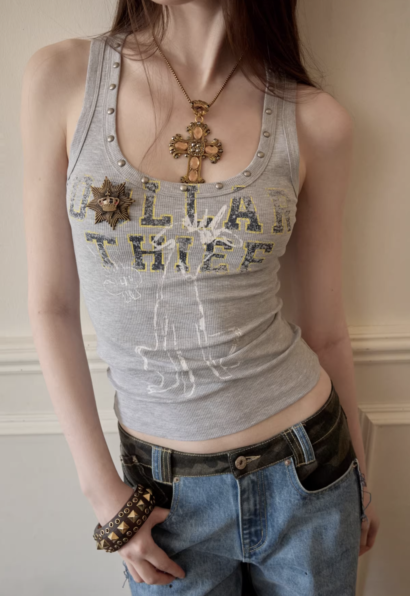 ✰ A fitted tank with bold “Dollar Thief” graphic and studded neckline for that effortless Y2K grunge attitude. Made from stretch ribbed knit fabric, the material offers a soft, comfortable feel while contouring naturally to the body. The breathable cotton-blend fabric ensures ease of movement and everyday wearability.