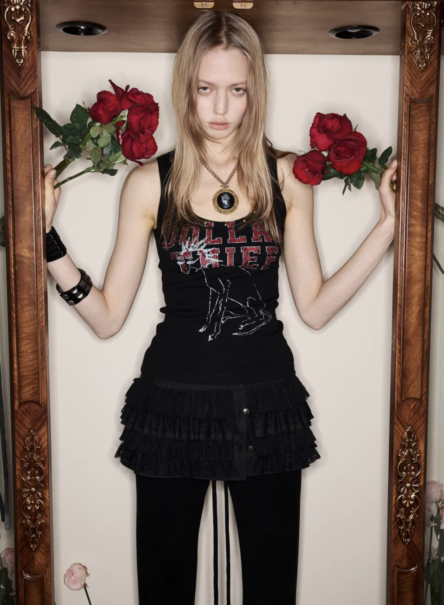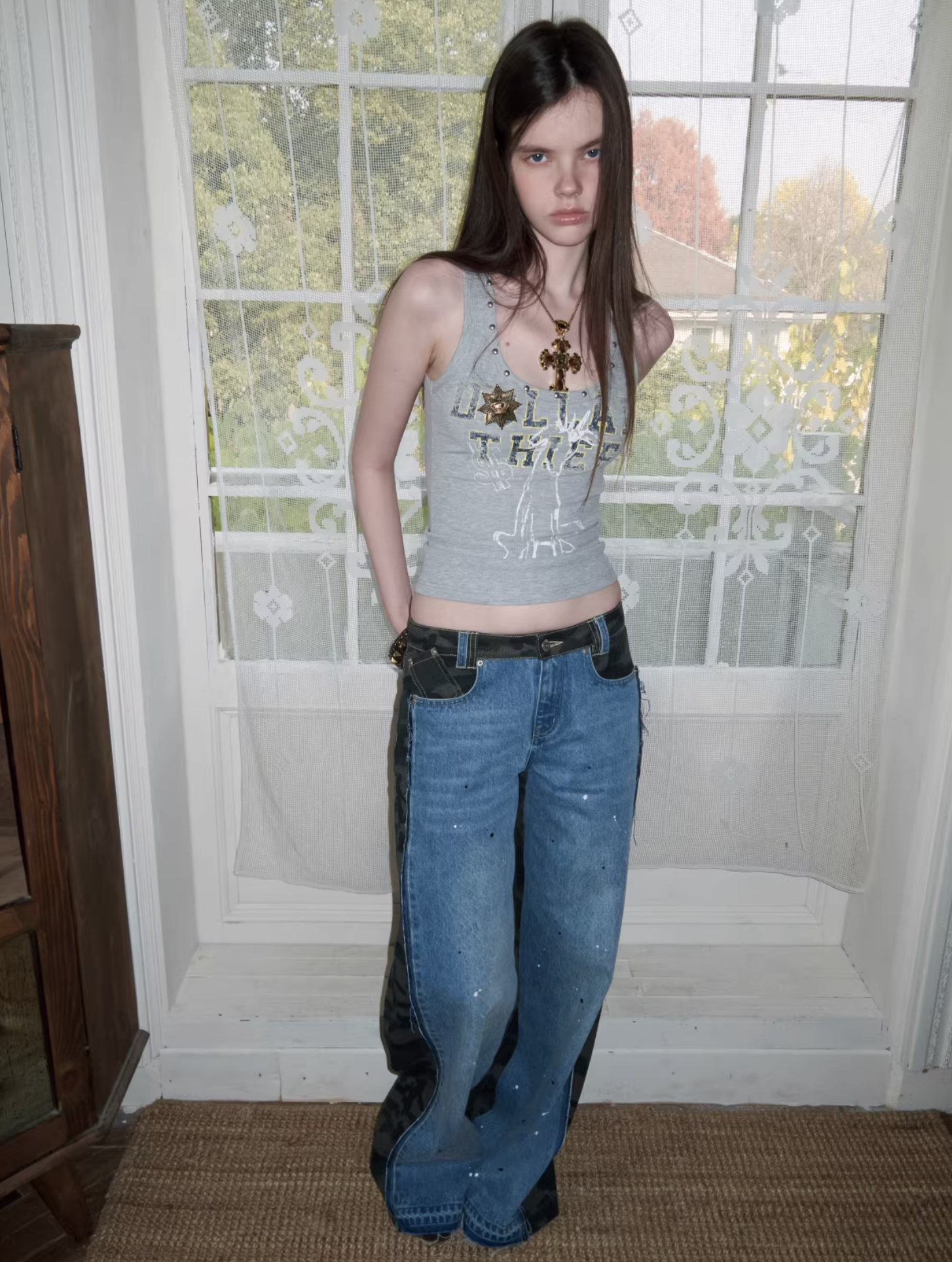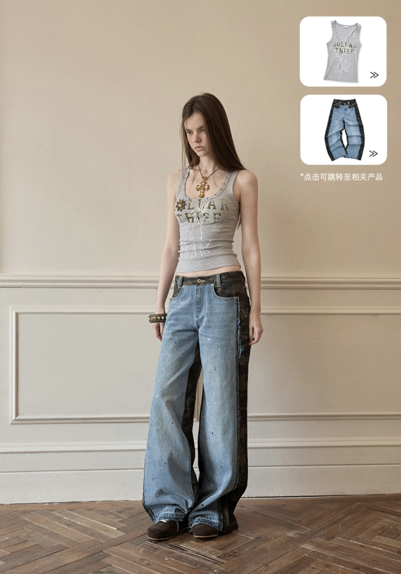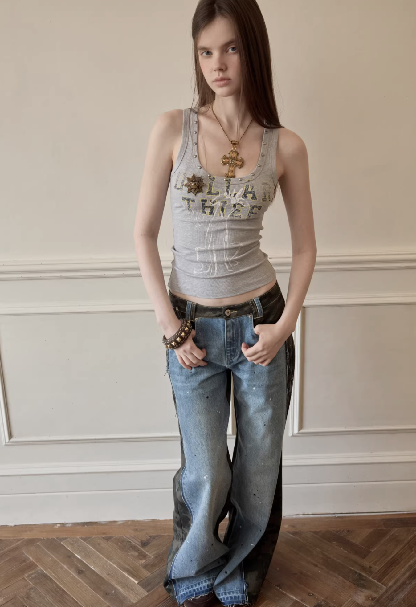 ✰ A fitted tank with bold “Dollar Thief” graphic and studded neckline for that effortless Y2K grunge attitude. Made from stretch ribbed knit fabric, the material offers a soft, comfortable feel while contouring naturally to the body. The breathable cotton-blend fabric ensures ease of movement and everyday wearability.