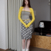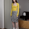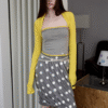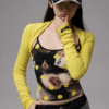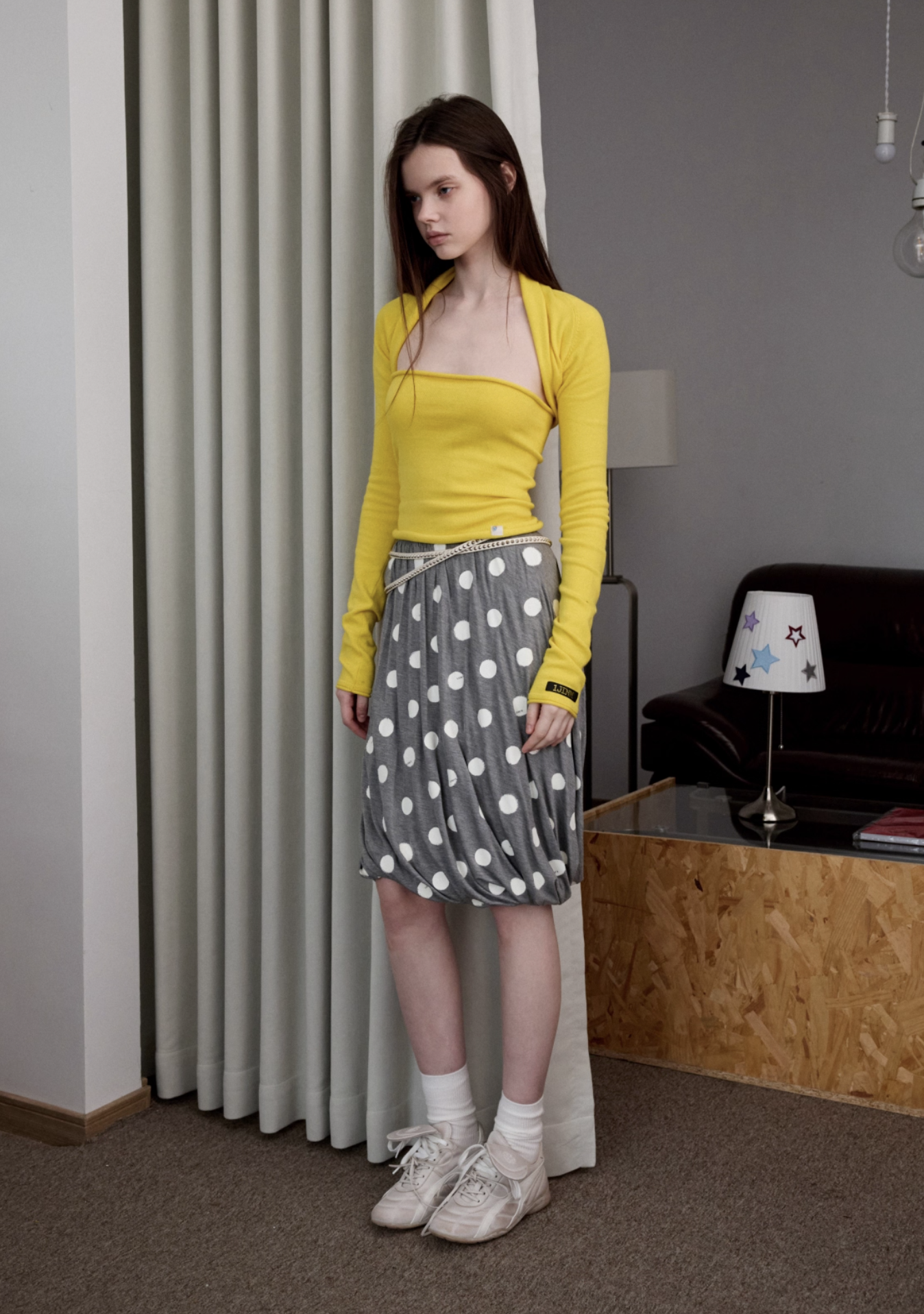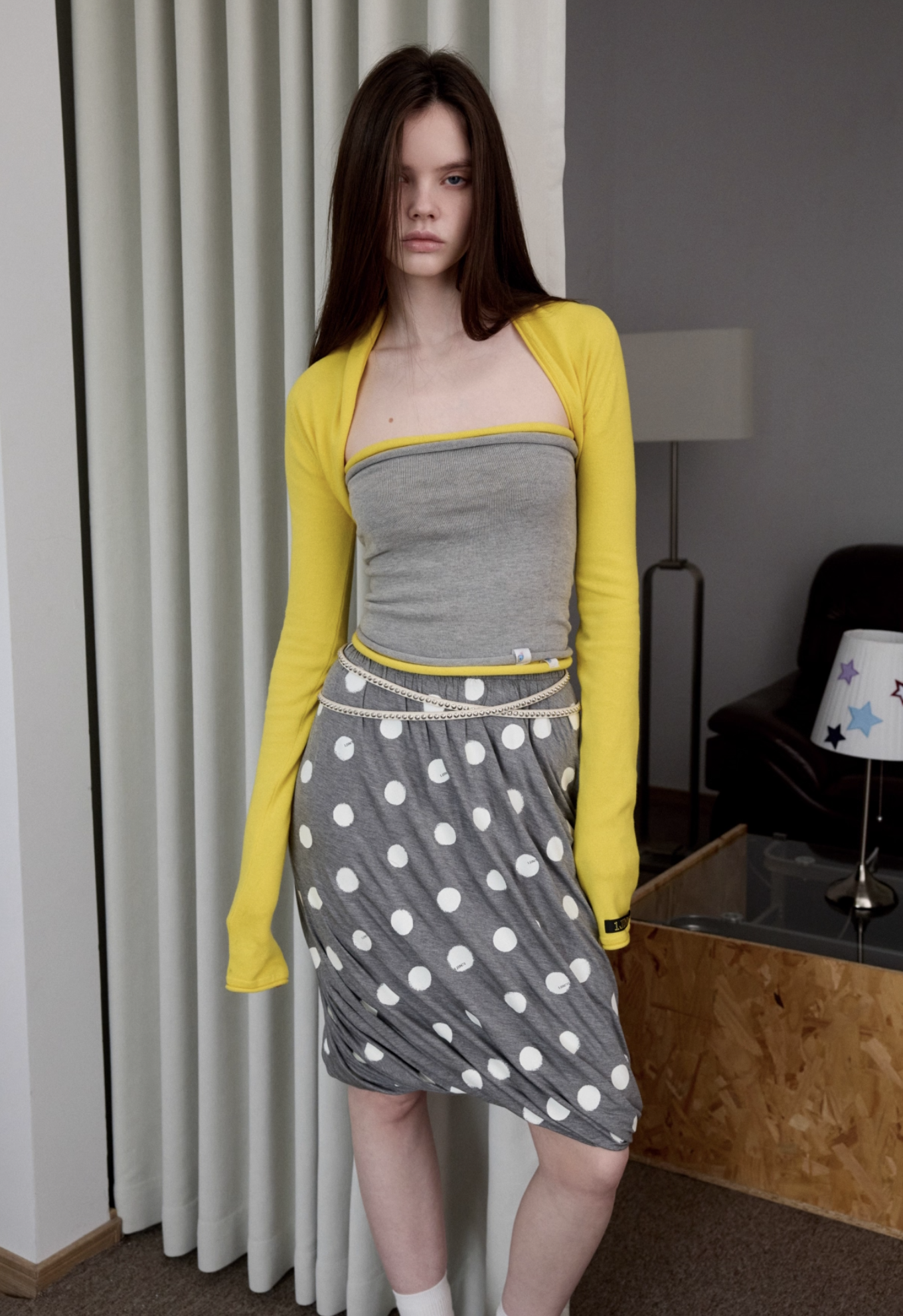 ✰ Yellow cropped long-sleeve shrug/bolero with bandeau rolled edge processing and one-piece seamless technology. The yarn has good resilience and can be freely switched between bandeau or half-skirt wearing methods. The solid color basic style easily enables multiple layering possibilities, naturally outlines the shoulder and neck lines, making it slim. Pair it with our polka dot black cat camisole for playful look.