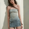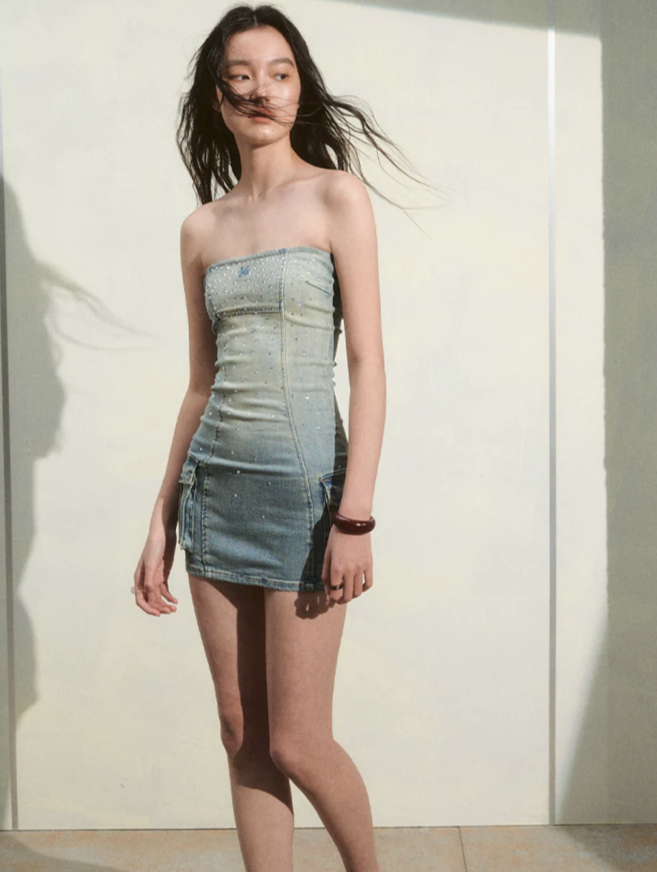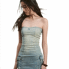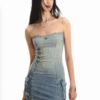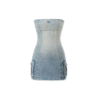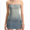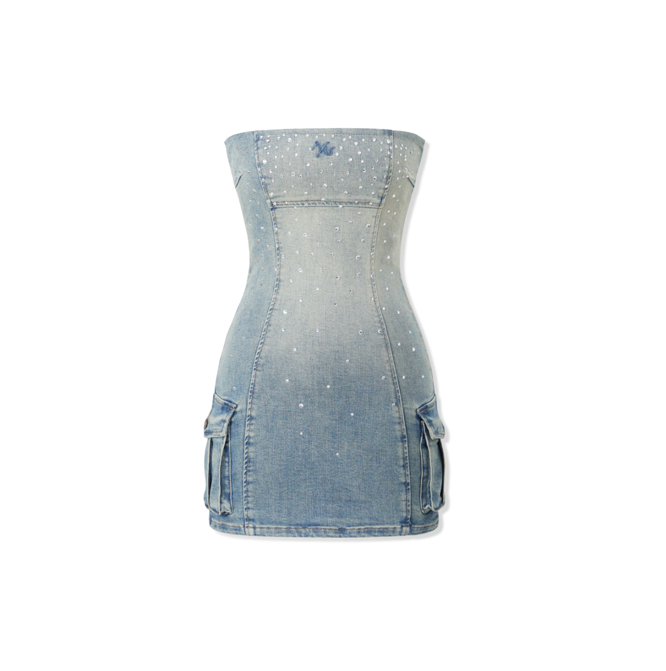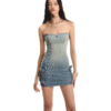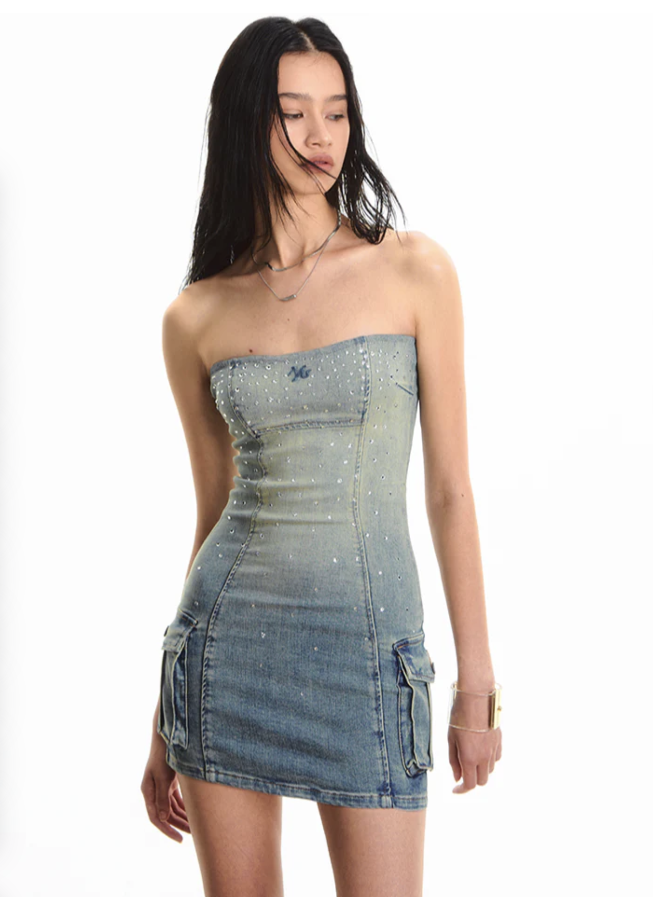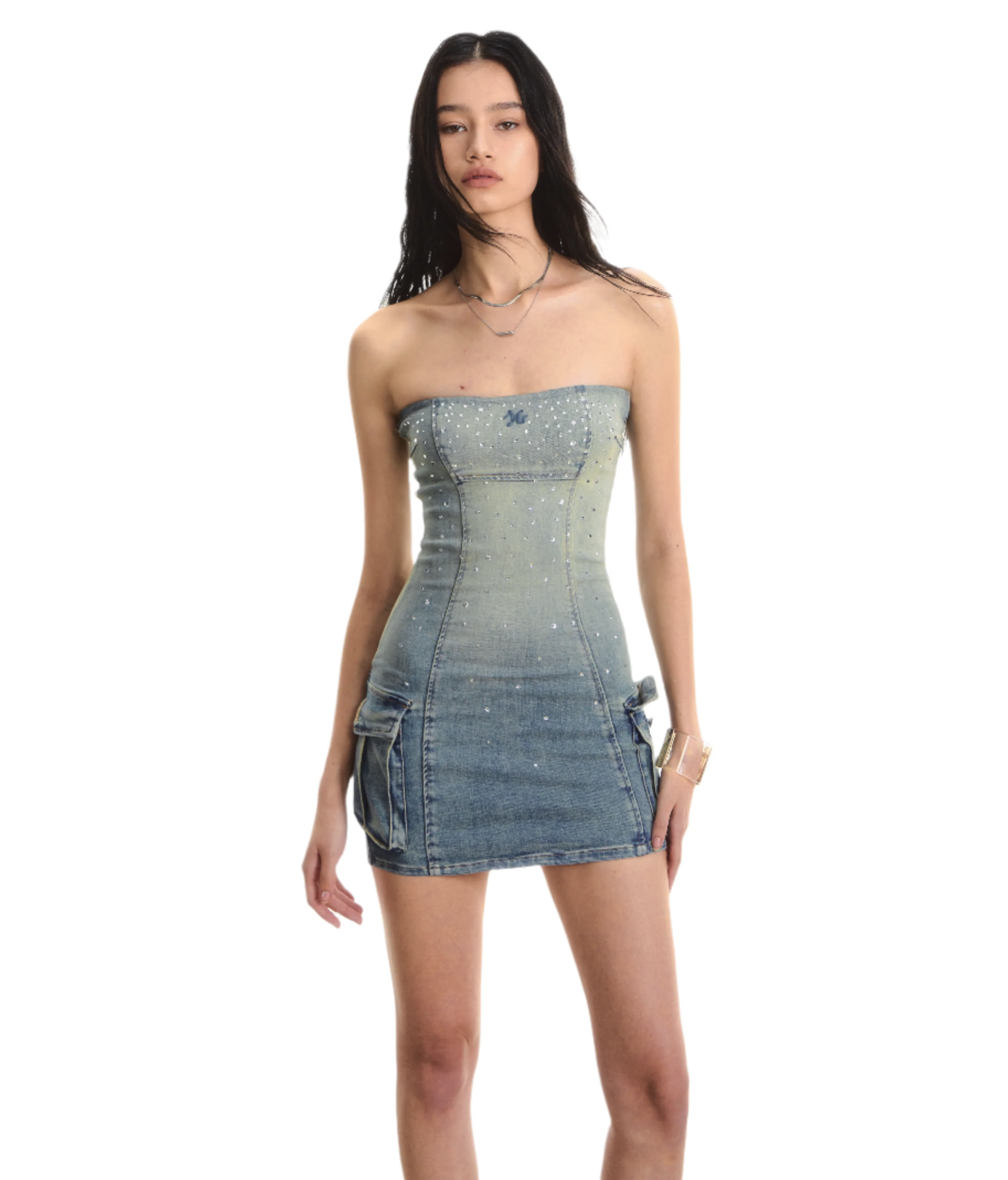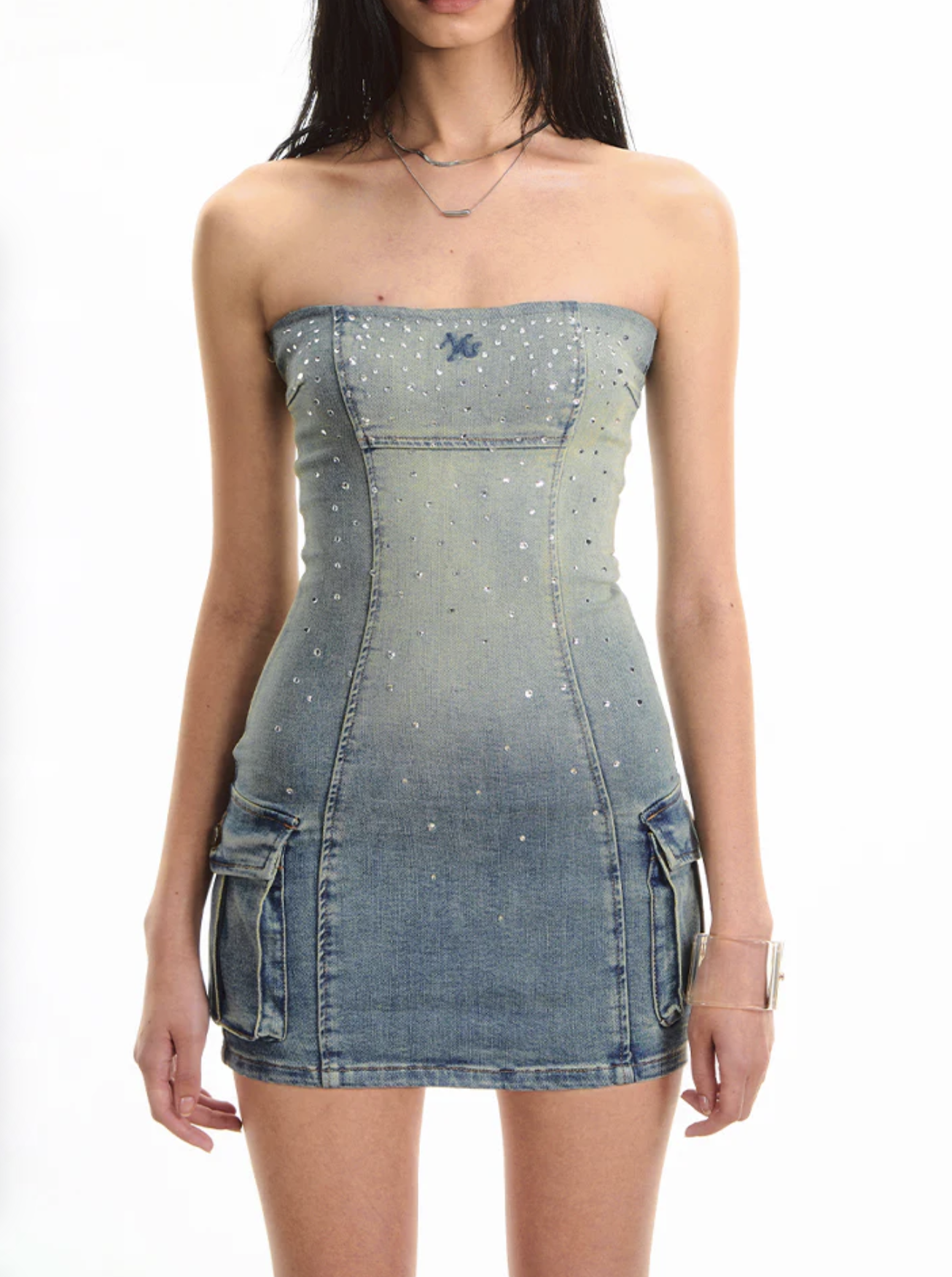 ✰ Crafted from cotton denim. This elegant strapless mini dress features a waist-cinching design with side pocket boxy, this dress offers a flattering fit that enhances your curves. Complete with all-over sparkling silver rhinestone embellishments on the front side for added flair.