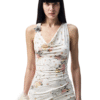 ✰ V-neck draped collar back knot strap vest from summer vacation floral series, with a body shaping and waist cinching fit, perfectly enhancing the body curve. The draped collar neckline refines the neck lines, and the hand knotted strap design on the back is flowing and lively, adding a sense of relaxation. Original designed prints create a rich visual effect, easily building a romantic summer atmosphere. Selected bamboo fiber like skin friendly fabric (actually 94% Viscose, 6% Spandex), with a delicate and soft hand – feel, excellent extensibility, strong wrapping, not easy to deform, and more comfortable for close fitting wear.