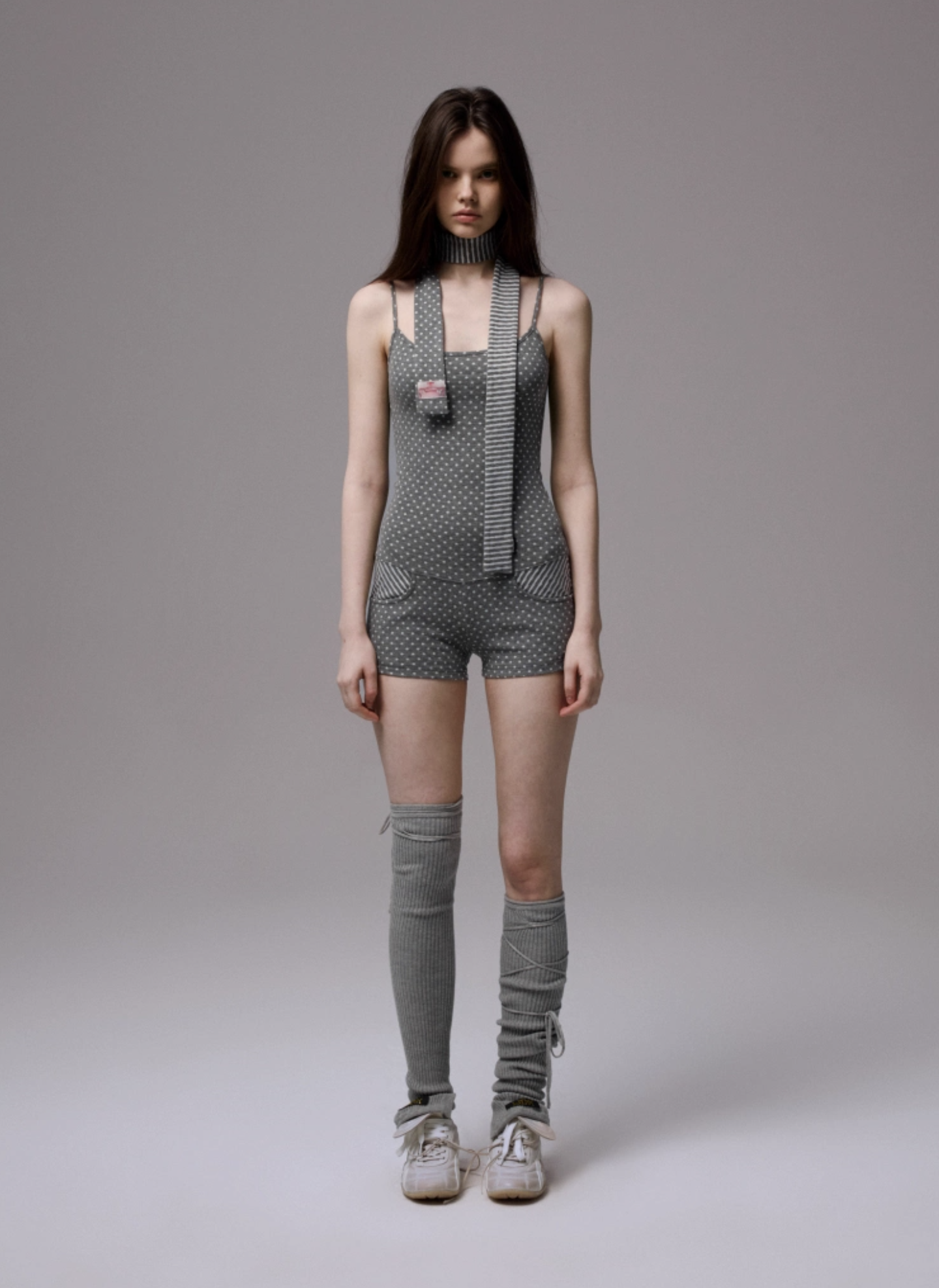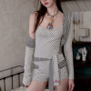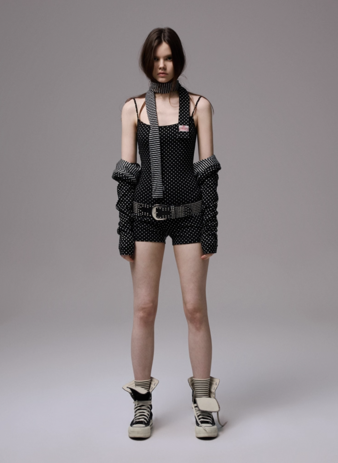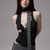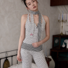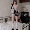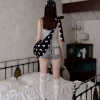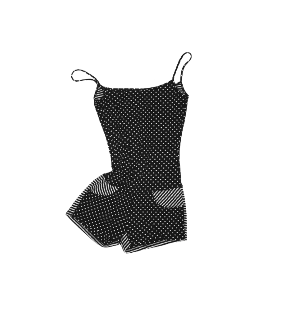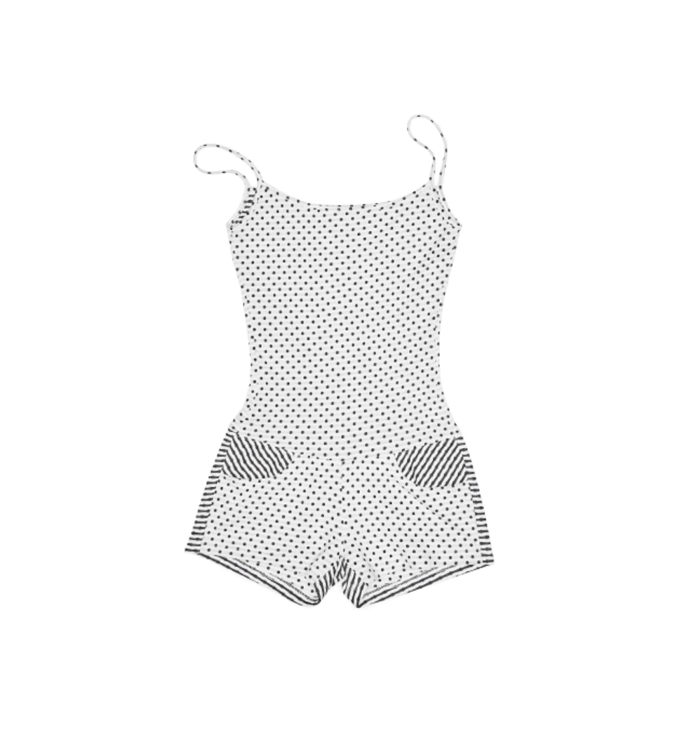 ✰ Polka dot stripe suspender jumpsuit, with a tight and waist – cinching fit, paired with a flat – angle short design. It perfectly shapes the body curves while providing a full sense of security, making it easy and comfortable to wear. The back features an exclusive custom cat tooth logo decoration, which is delicate and cute. Pair with polka dot stripe double sided small scarf, with a slender and narrow design.