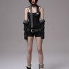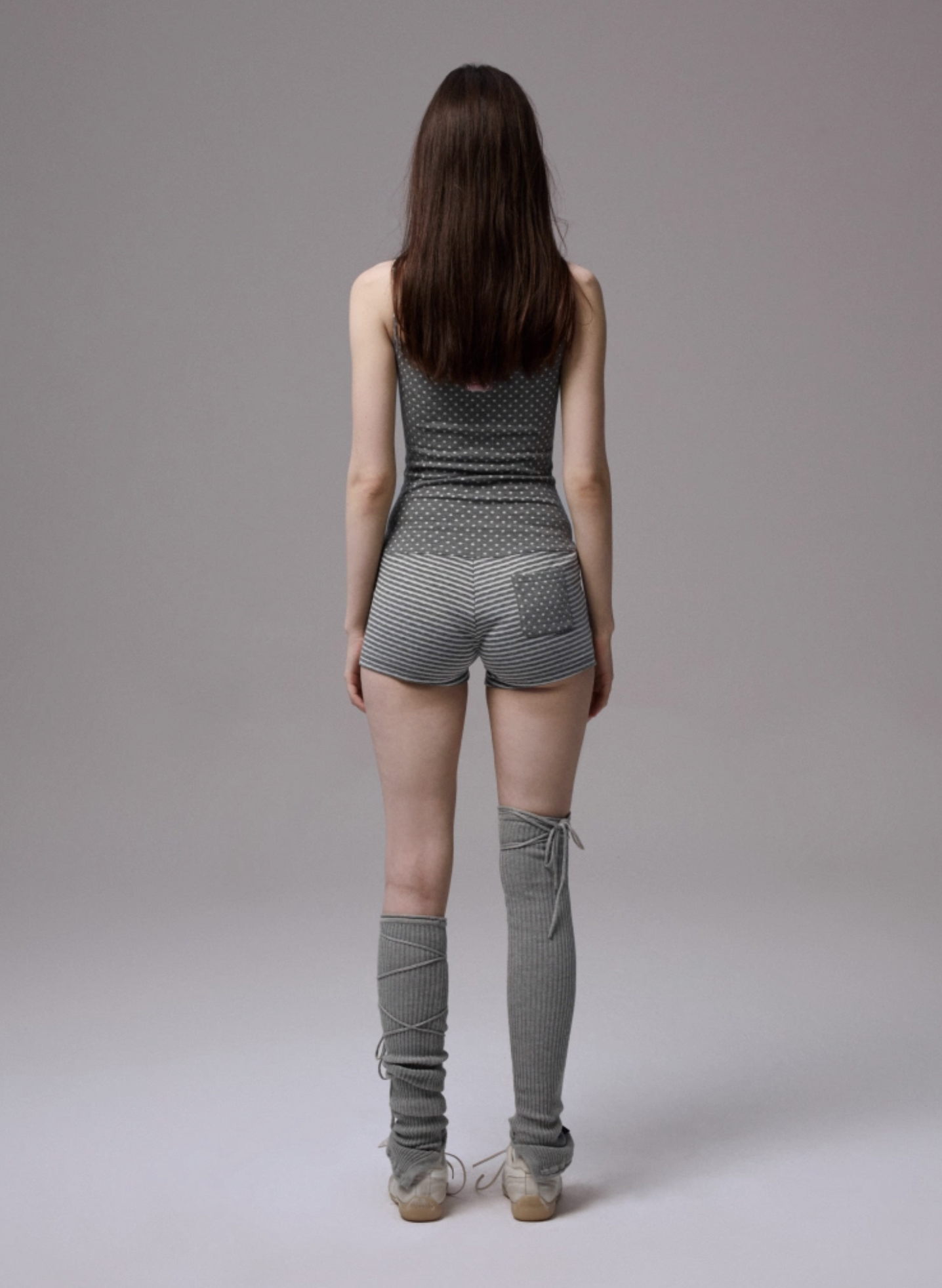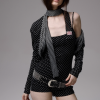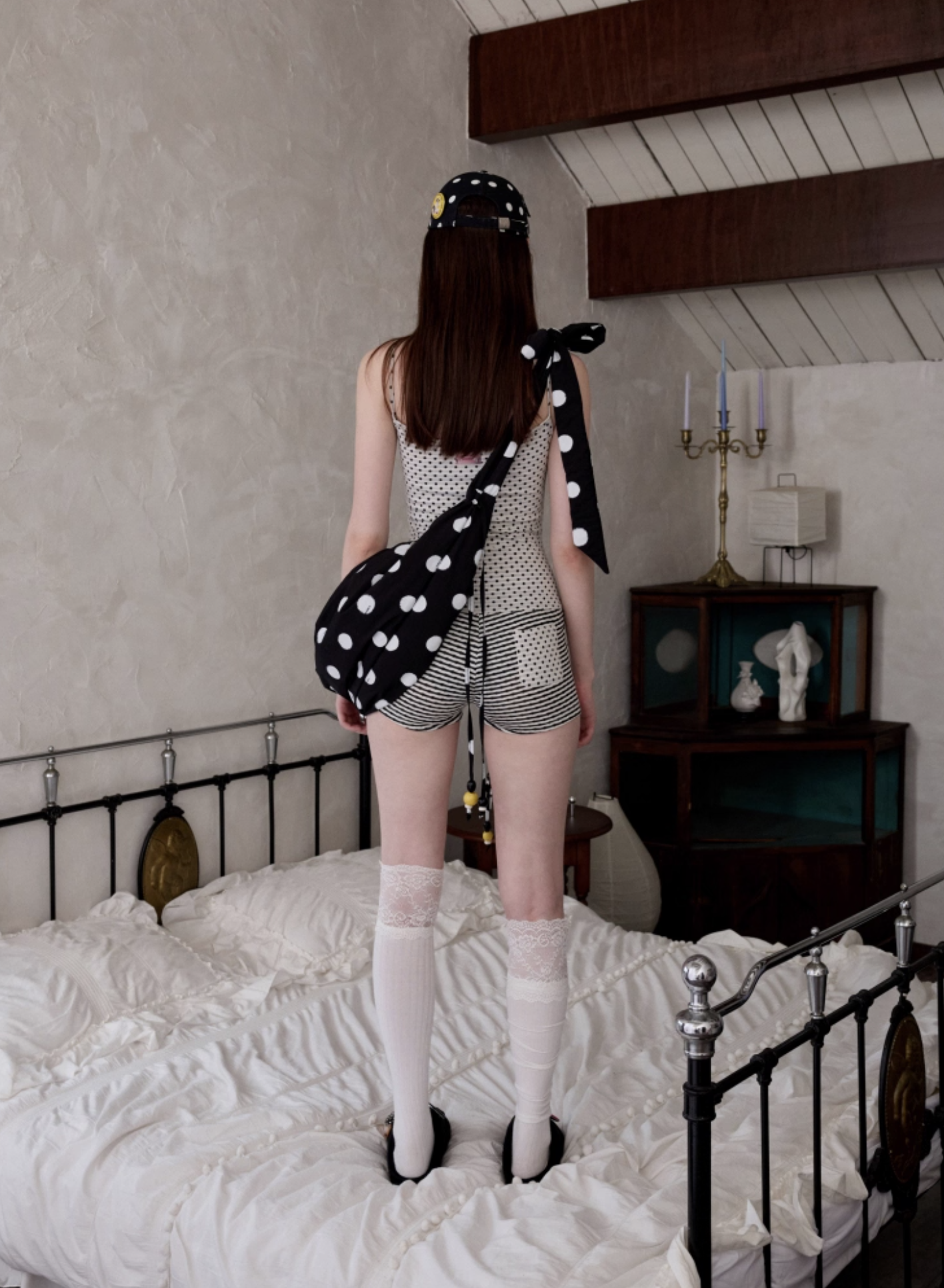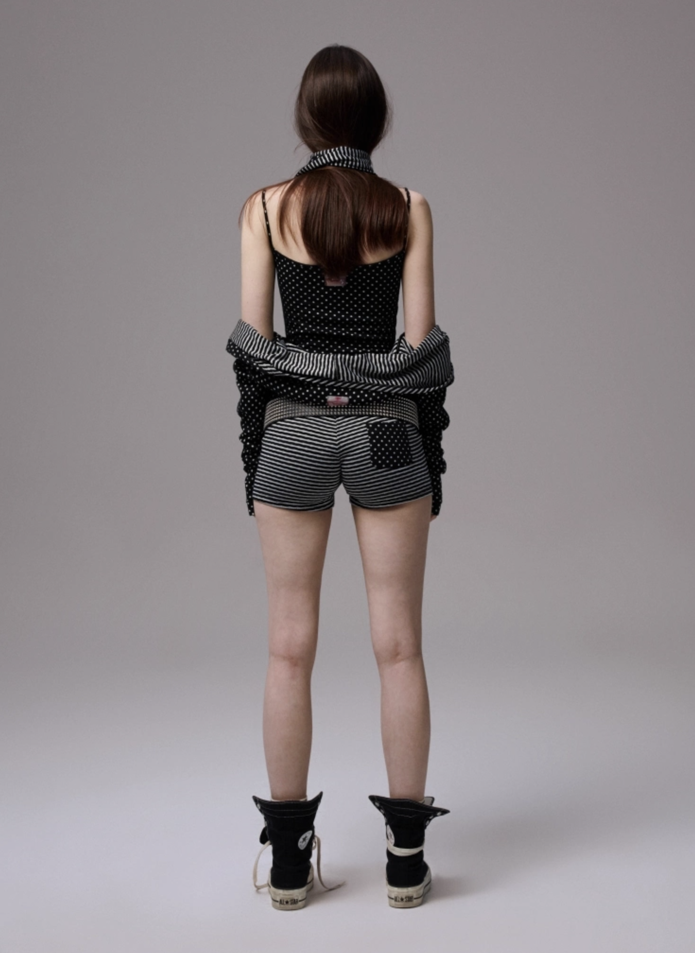 ✰ Polka dot stripe suspender jumpsuit, with a tight and waist – cinching fit, paired with a flat – angle short design. It perfectly shapes the body curves while providing a full sense of security, making it easy and comfortable to wear. The back features an exclusive custom cat tooth logo decoration, which is delicate and cute. Pair with polka dot stripe double sided small scarf, with a slender and narrow design.