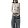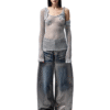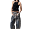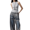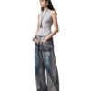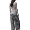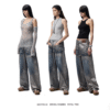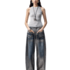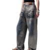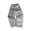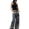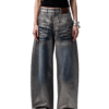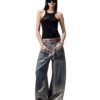 ✰ These vintage silver-foil metallic washed curved blade wide-leg jeans feature a mid-to-low waist design and hand-dyed for a natural vintage effect. The back pocket design is functional. Made with high-quality denim.