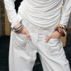 ✰ These vintage washed white wide-leg jeans feature a mid-to-low waist design and hand-dyed for a natural vintage effect. The misaligned construction and heavy embroidery accents create a retro yet chic vibe. The back pocket design is functional. Made with high-quality denim.