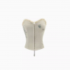 ✰ Manuri black corset top panelling sweetheart neck. Featuring custom Font text artwork in contrast white on wearer’s right and left chest, back tie fastening strapless sleeveless pointed hem, frayed trim, Hook and eye front entry