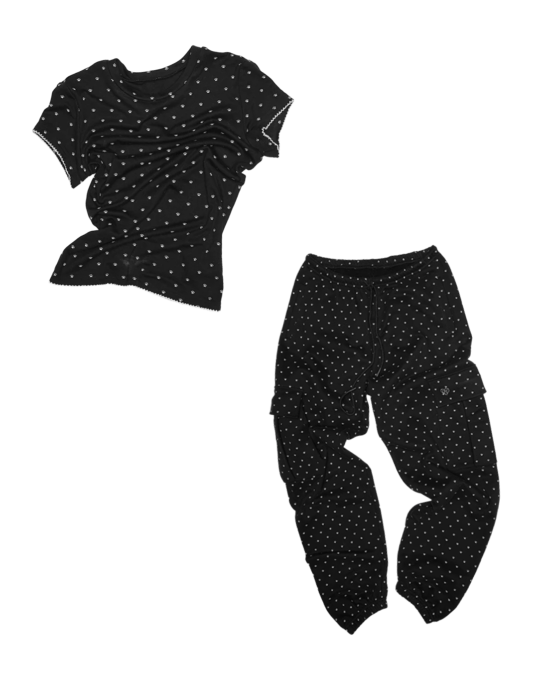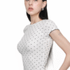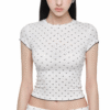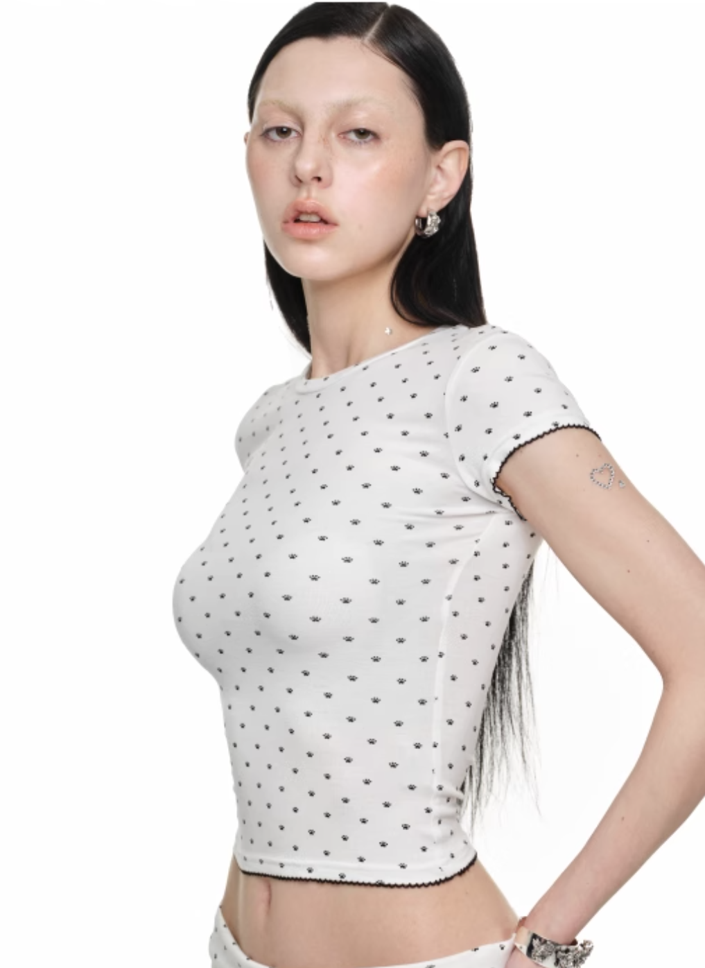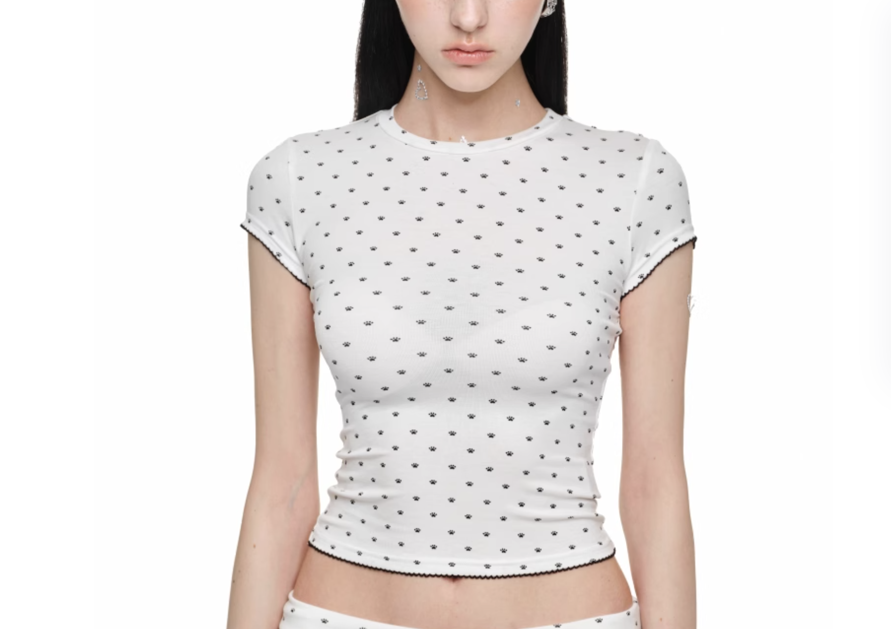 These T-shirt features a recurring playful cat paw print and CAT BLESS YOU mitation rhinestone graphic detail at back, and scoop neckline, and a regular length, while the scalloped hem provides an extra dose of elegance. JING’s selection of viscose-nylon blend technology ensures a cool and breathable feel.