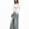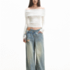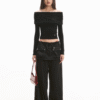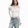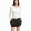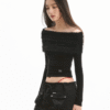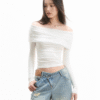 ✰ This T-shirt features a beautiful lace-trimmed off-shoulder design. The shirt is fitted with elastic band detailing at the bottom for a comfortable fit. The shoulder area is designed with lace patches, which enhances the aesthetic appeal while providing flexibility and comfort. The carefully crafted waistband also features elastic gathering, making the shirt easy to wear and remove. It’s a stylish yet practical choice for casual wear.