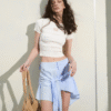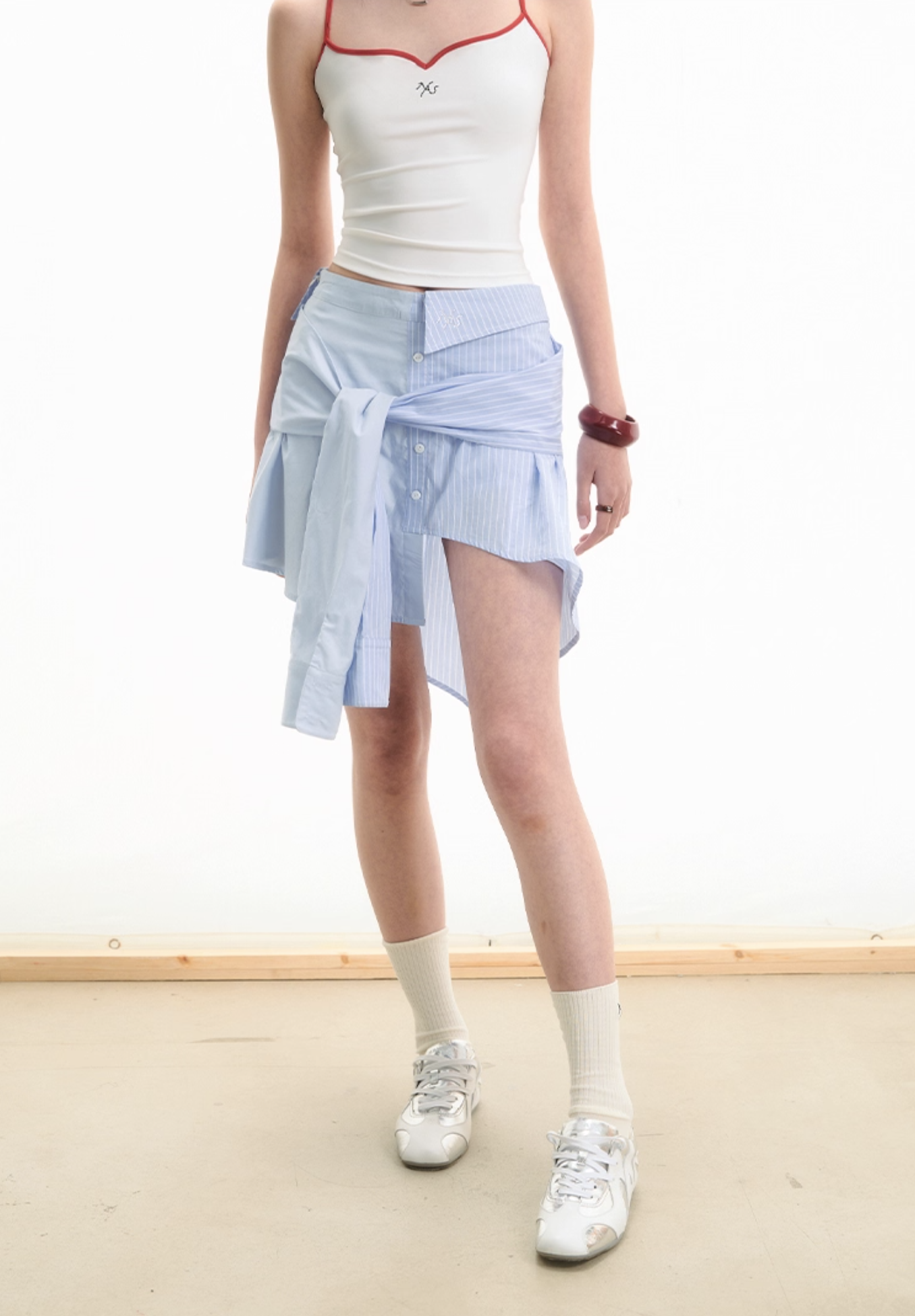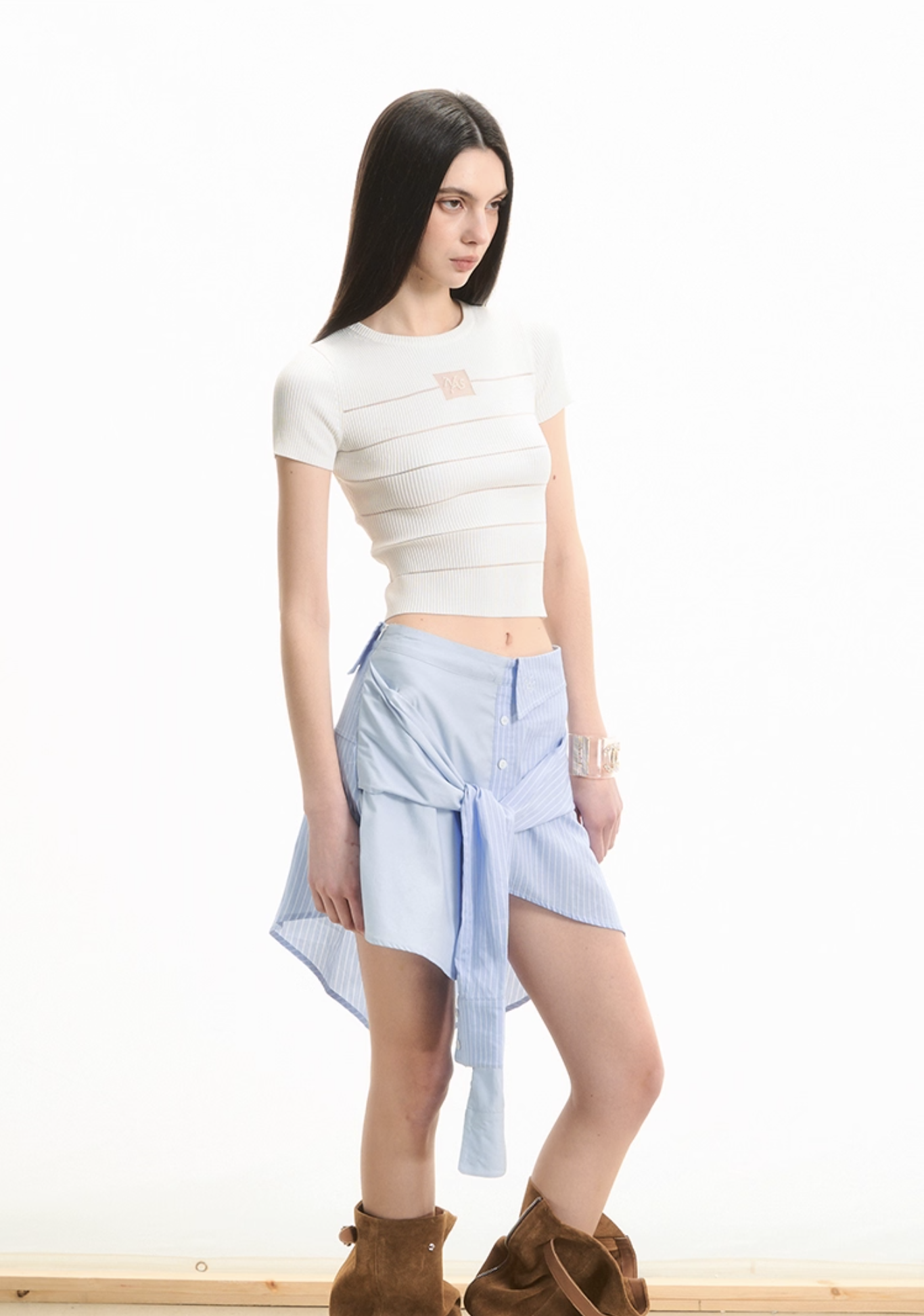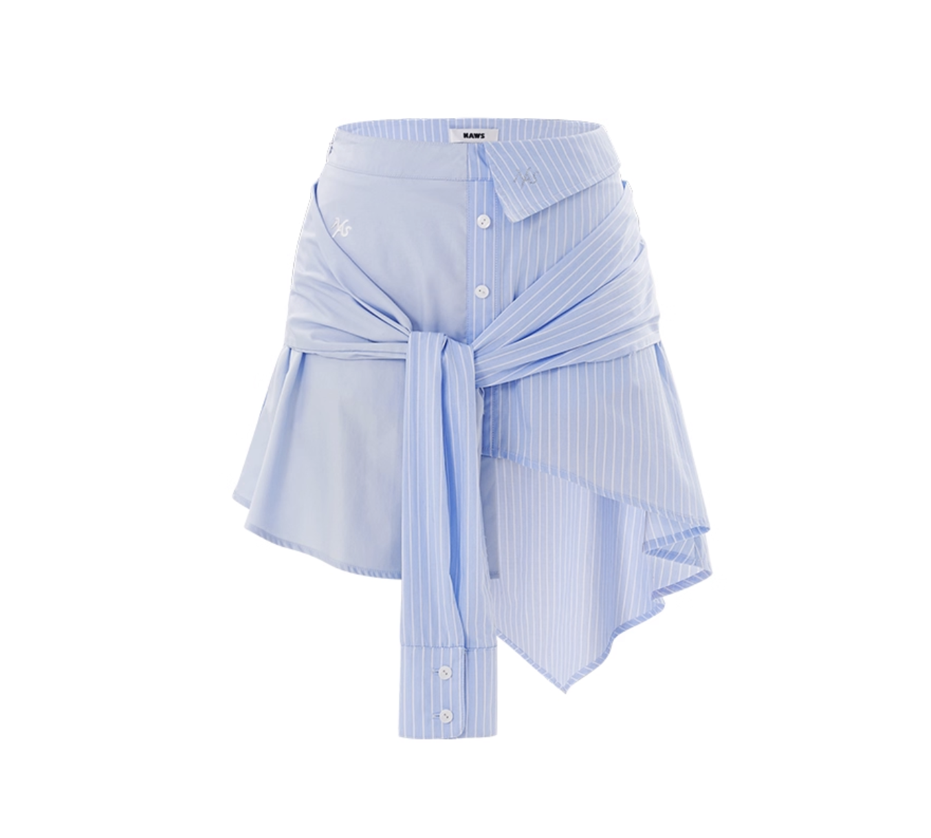 ✰ The skirt features a tie design that adds a unique touch. It is perfect for mixing and matching with various styles, especially for those who enjoy contemporary and chic outfits. The quality of the fabric is soft, with a special lustrous sheen. The logo is engraved with a unique pearl-like finish, reflecting the brand’s attention to detail.