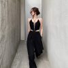 Sleeveless corset-style crochet top featuring a lace up detail at centre front that extends over shoulders. Side straps extend to halter neck tie. Fabricated from a dense crochet knit with a slight stretch. Featuring a v neckline & boning through bodice for structure. Detailed with a ribbed panel at back for pull over entry.