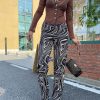 Groovy. These pants feature a high waisted, Hook and Bar Closure, flared silhouette, Printed design throughout. Style yours with the matching fitted crop top and chunky biker boot.